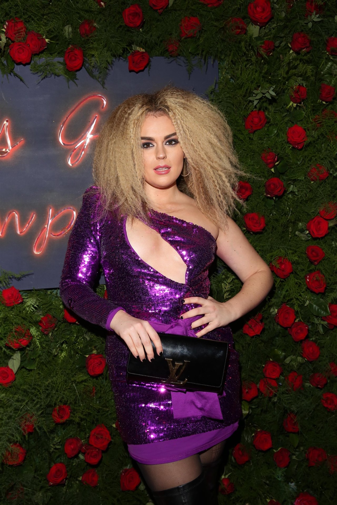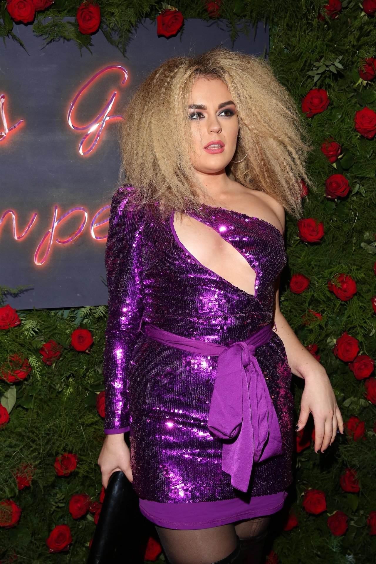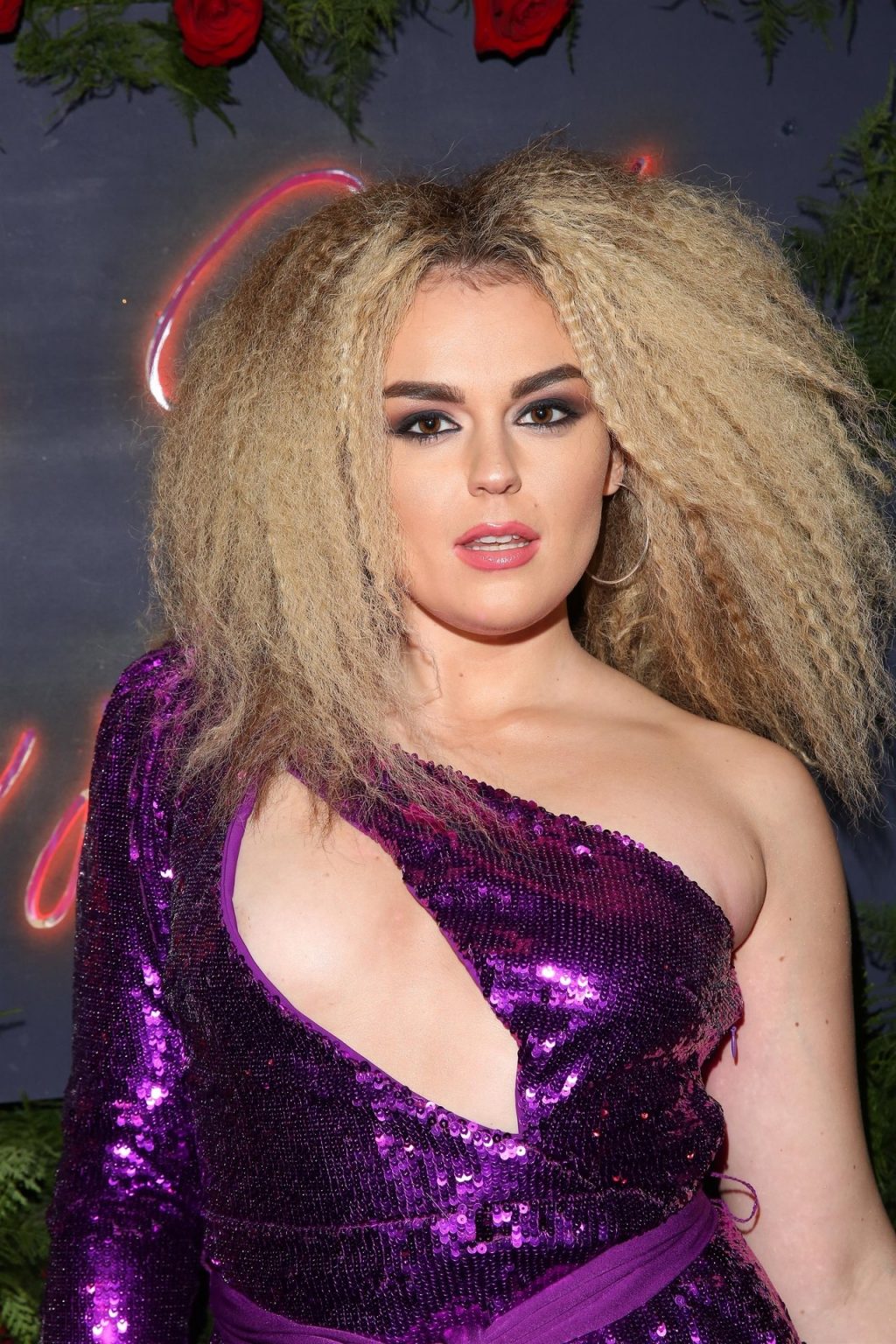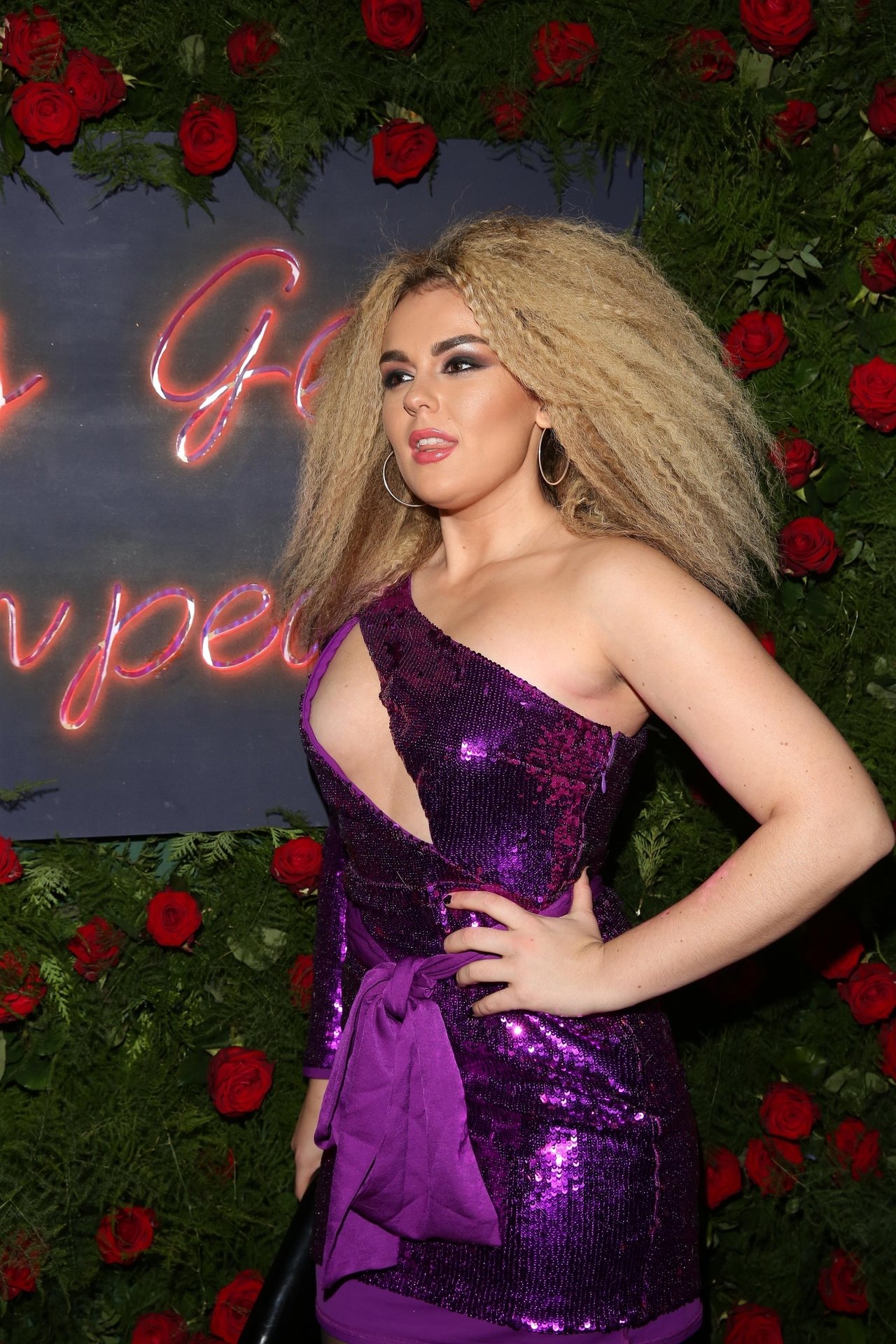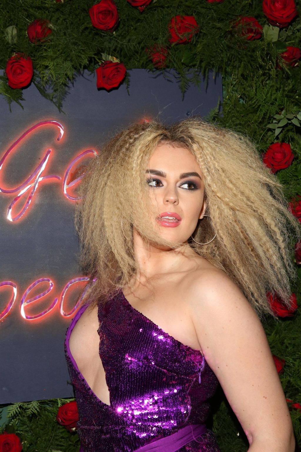 La chanteuse Tallia Storm a exhibé sa poitrine, portant une robe violette avec un décolleté lors de la fête du 50e anniversaire du club Tramp à Londres, le 17/12/2019.