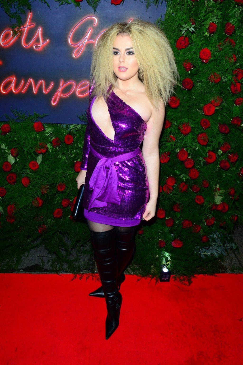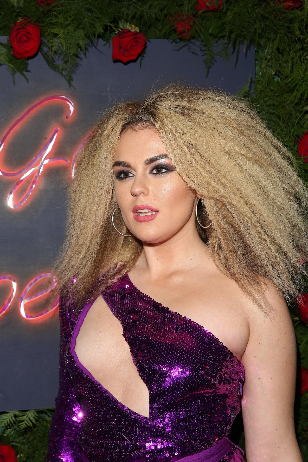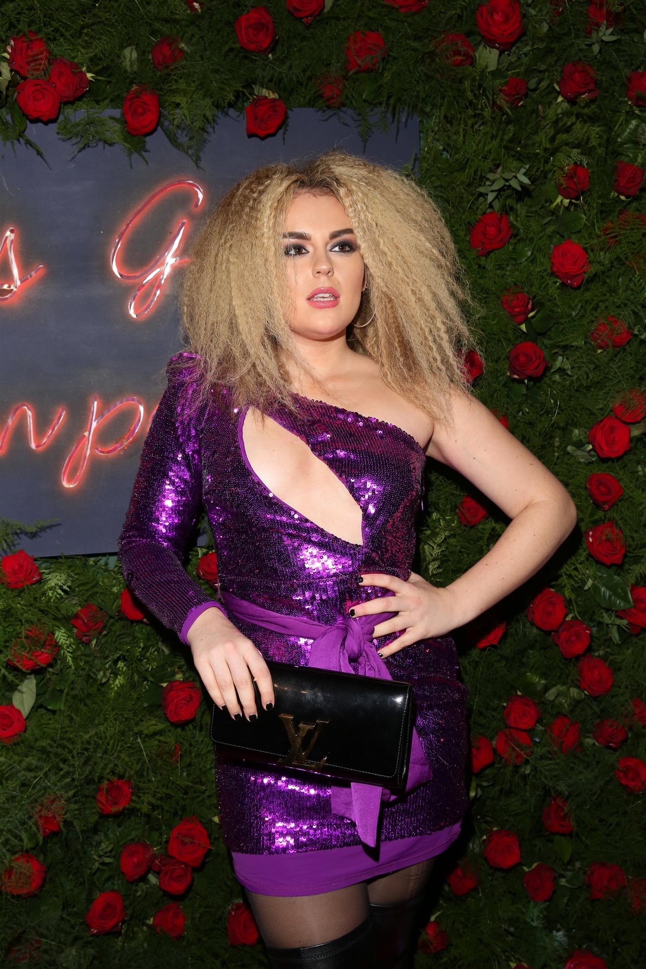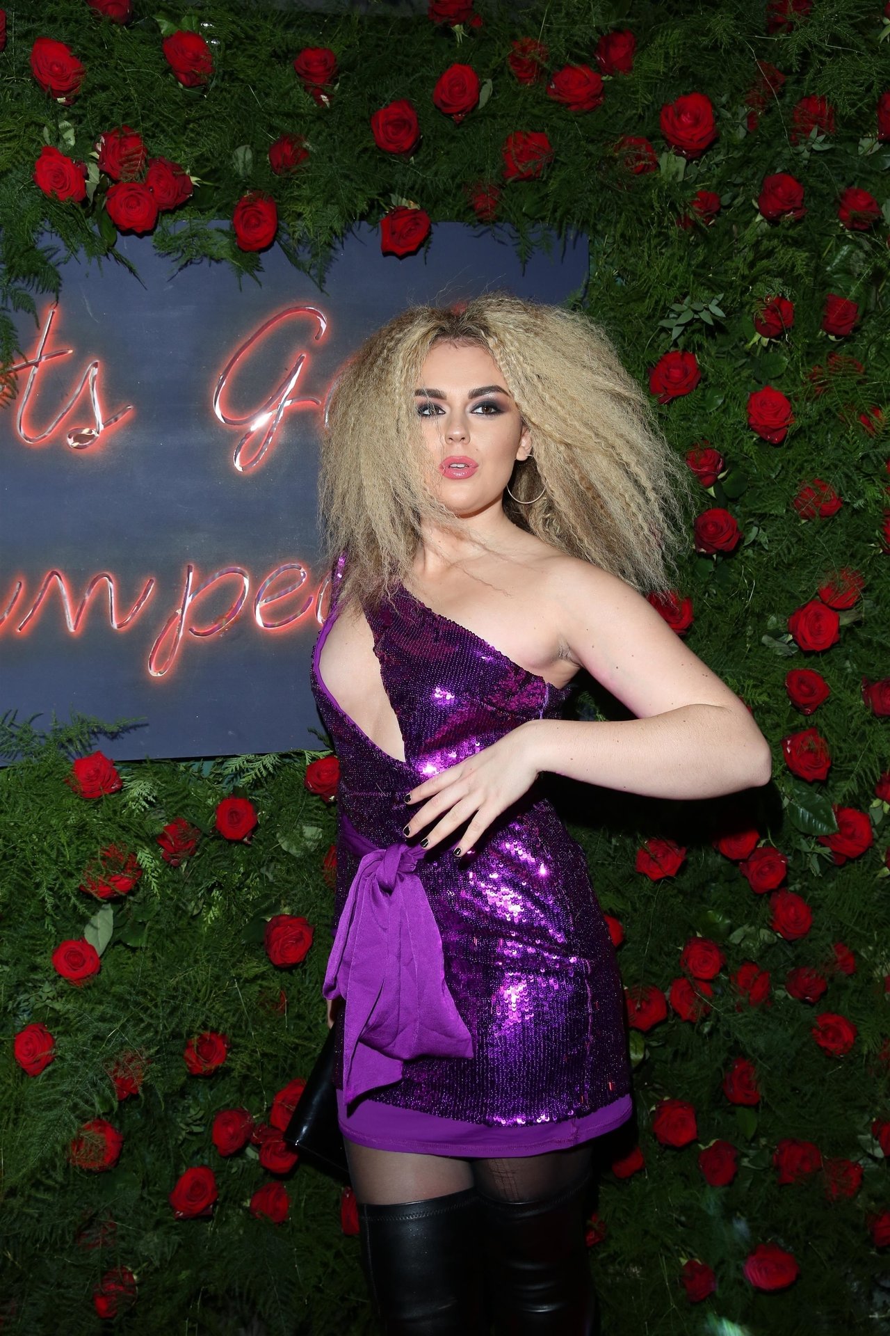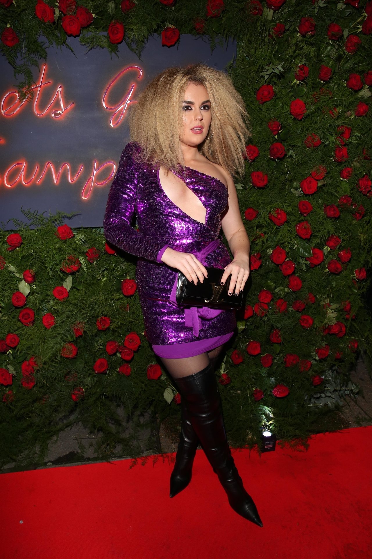 La chanteuse Tallia Storm a exhibé sa poitrine, portant une robe violette avec un décolleté lors de la fête du 50e anniversaire du club Tramp à Londres, le 17/12/2019.