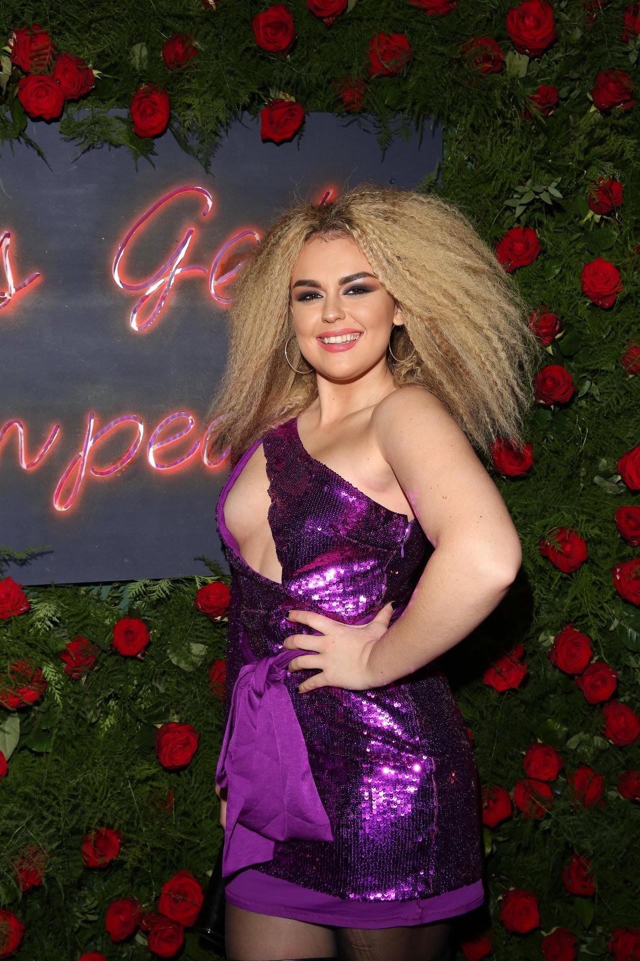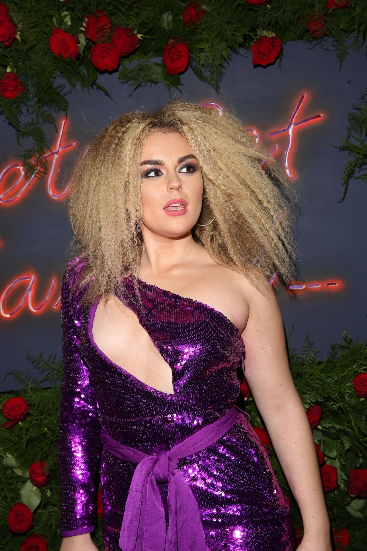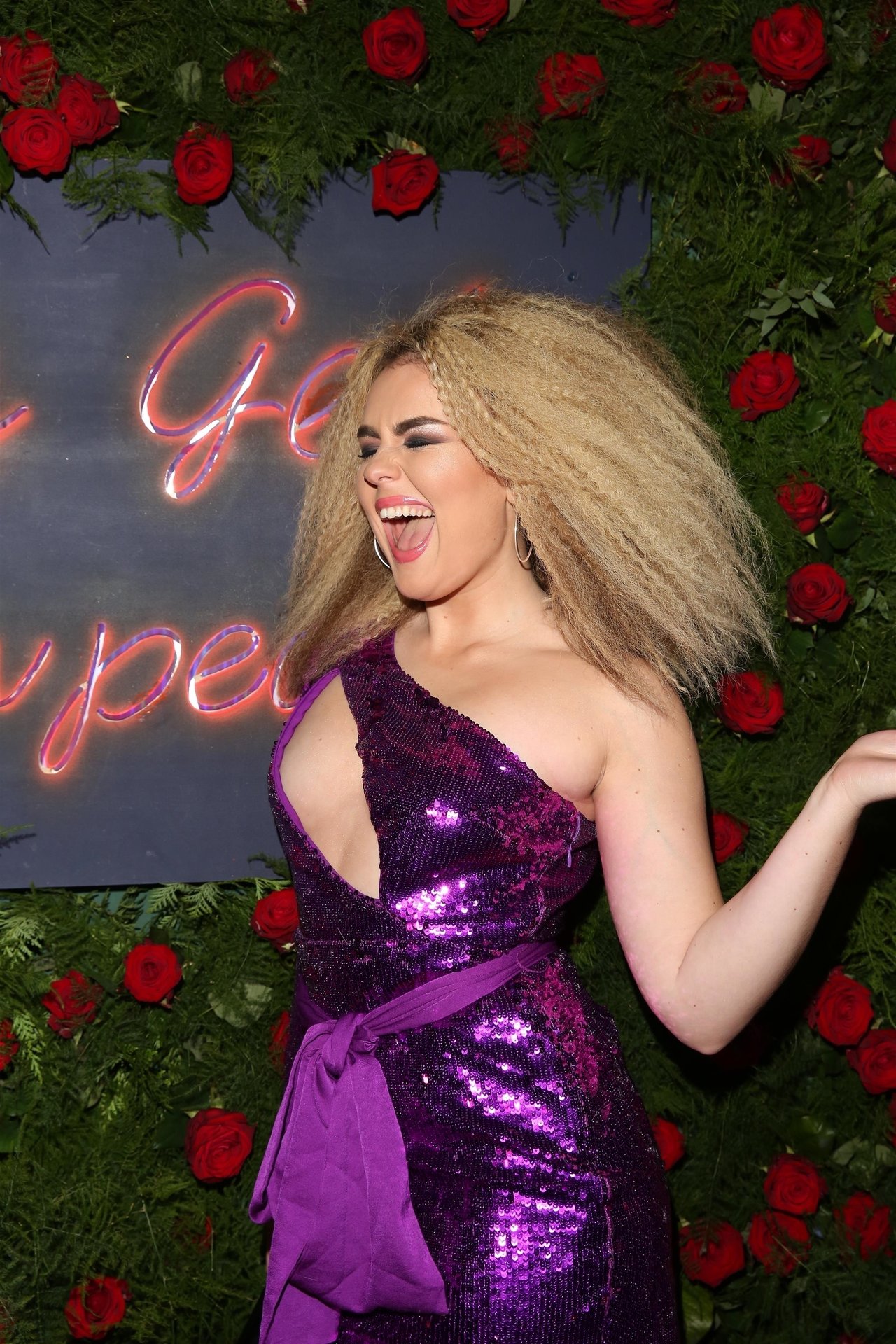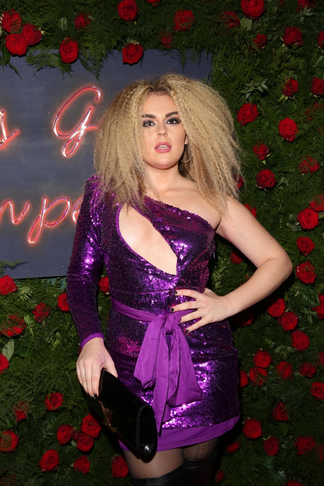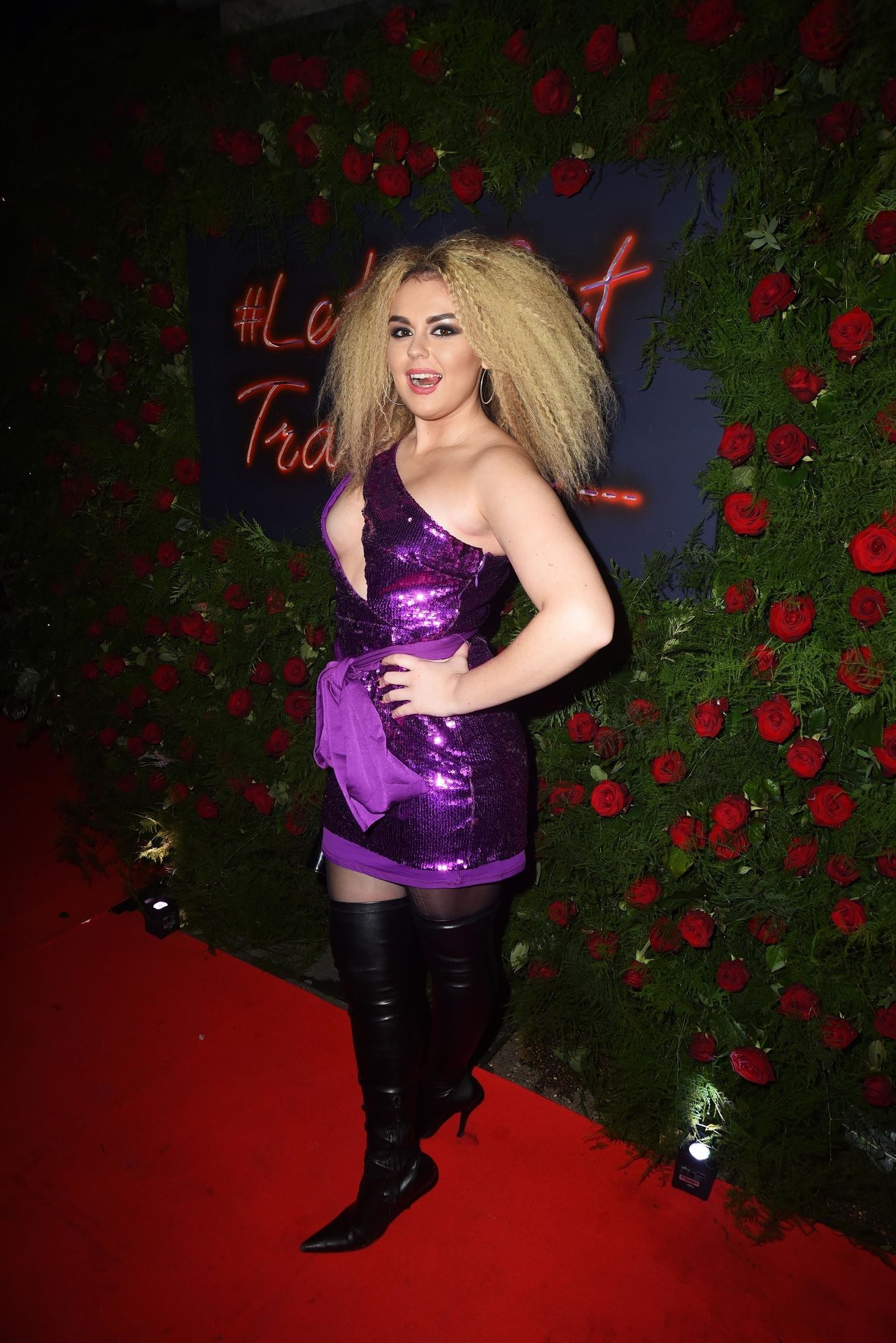 La chanteuse Tallia Storm a exhibé sa poitrine, portant une robe violette avec un décolleté lors de la fête du 50e anniversaire du club Tramp à Londres, le 17/12/2019.