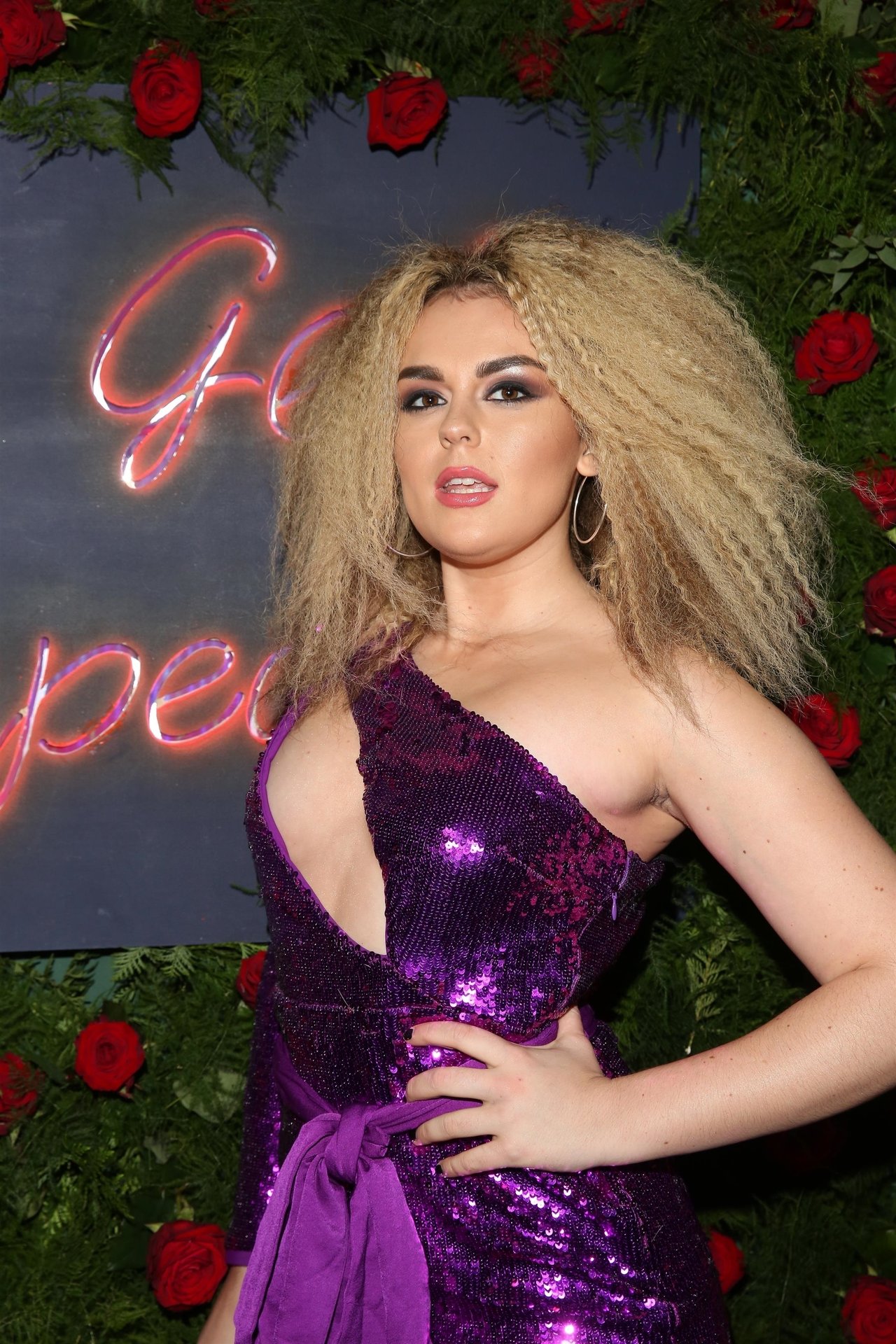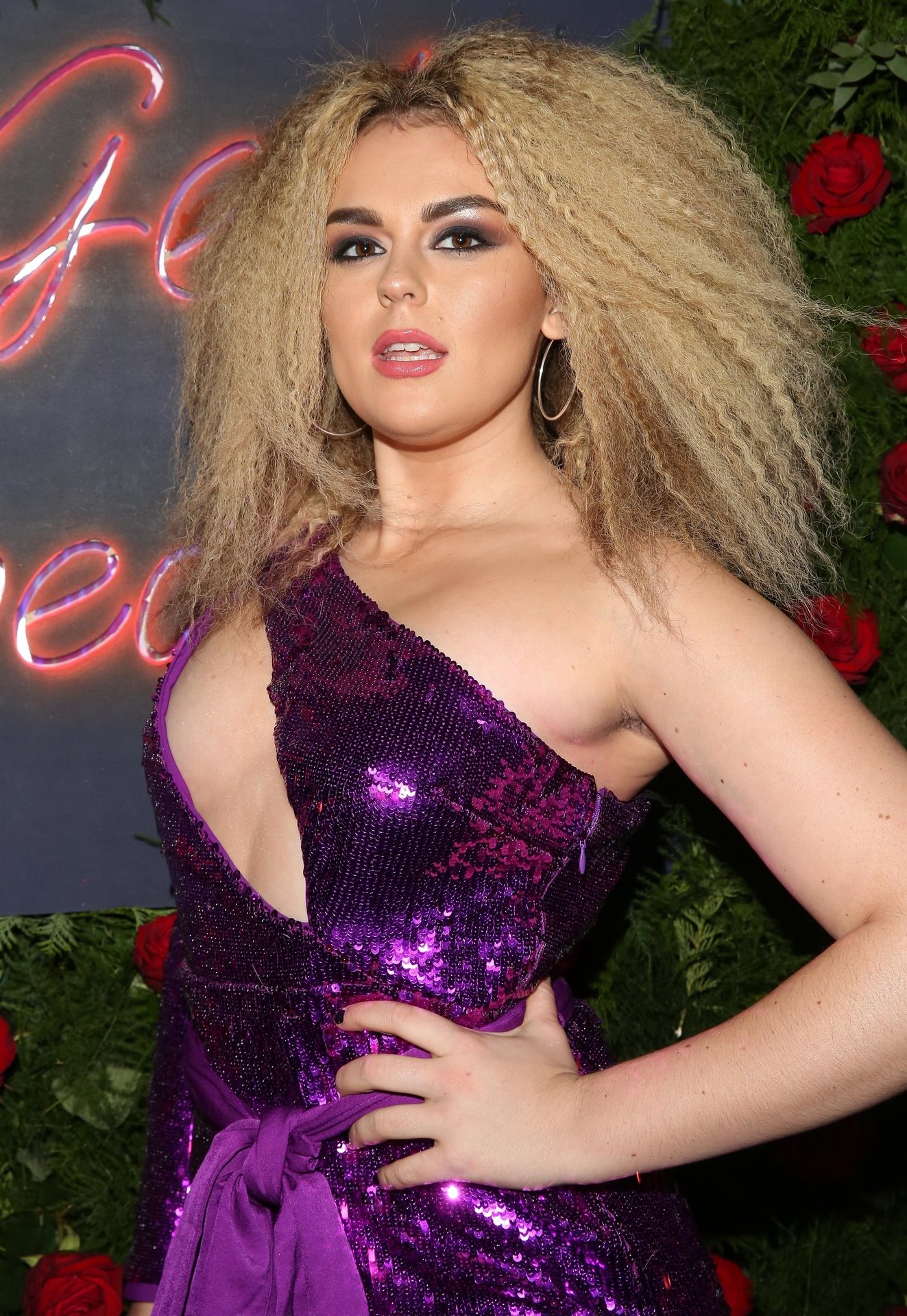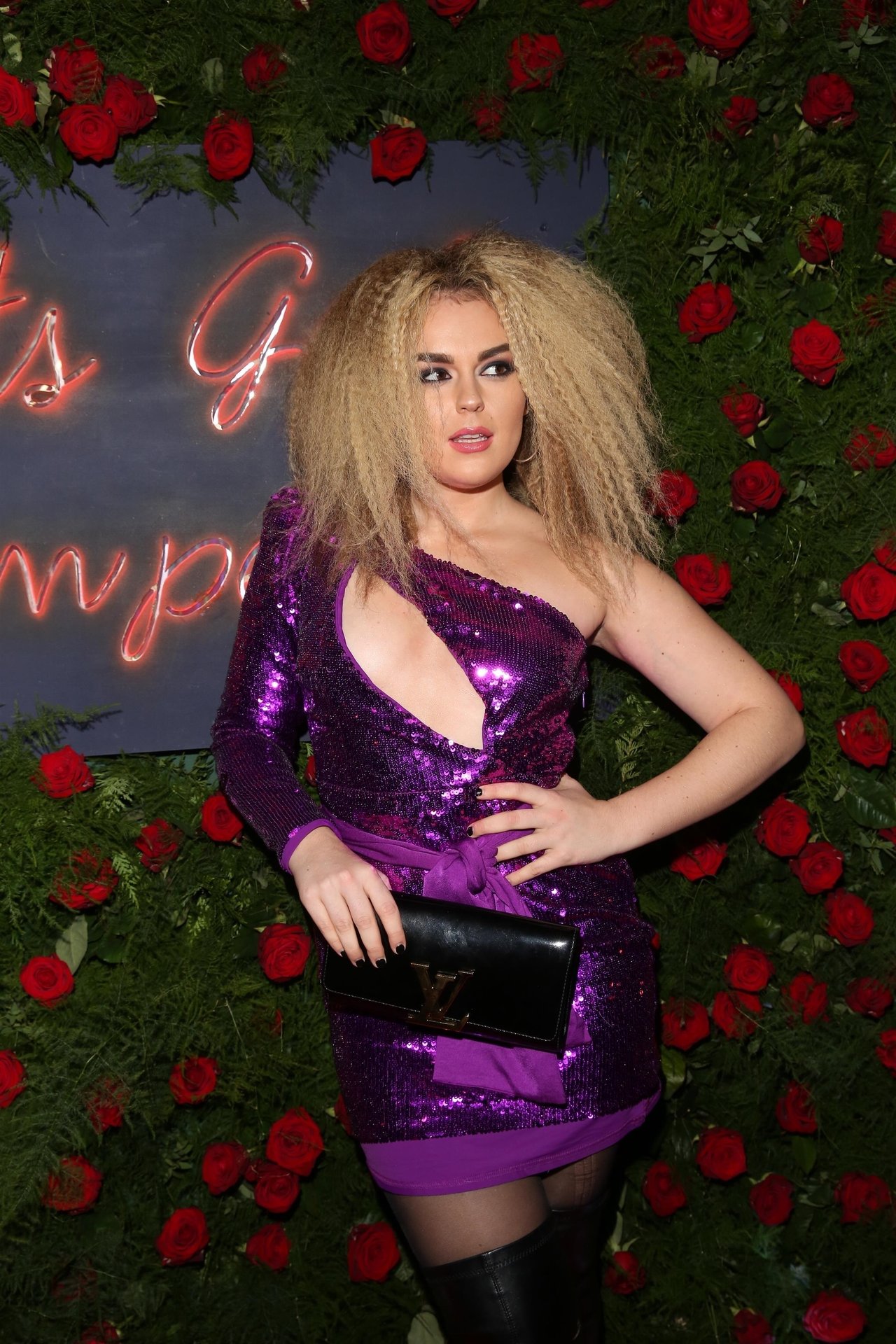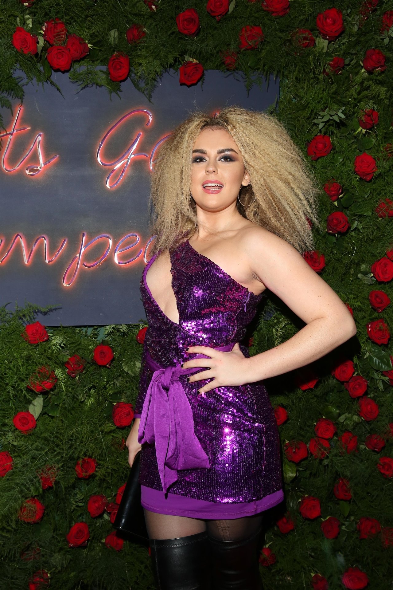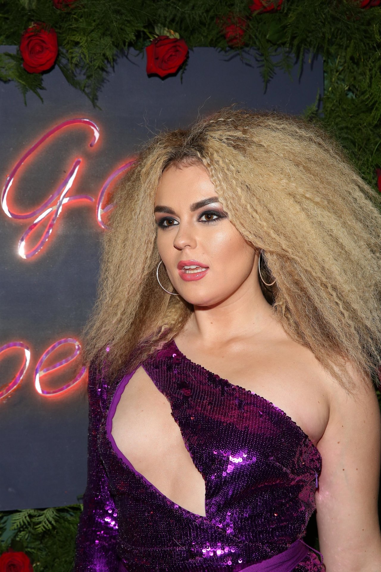 La chanteuse Tallia Storm a exhibé sa poitrine, portant une robe violette avec un décolleté lors de la fête du 50e anniversaire du club Tramp à Londres, le 17/12/2019.