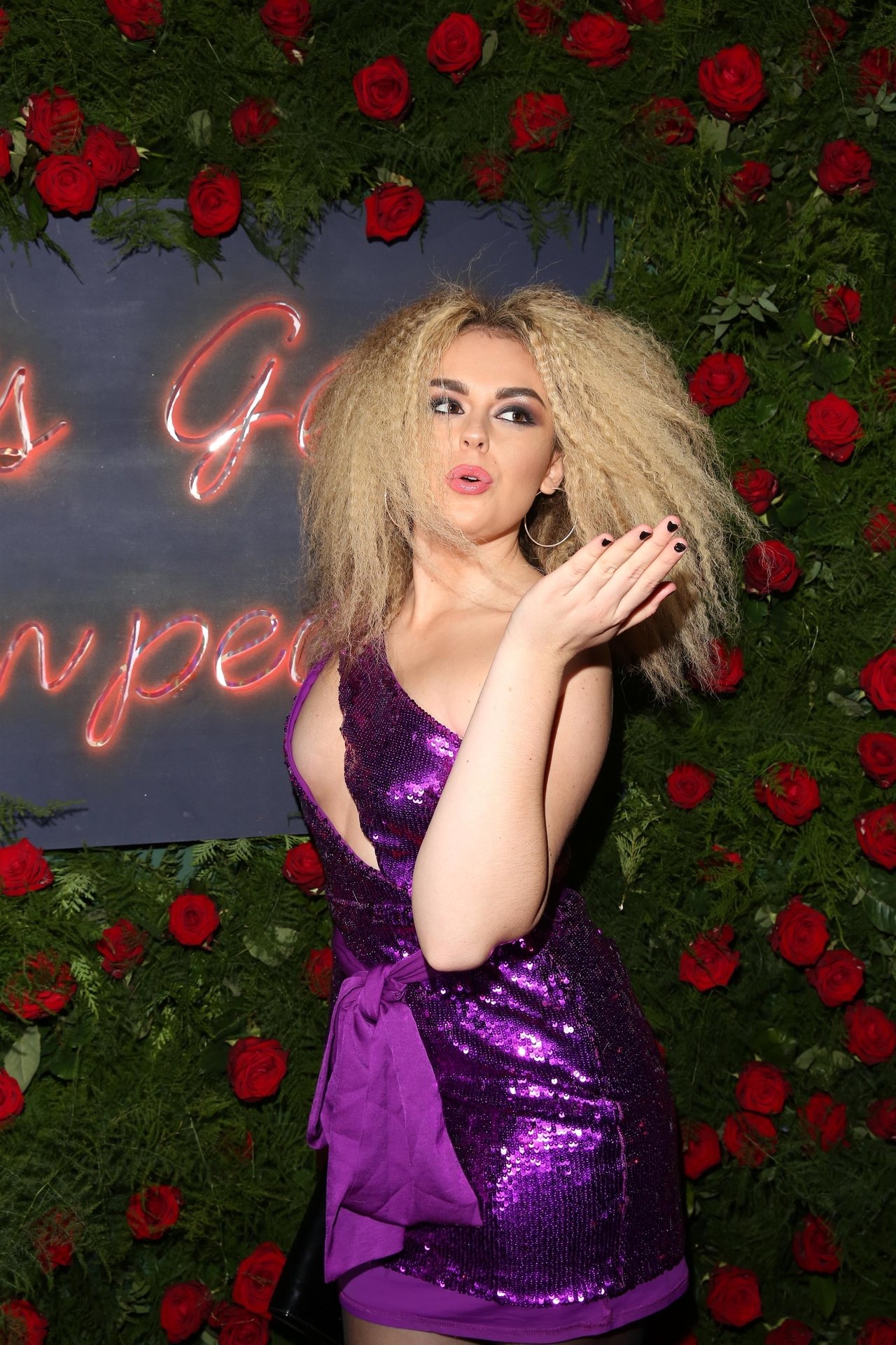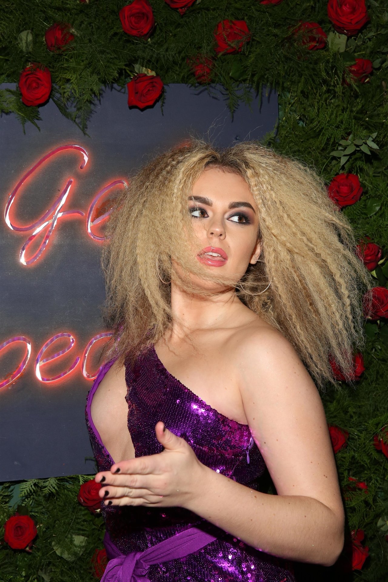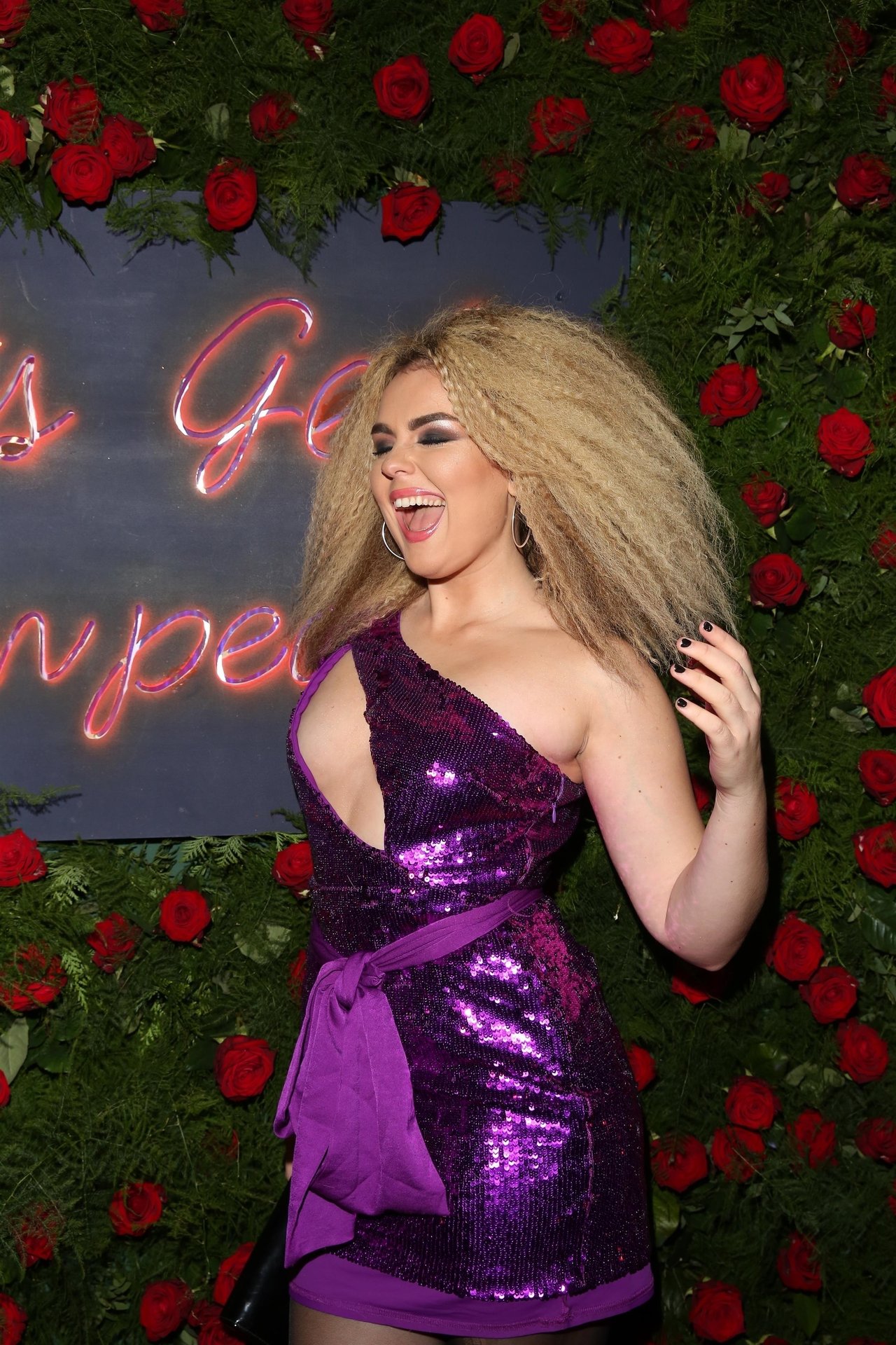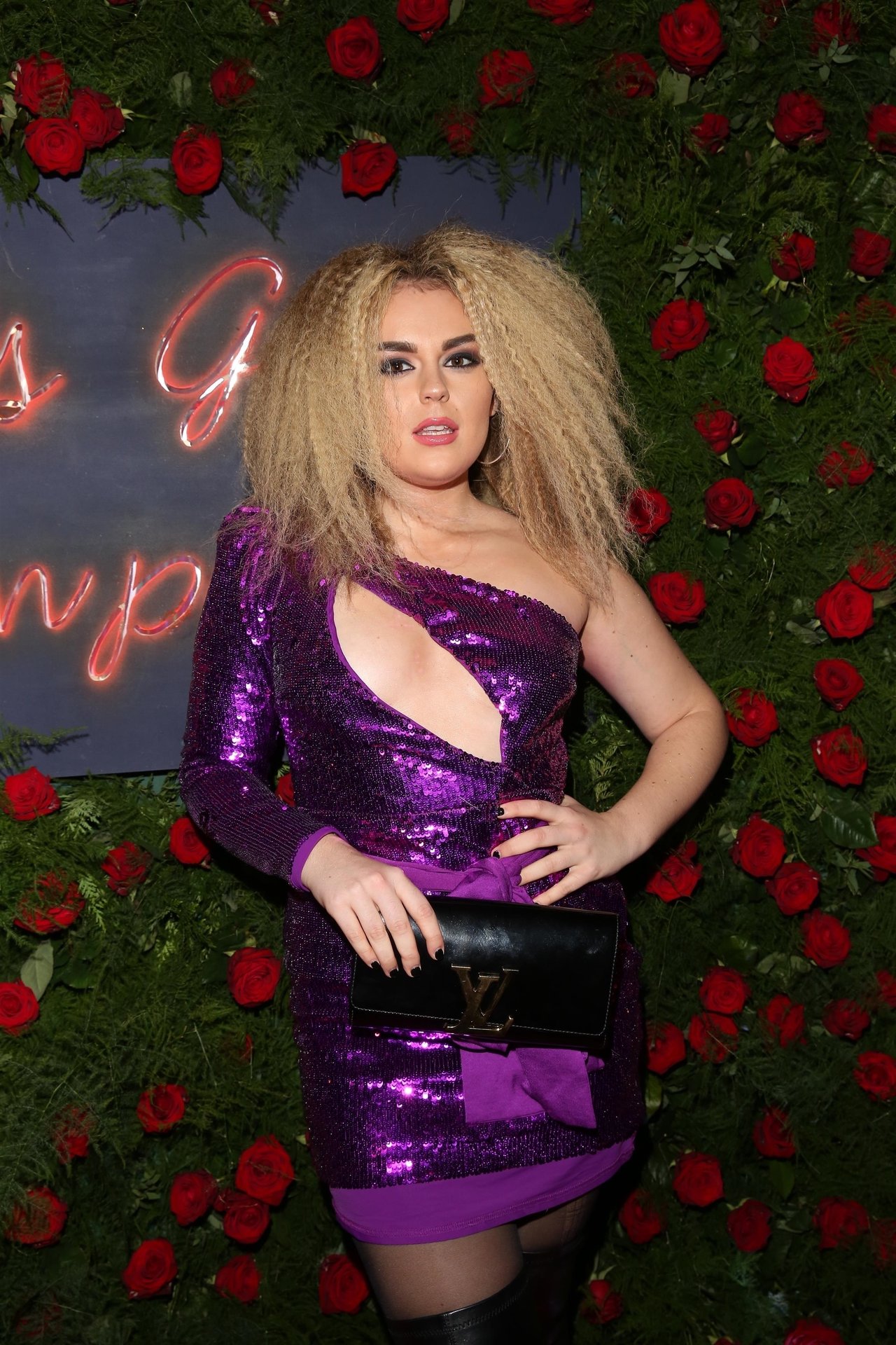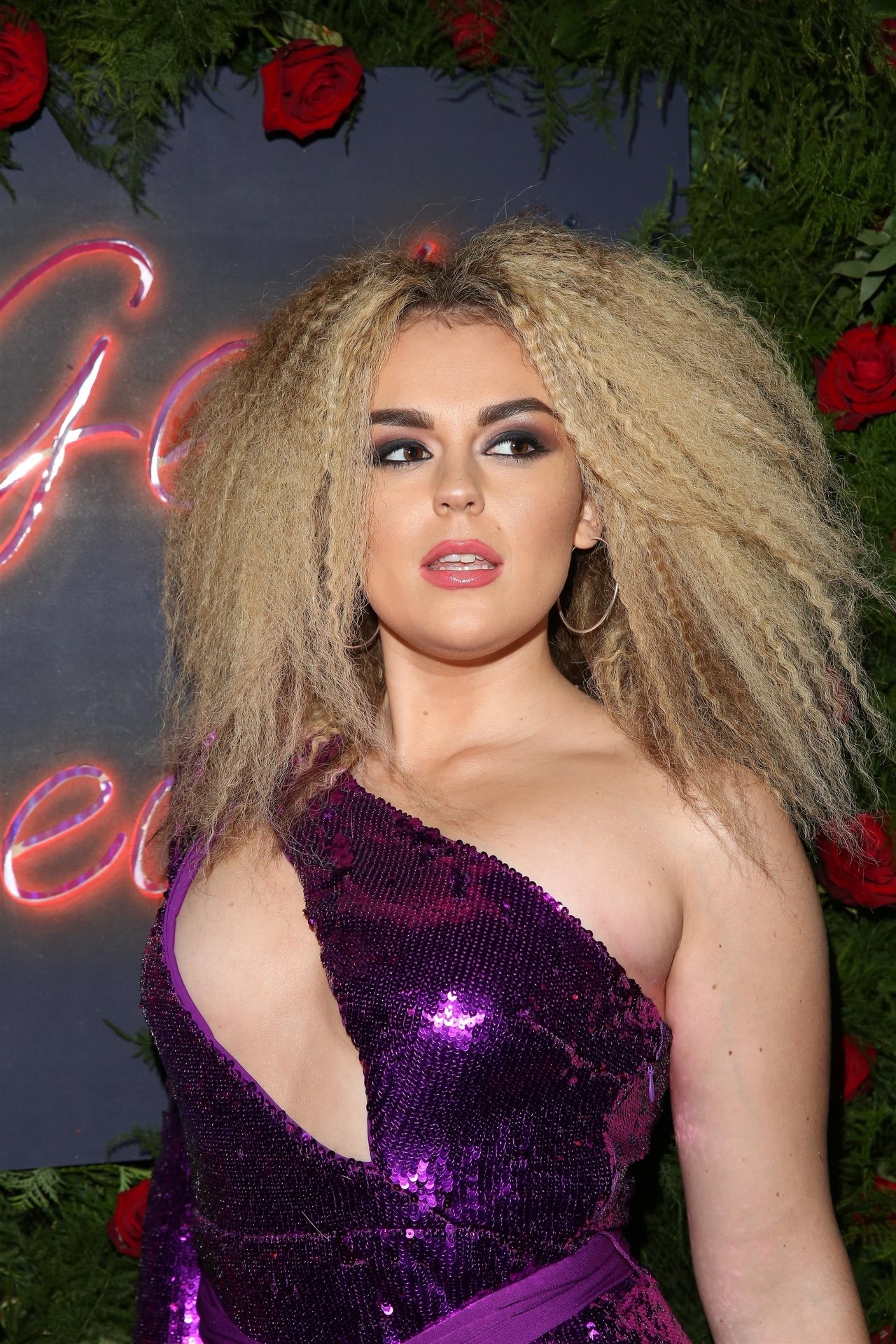 La chanteuse Tallia Storm a exhibé sa poitrine, portant une robe violette avec un décolleté lors de la fête du 50e anniversaire du club Tramp à Londres, le 17/12/2019.
