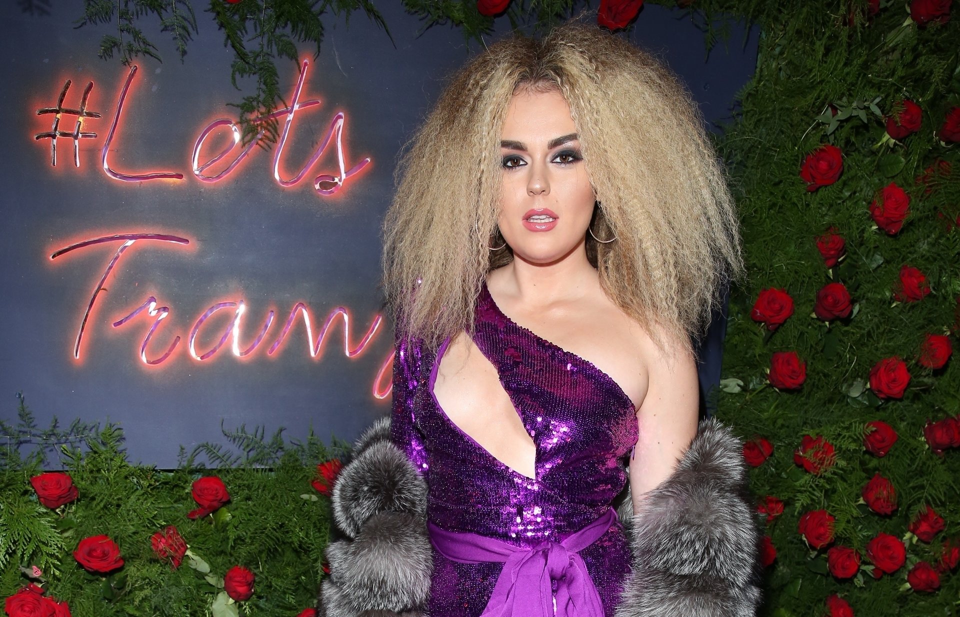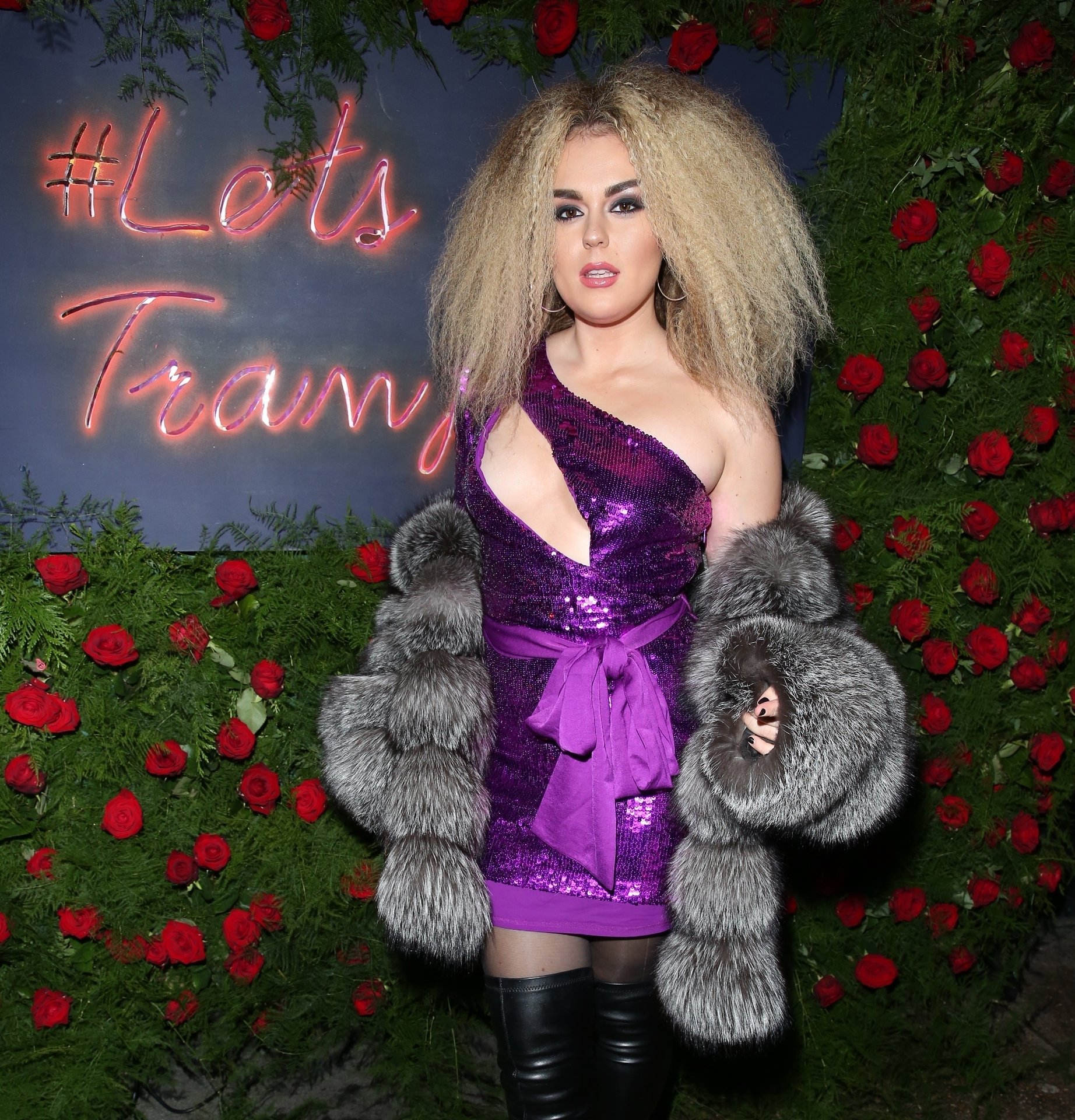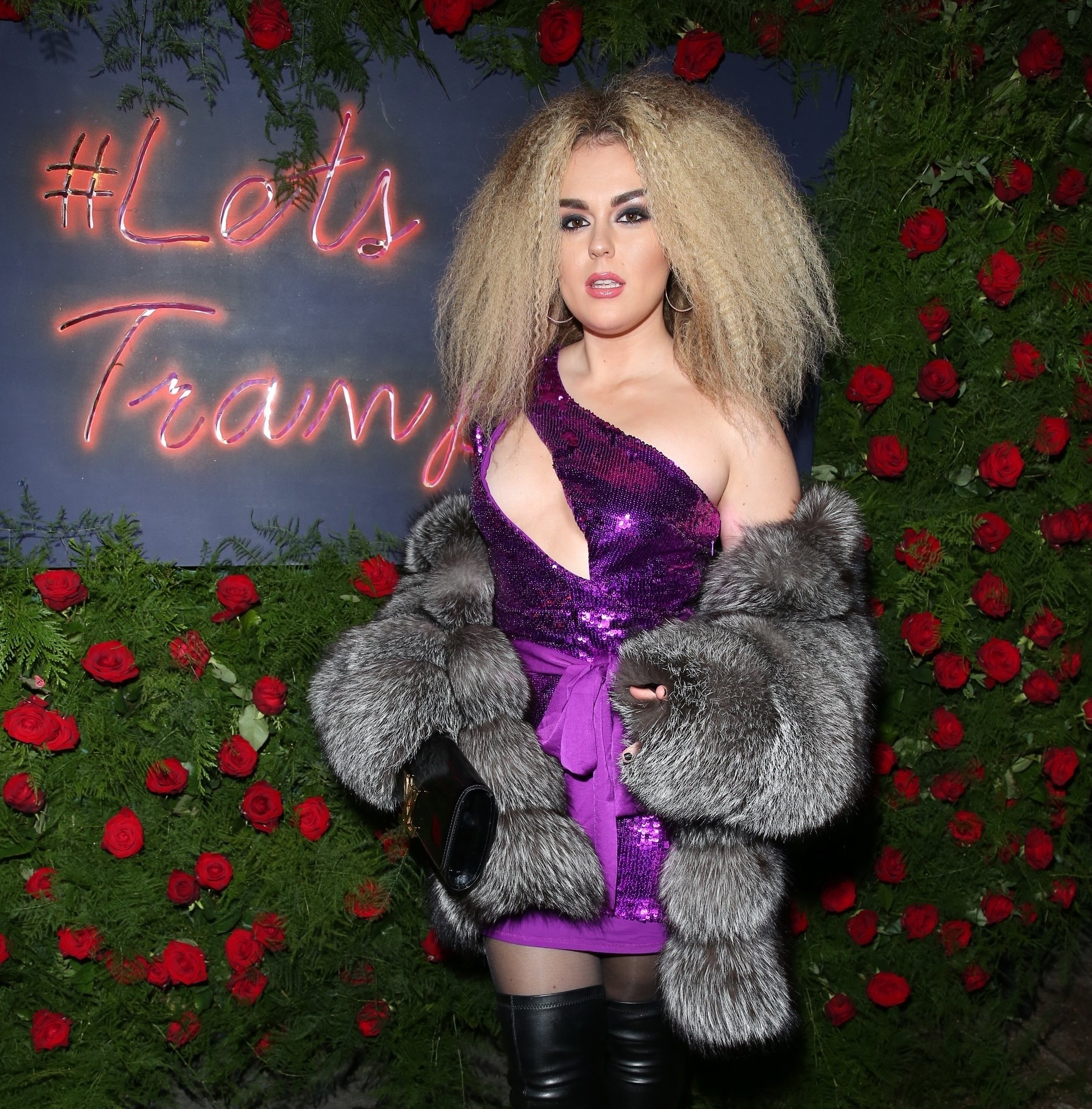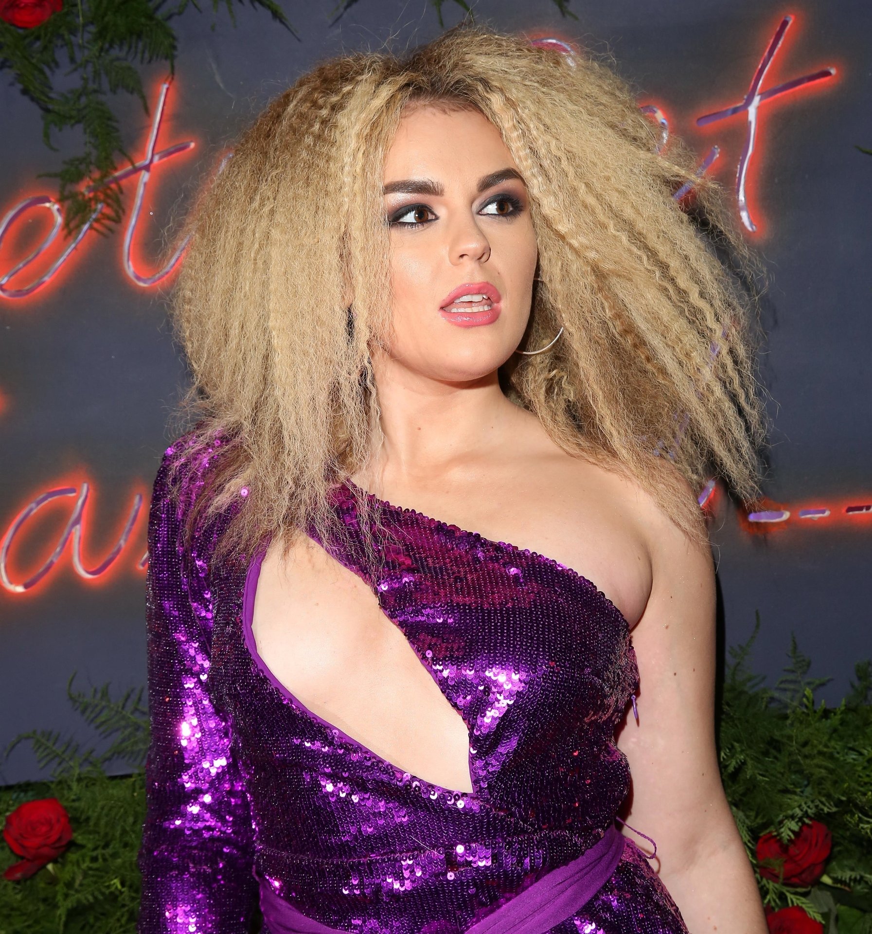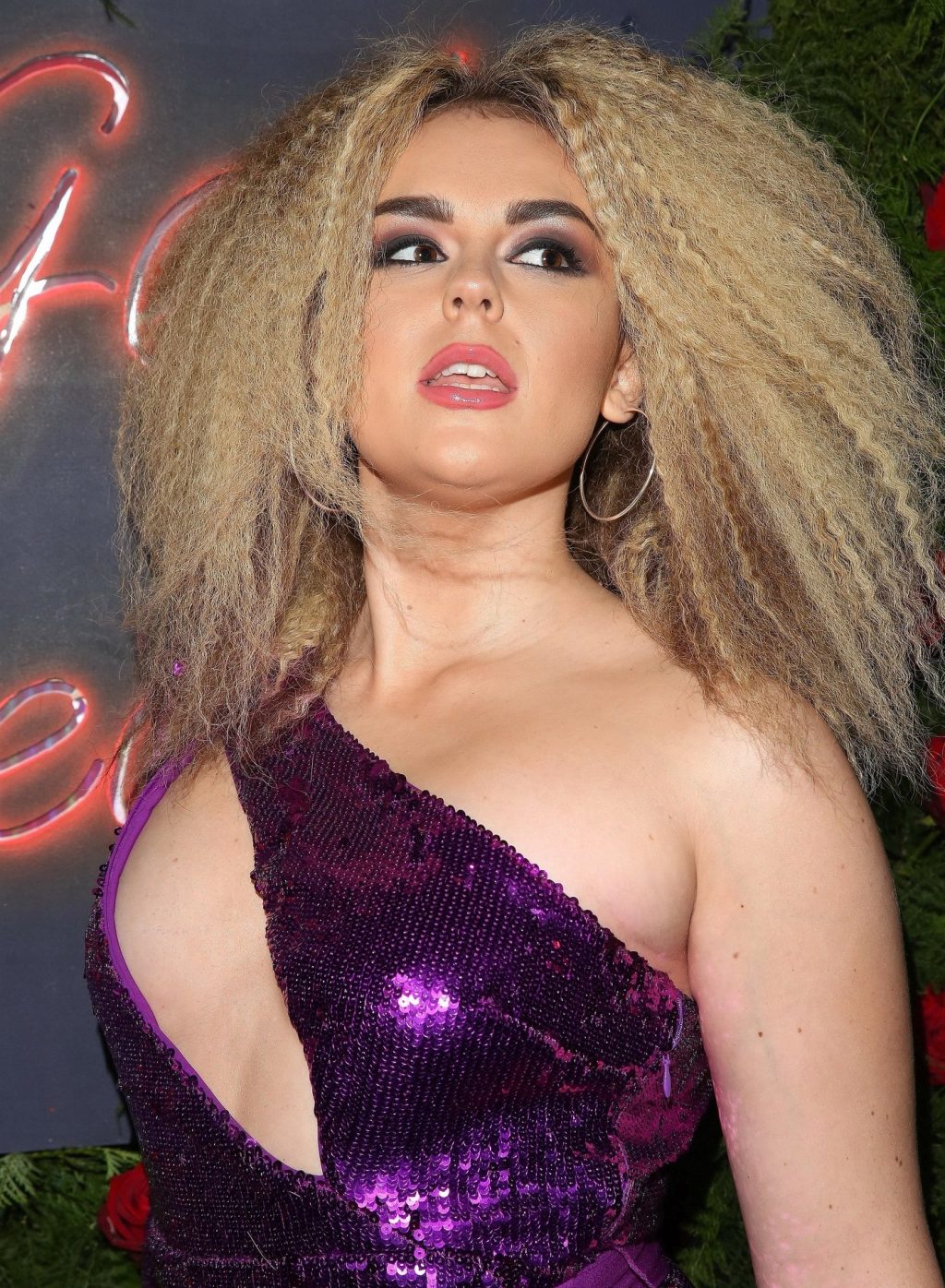 La chanteuse Tallia Storm a exhibé sa poitrine, portant une robe violette avec un décolleté lors de la fête du 50e anniversaire du club Tramp à Londres, le 17/12/2019.