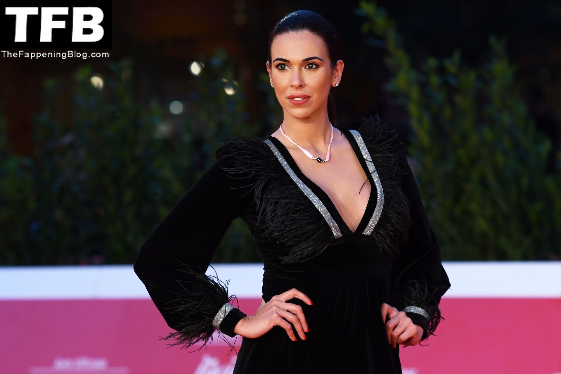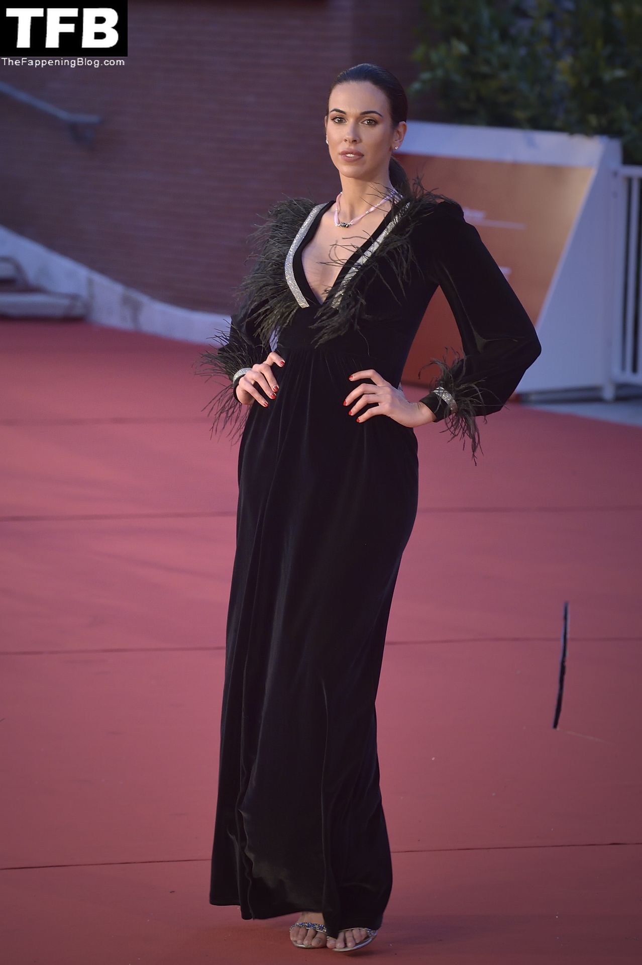 La mannequin américaine aux formes généreuses Tania Marie Caringi pose en robe noire sur le tapis rouge du Rome Film Fest 2021, le 22/10/2021.