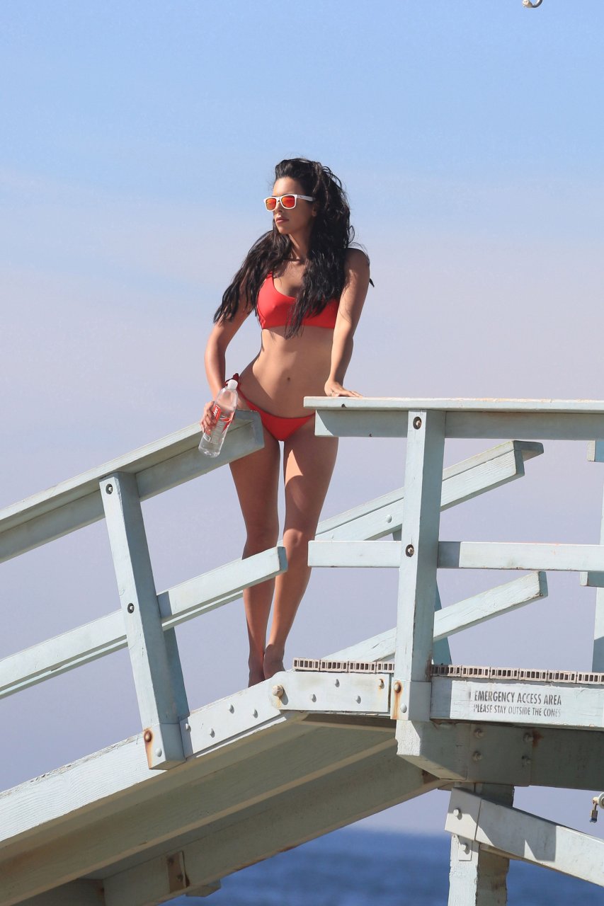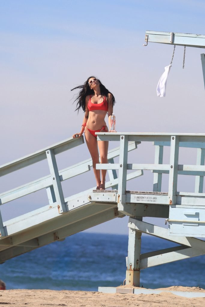 La beauté italienne Tania Marie exhibe ses courbes phénoménales dans un bikini minimaliste alors qu’elle se rend à la plage lors d’une séance photo 138 Water à Venice Beach, le 11/12/2017.