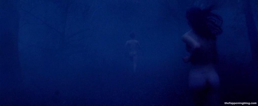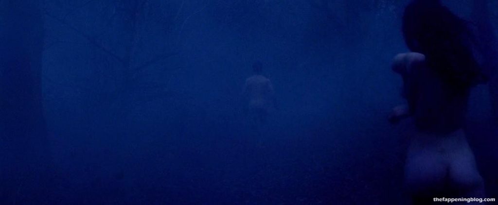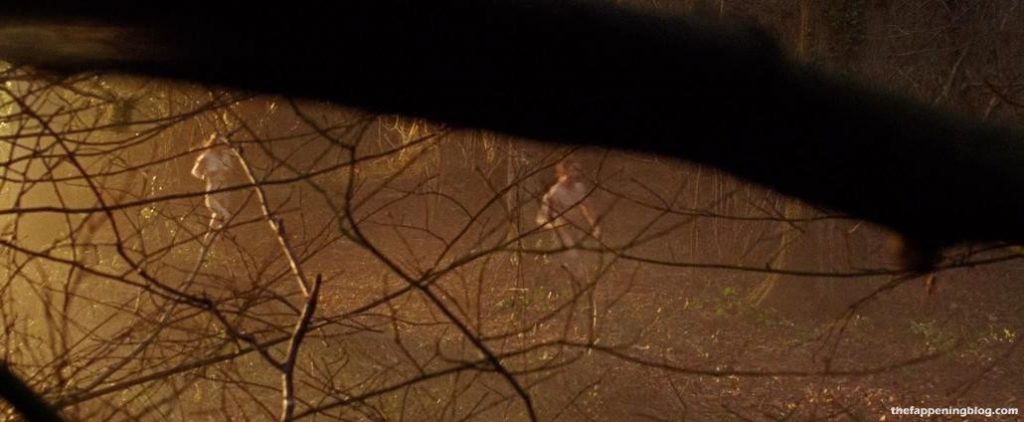 Tanya Reynolds is running through a forest completely naked, seen from behind in slow motion at first, and then seen from the front as she follows after a guy before tripping and falling.