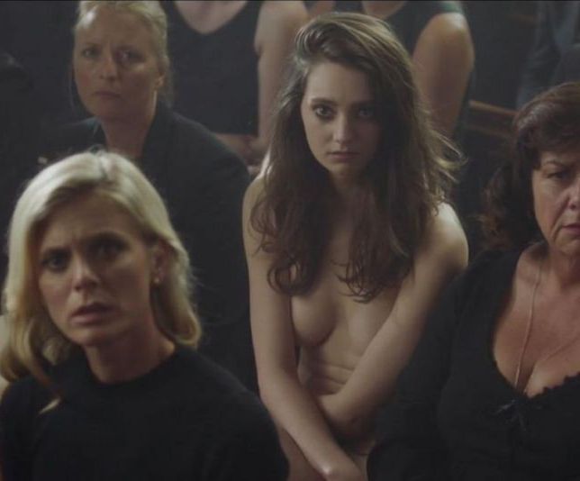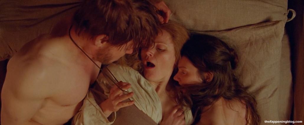 Tanya Reynolds is standing by a bed as a guy pulls open her dress from behind and squeezes her exposed breast as Maxine Peake and another guy look on. Tanya then strips down coimpletely naked, kneeling on the bed with her breasts and bush in view. Maxine then joins her on the bed and Tanya kisses her. The first guy then joins them and they lay down with Maxine in the middle between Tanya and the guy.