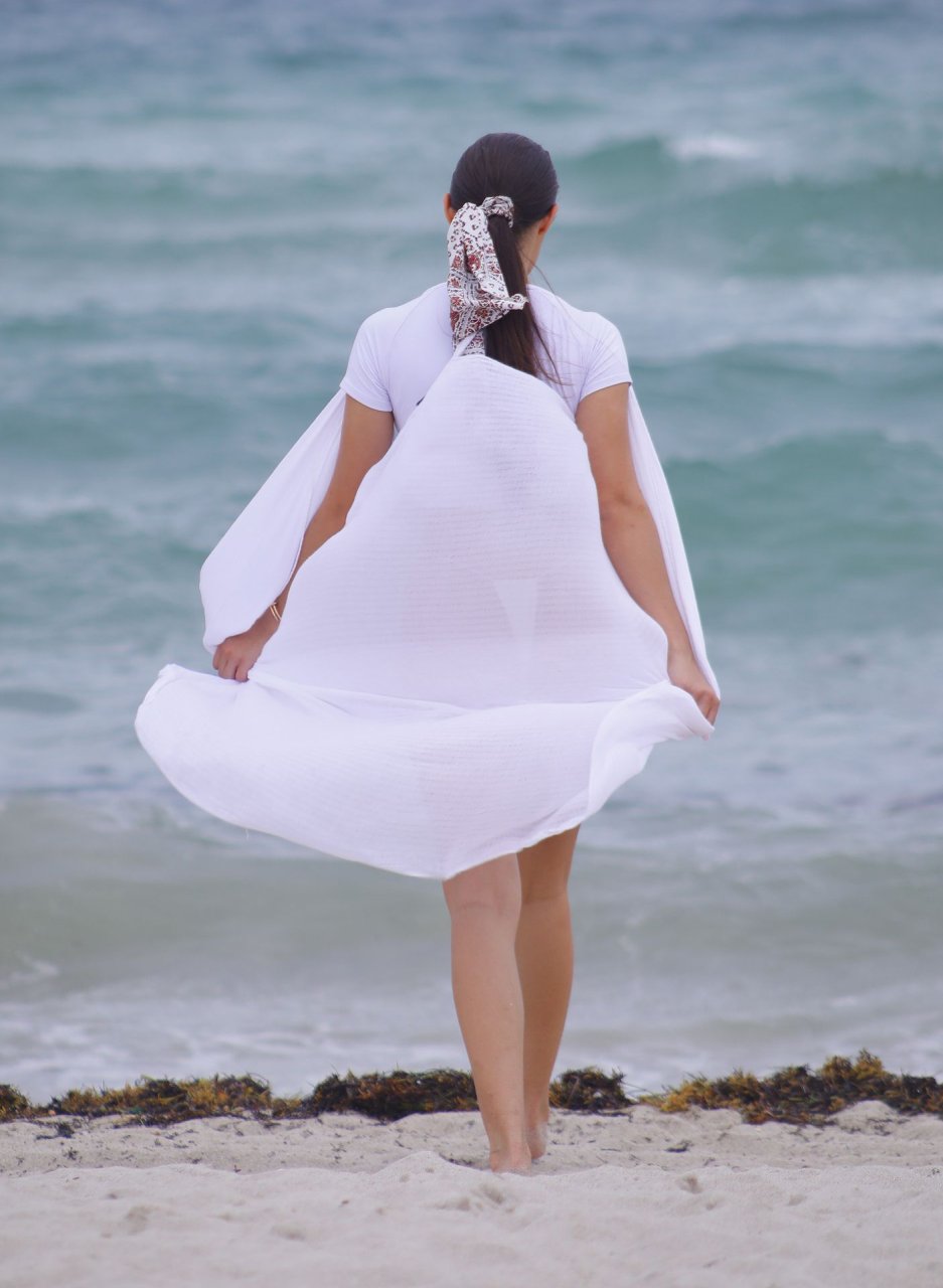 Le mannequin français Tao Wickrath porte un maillot de bain blanc fluide sur Miami Beach, 24/07/2019.