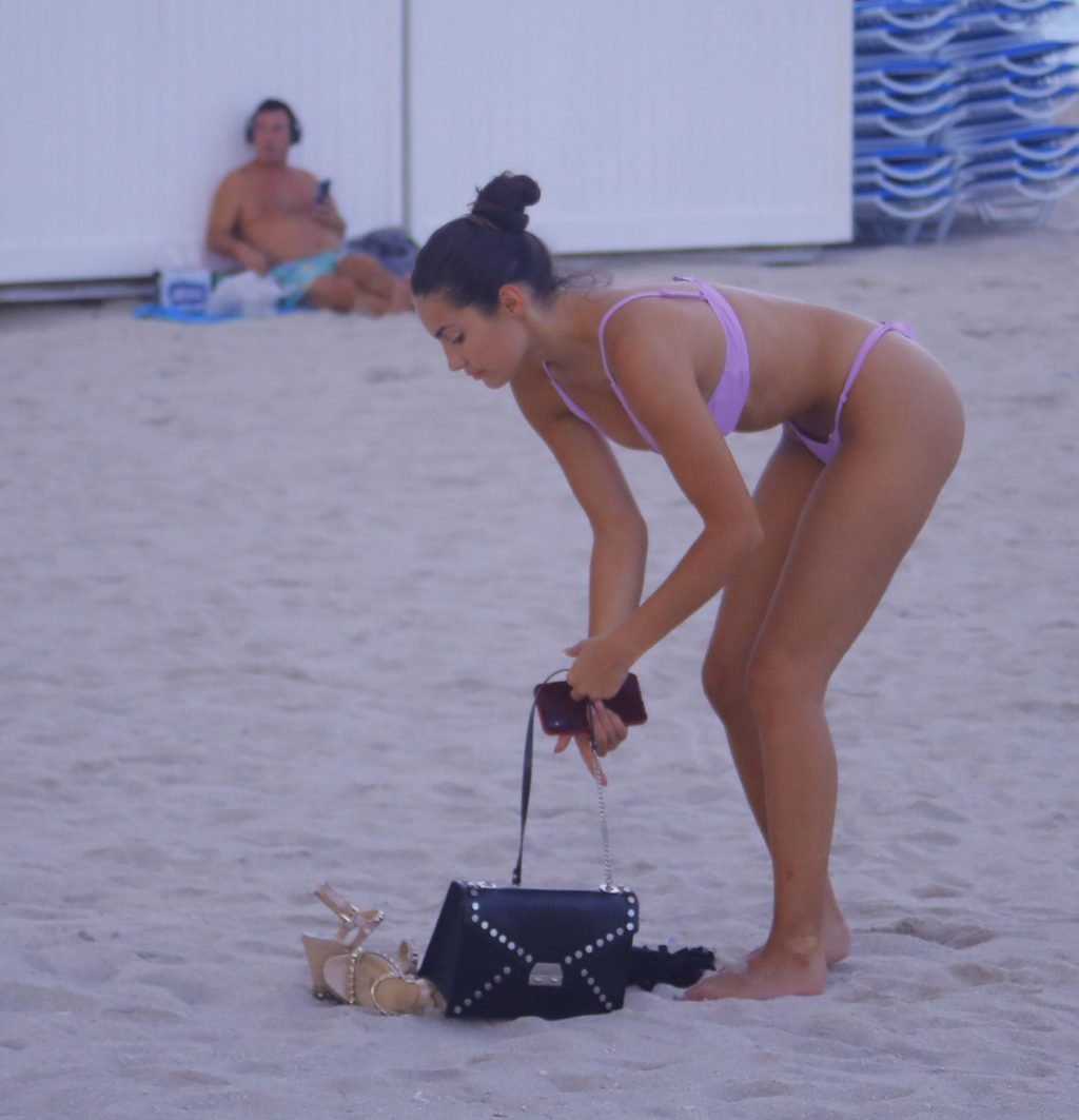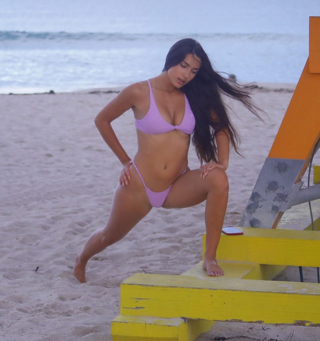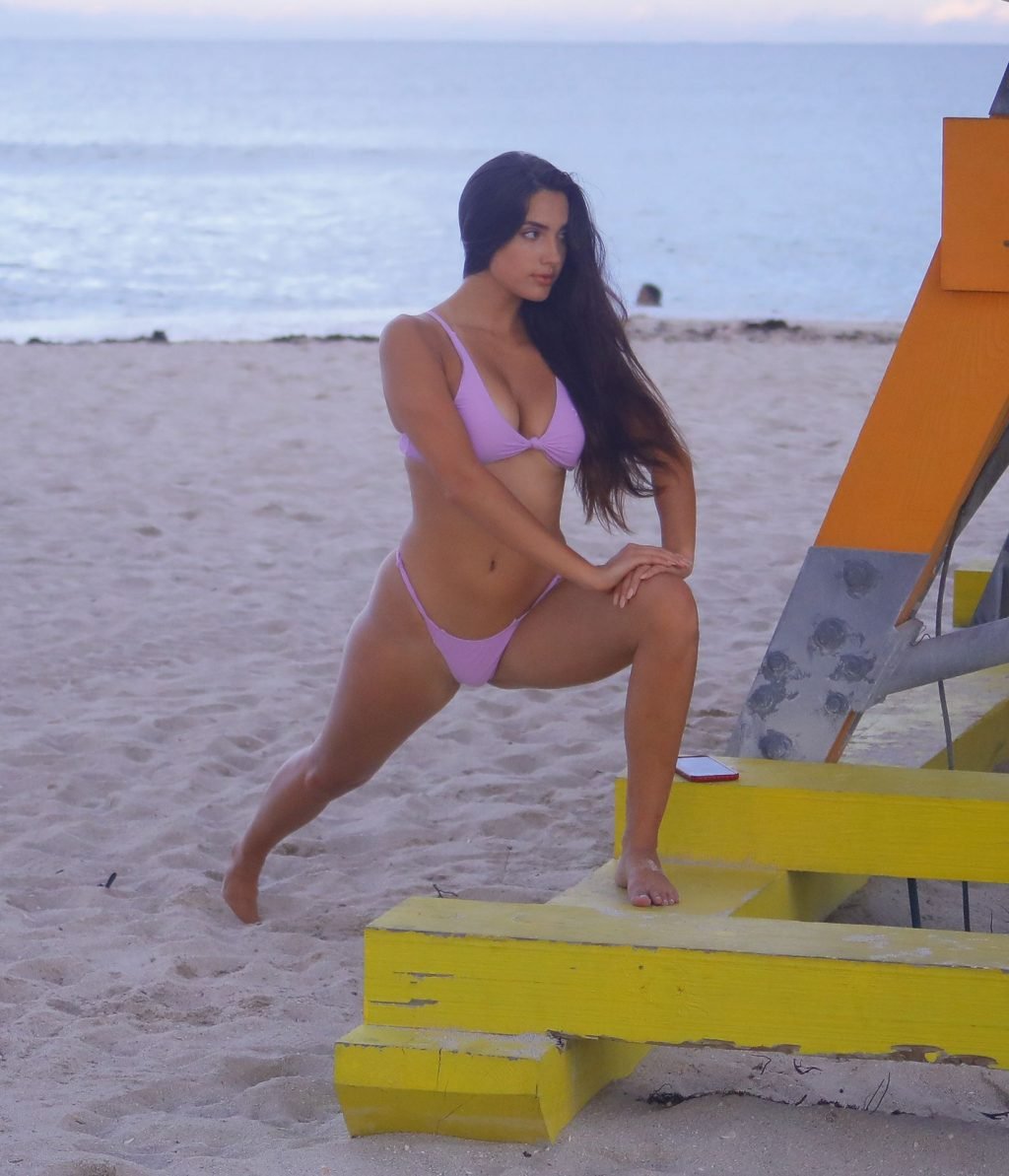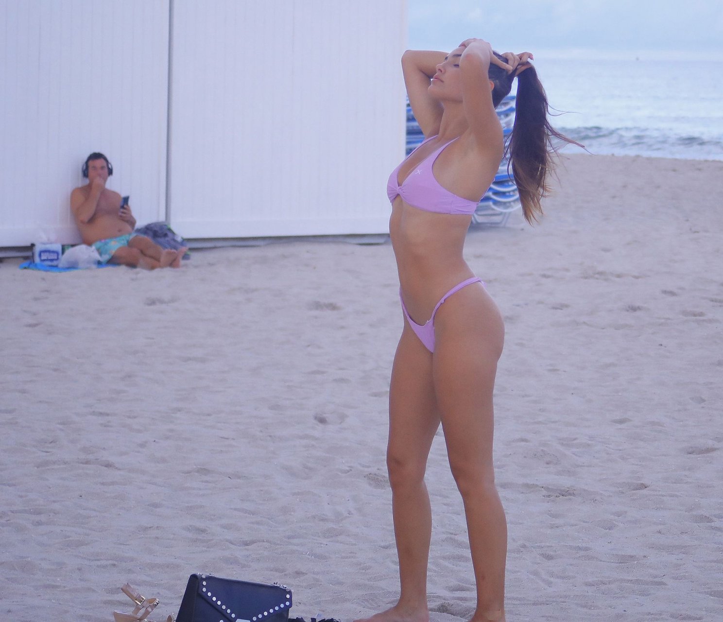 Tao Wickrath montre son corps tonique de plage alors qu’elle s’étire près d’une tour de sauveteur quelques jours avant que la tempête tropicale Dorian ne frappe South Beach, 28/08/2019.