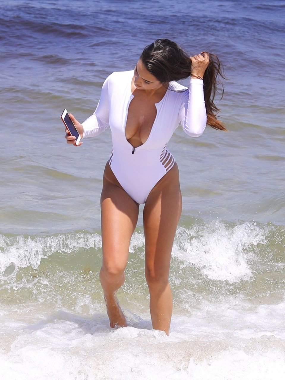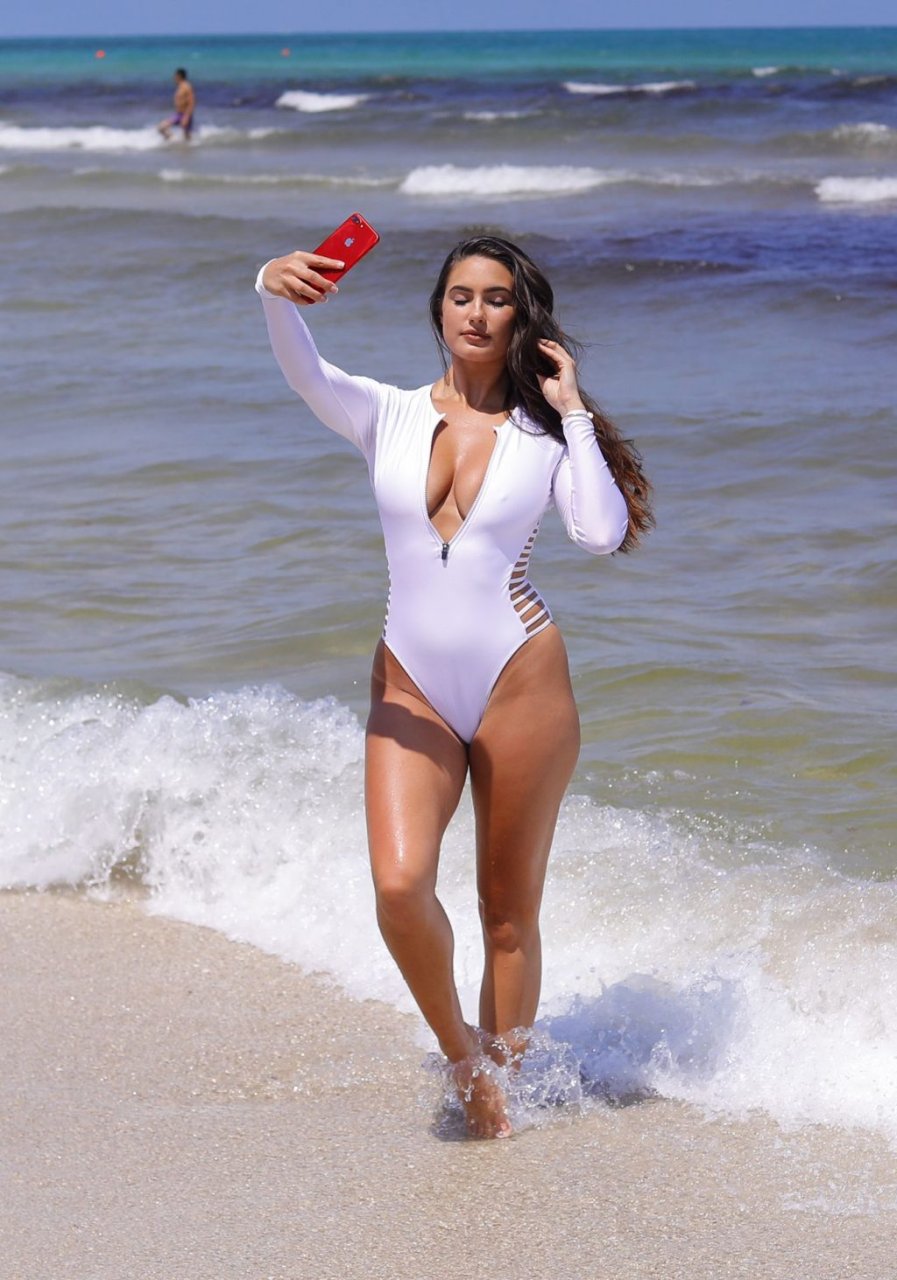 Le mannequin français Tao Wickrath éblouit en maillot de bain blanc alors qu’elle prend des selfies sur une tour de sauveteur, adoptant ses meilleures poses « Baywatch » et sautant même après avoir failli être mordue par un insecte, profitant d’une journée chaude pendant le week-end de la fête des Mémoires à Miami, le 24/05/2019.