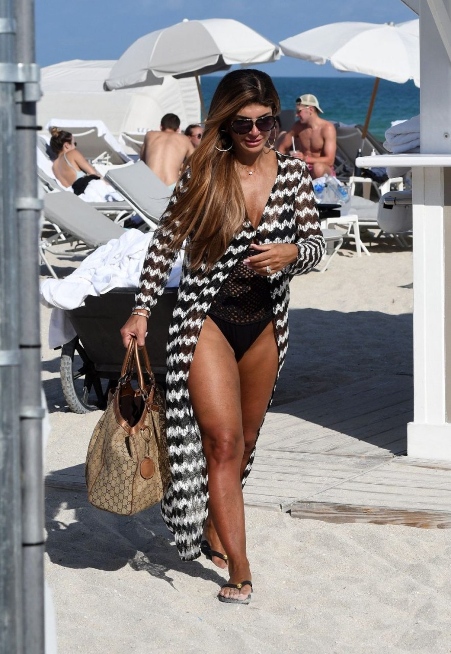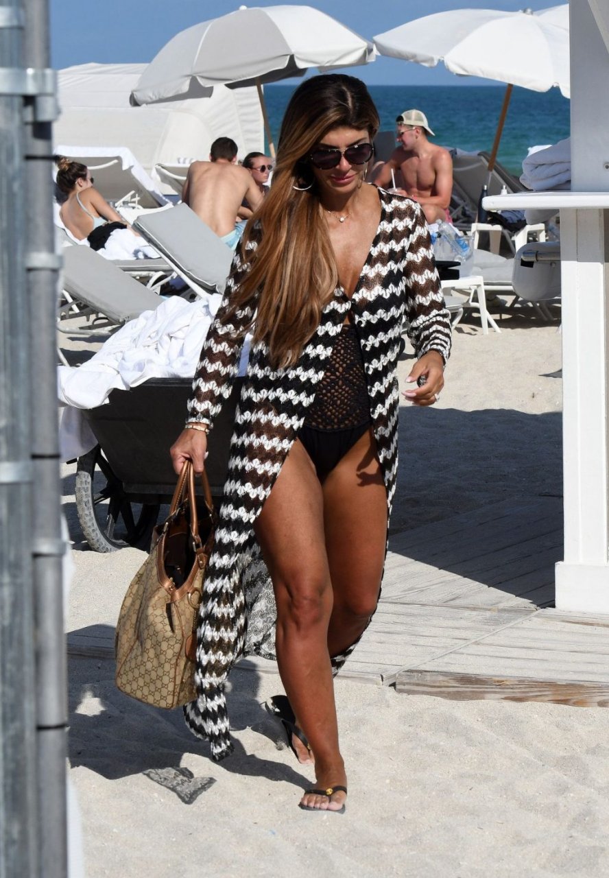 Teresa Giudice met en valeur ses courbes et son grand diamant en plein centre en portant un maillot de bain audacieux à la plage de Miami, le 18/02/2019.