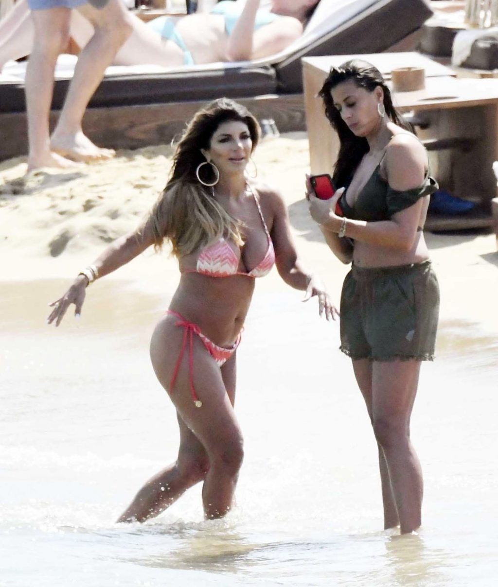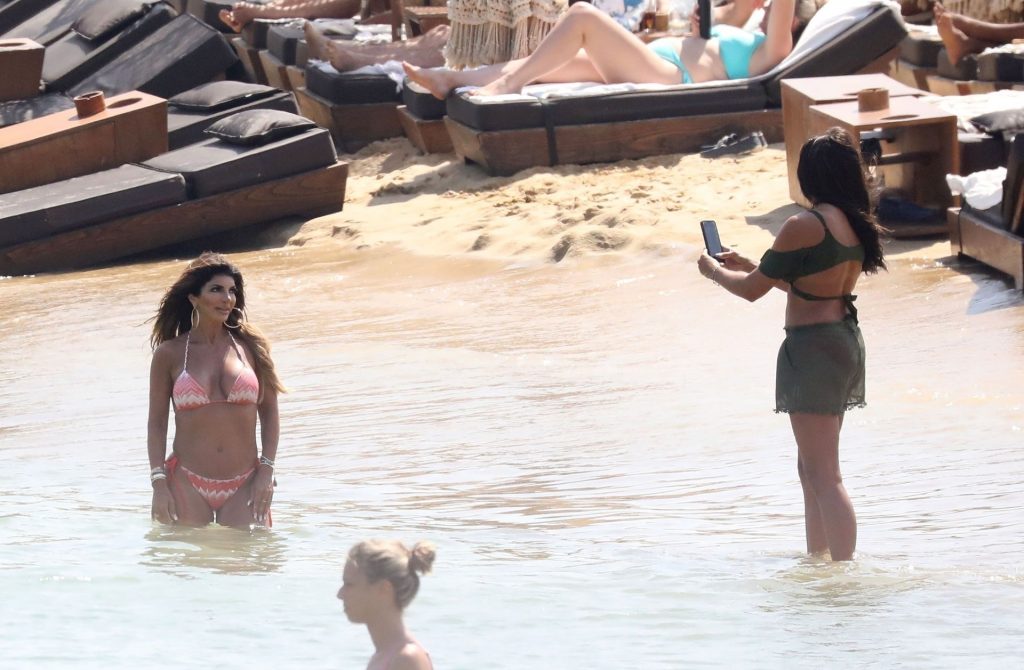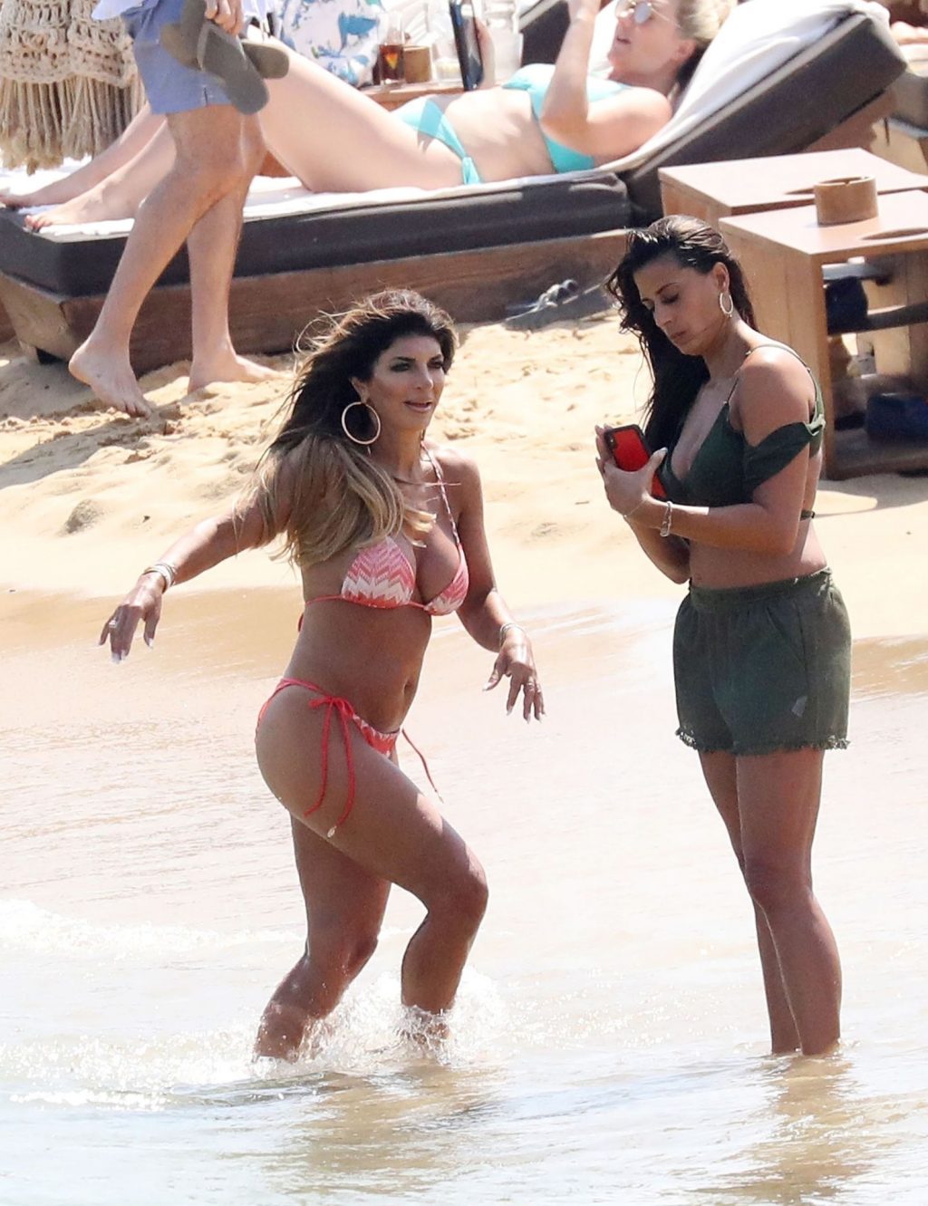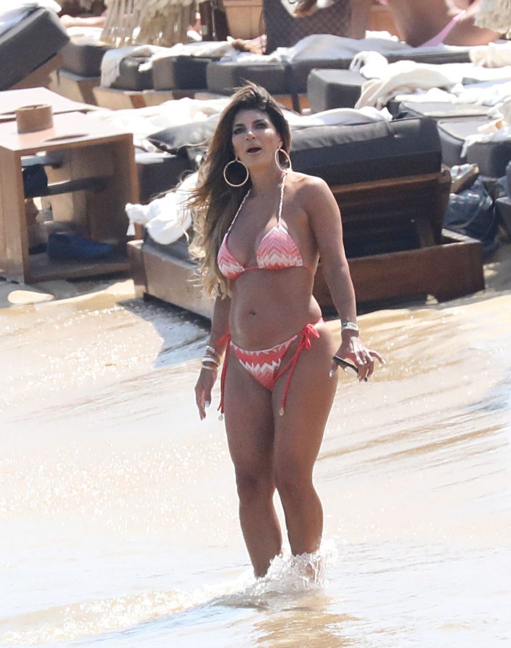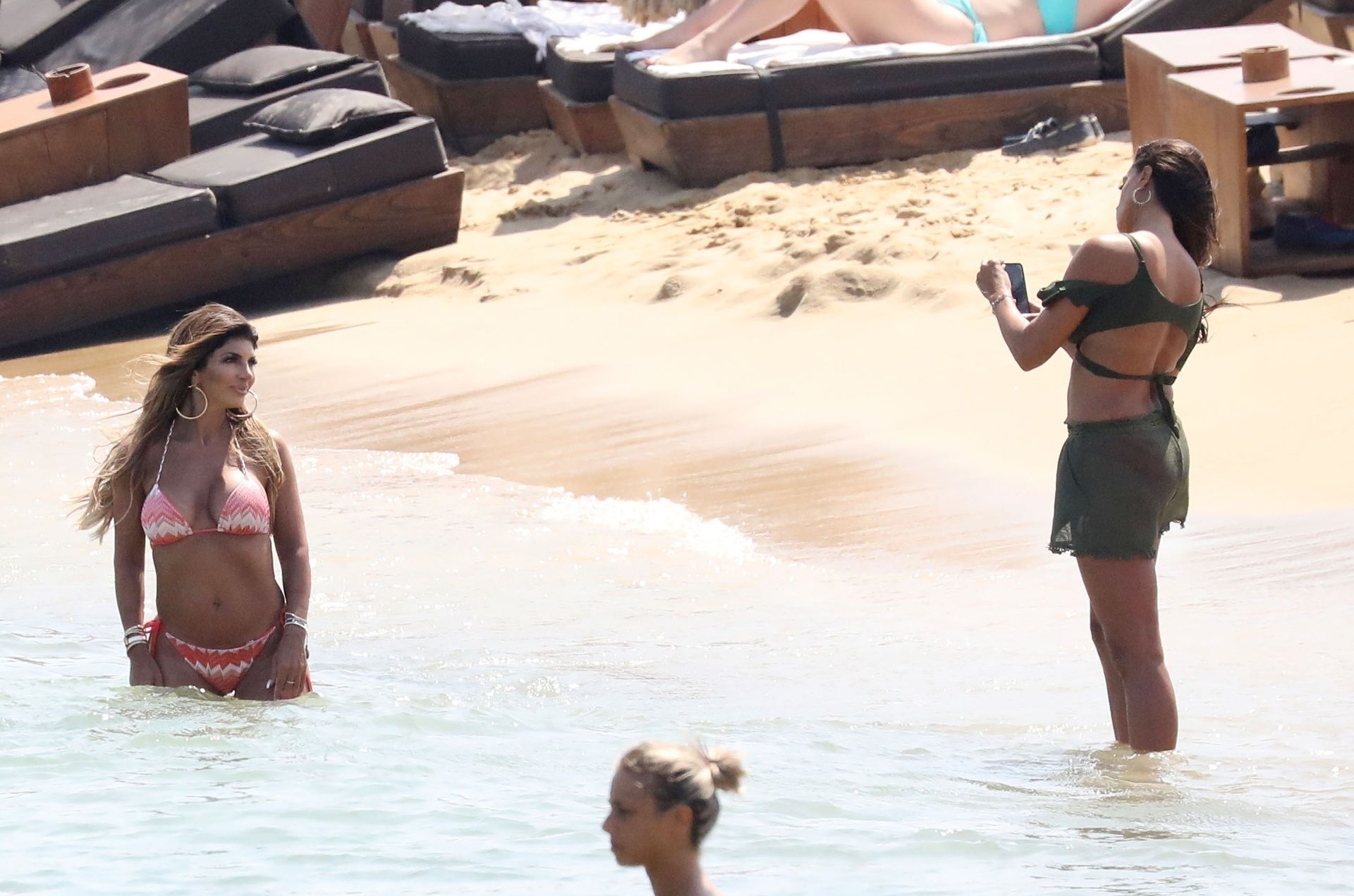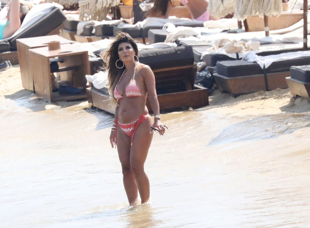 La star de la télé-réalité de 47 ans Teresa Giudice éblouit dans un bikini rose à col halter tout en se relaxant sur la plage de Mykonos, 25/08/2019.