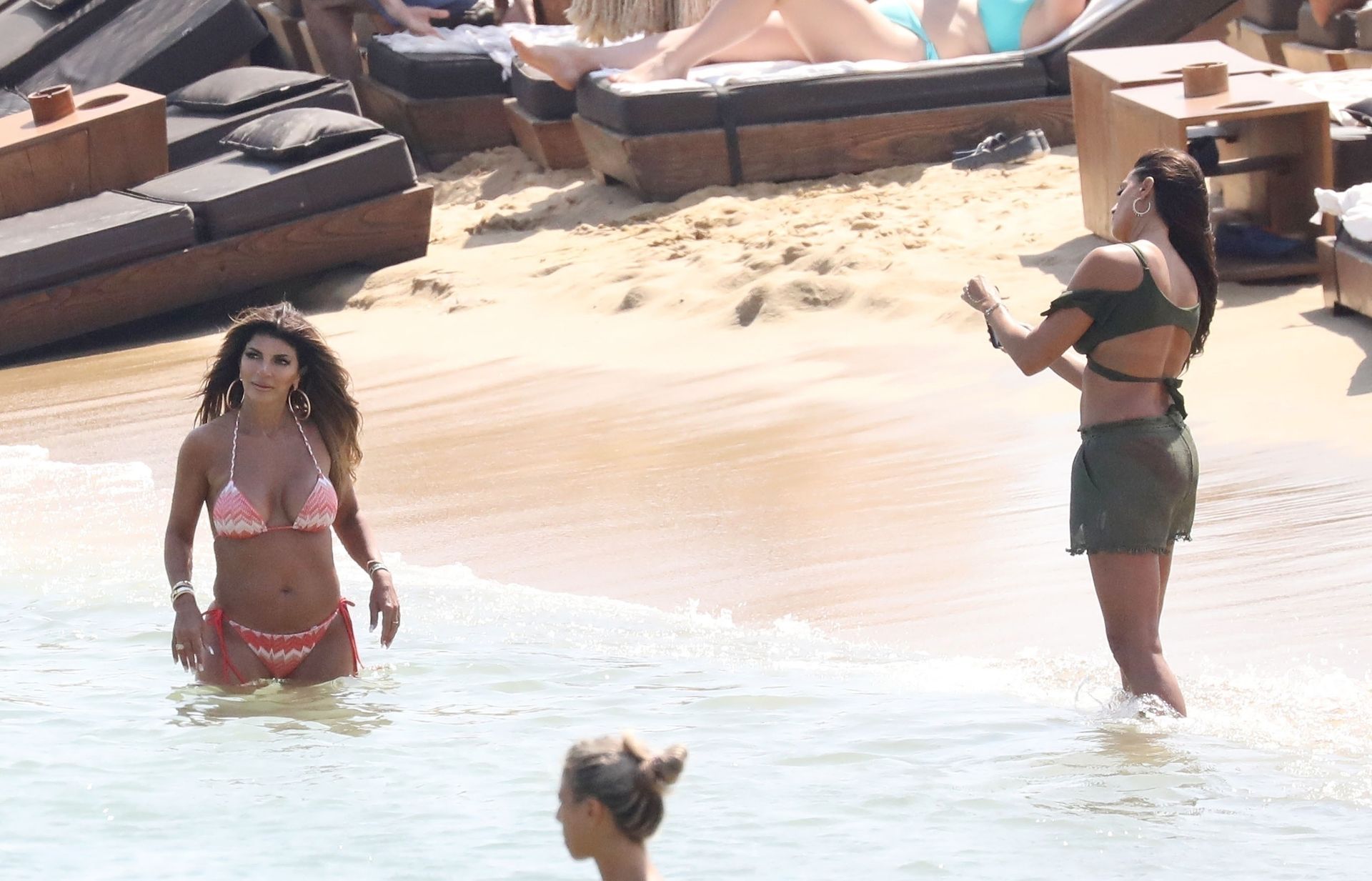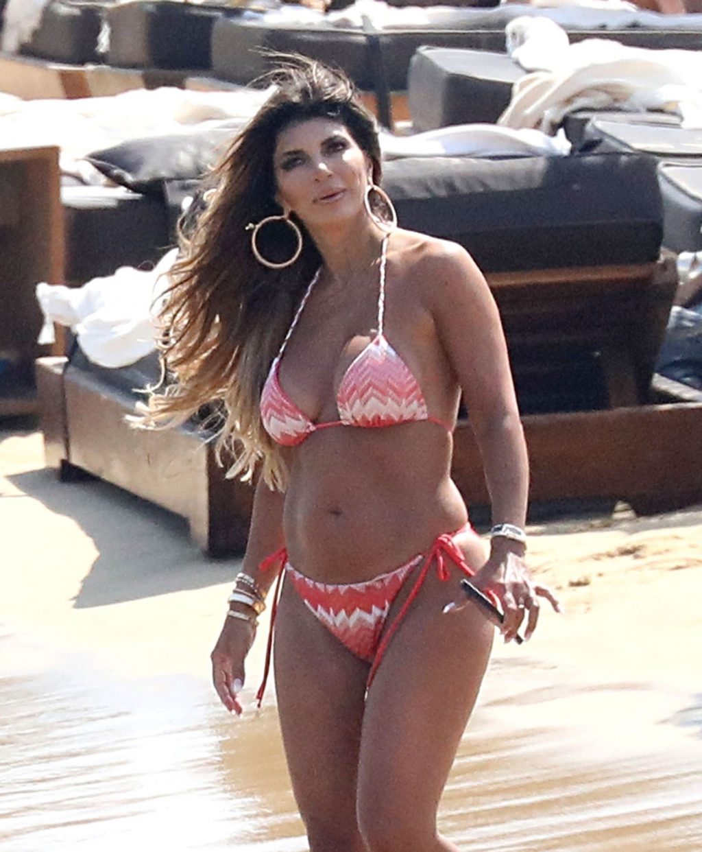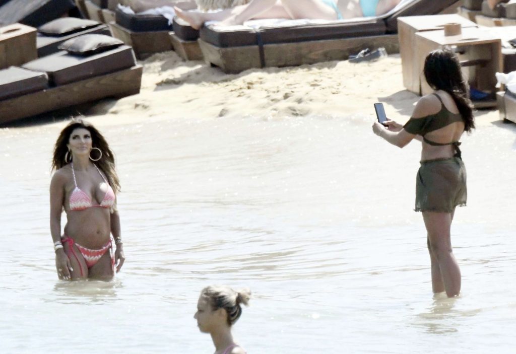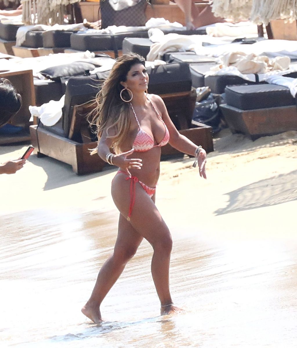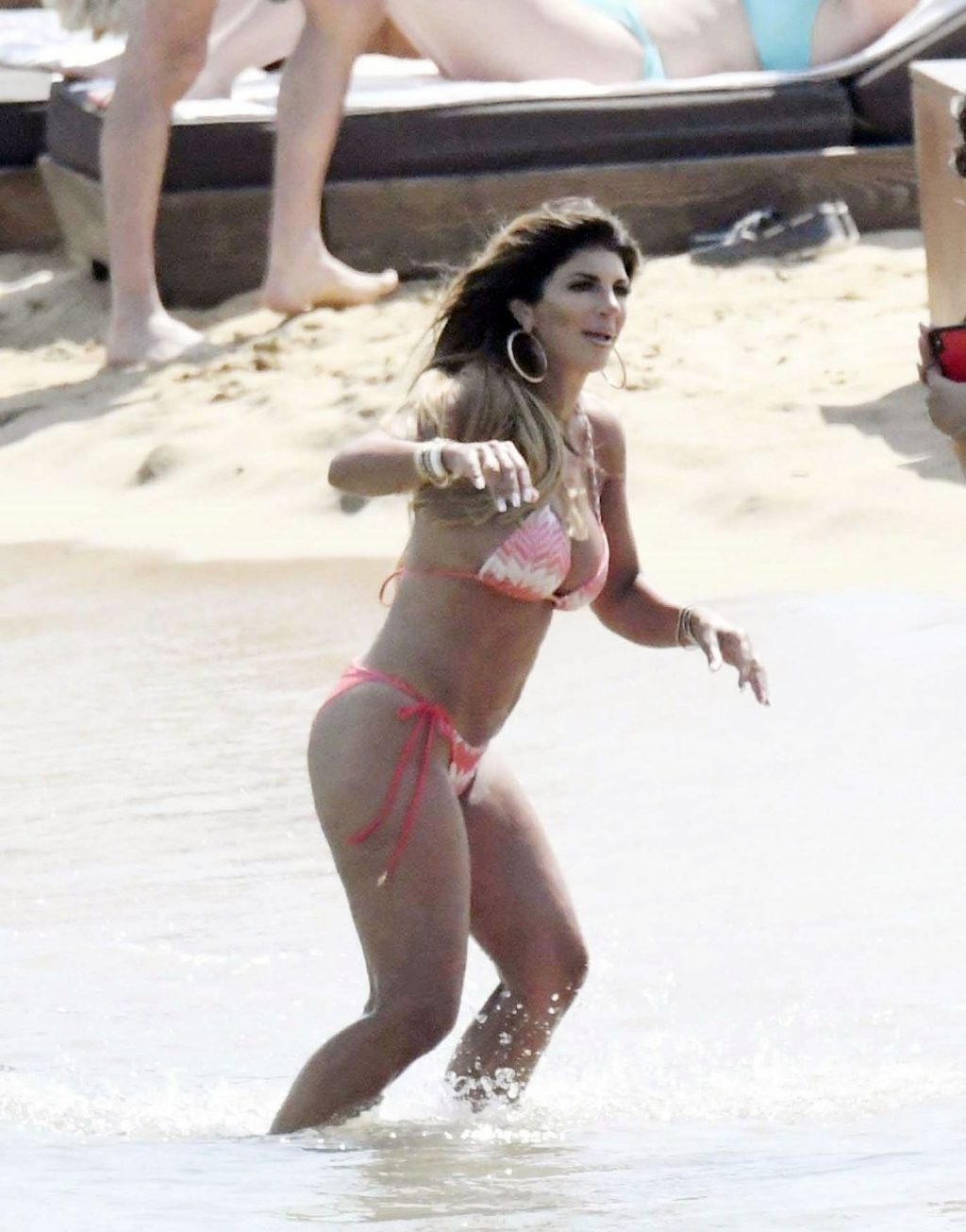 La star de la télé-réalité de 47 ans Teresa Giudice éblouit dans un bikini rose à col halter tout en se relaxant sur la plage de Mykonos, 25/08/2019.