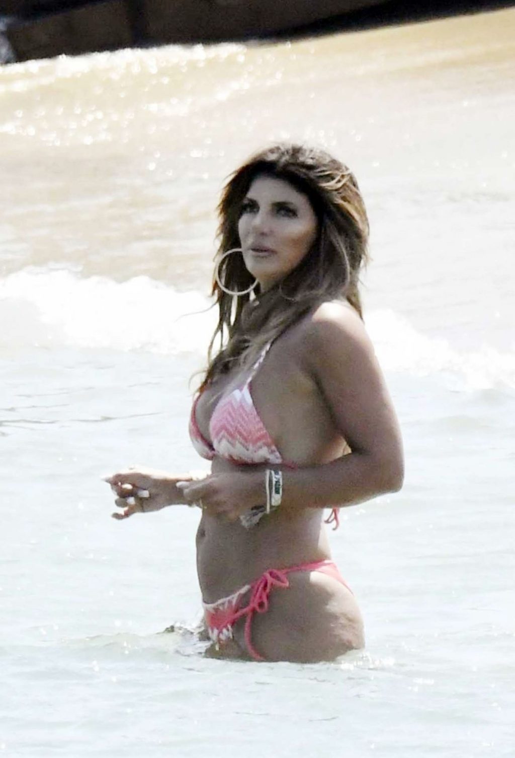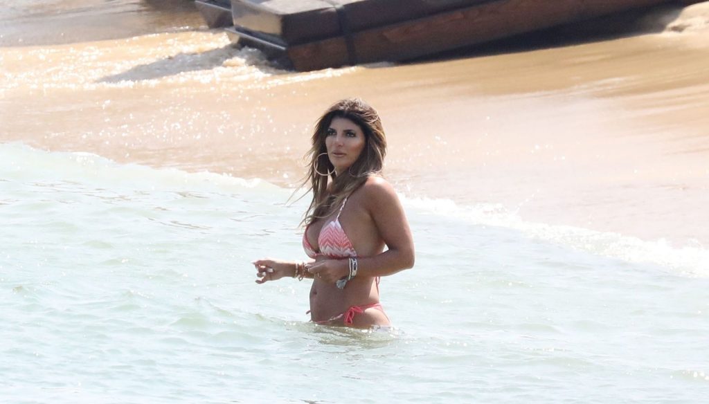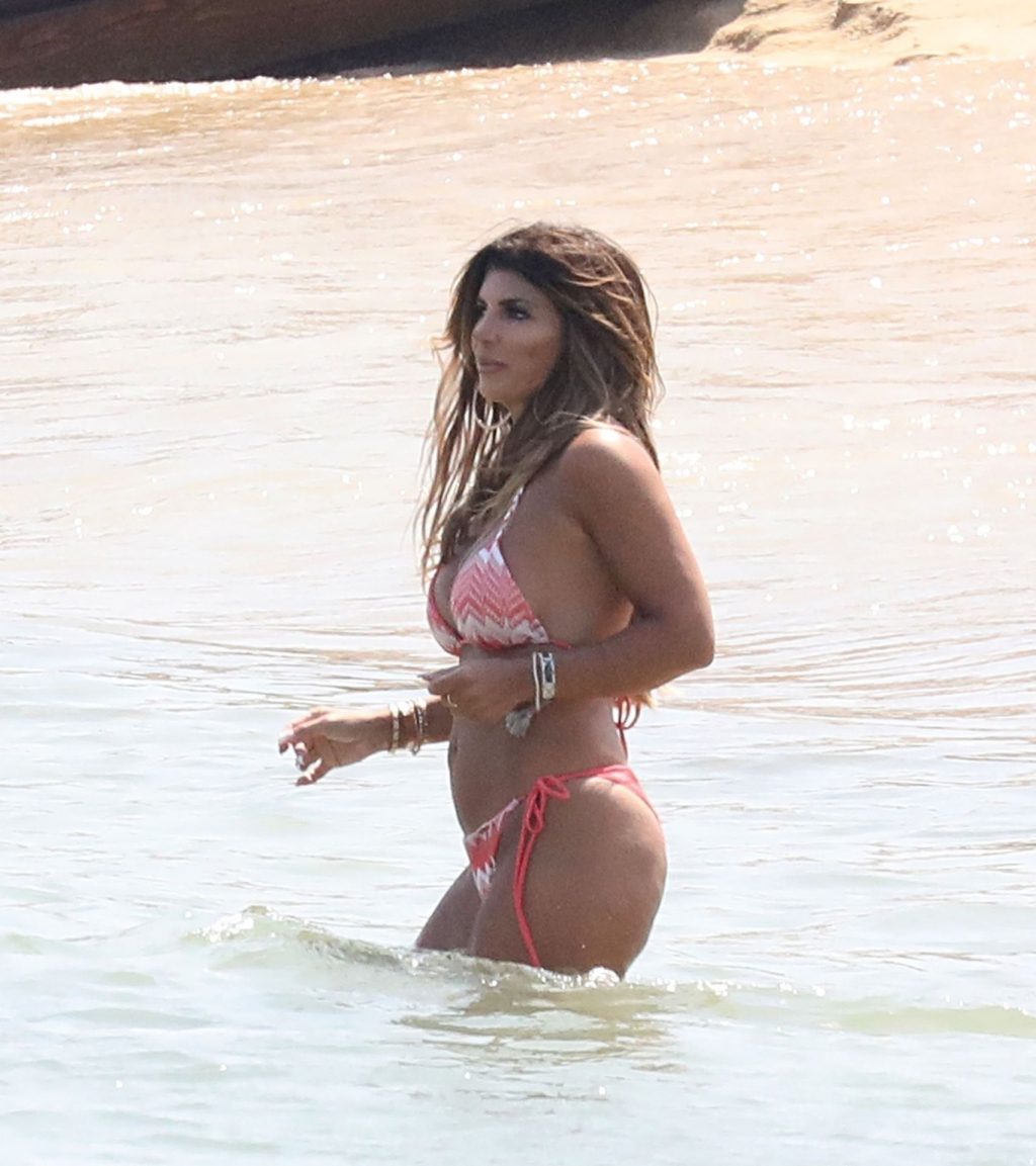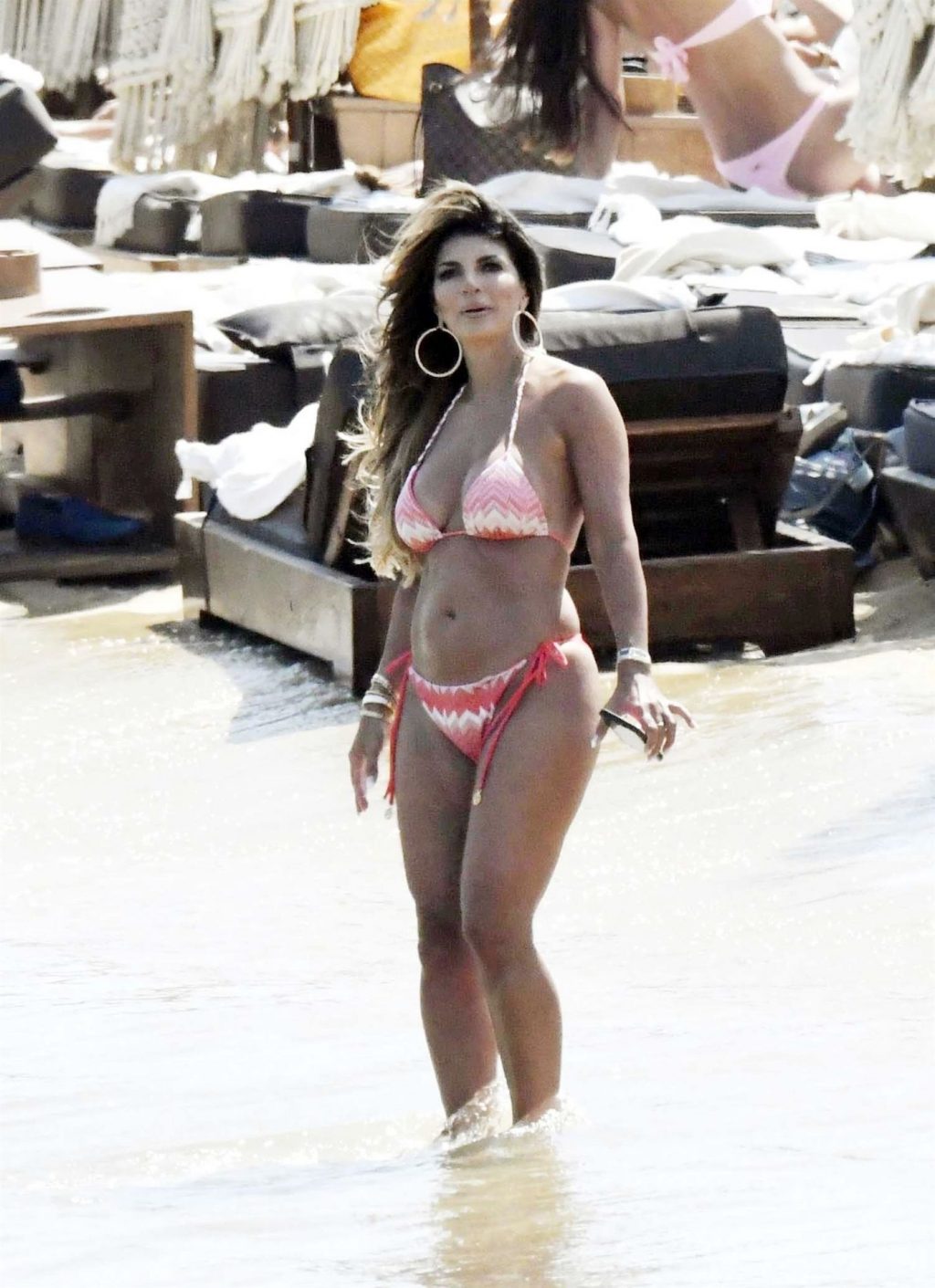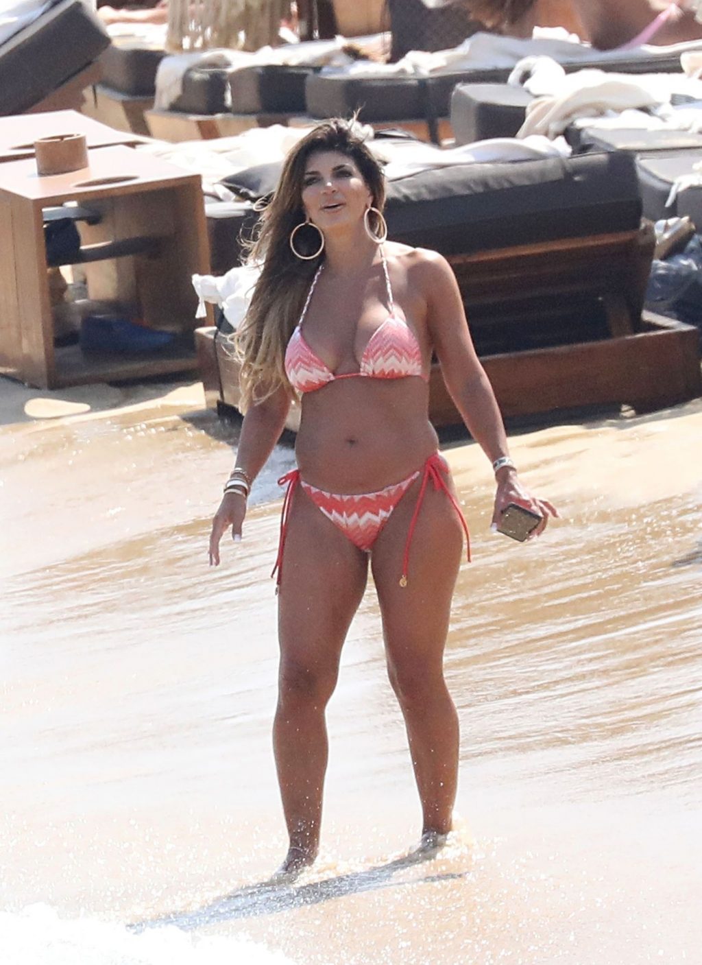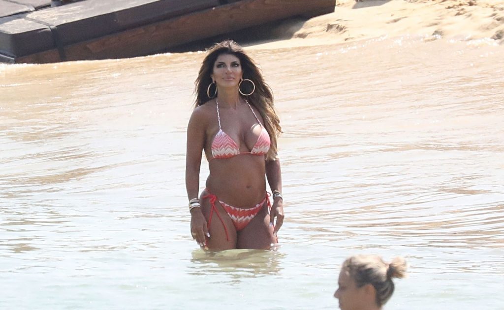 La star de la télé-réalité de 47 ans Teresa Giudice éblouit dans un bikini rose à col halter tout en se relaxant sur la plage de Mykonos, 25/08/2019.