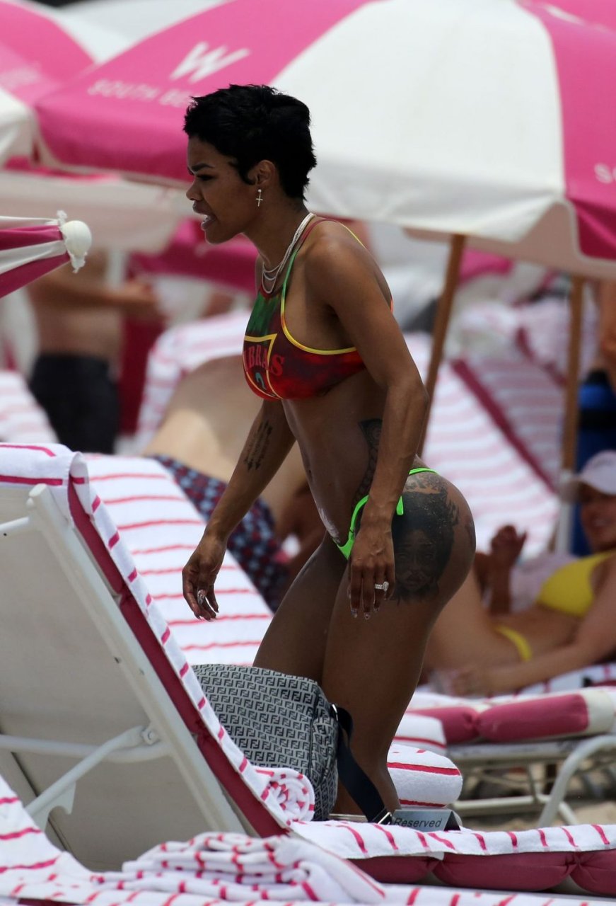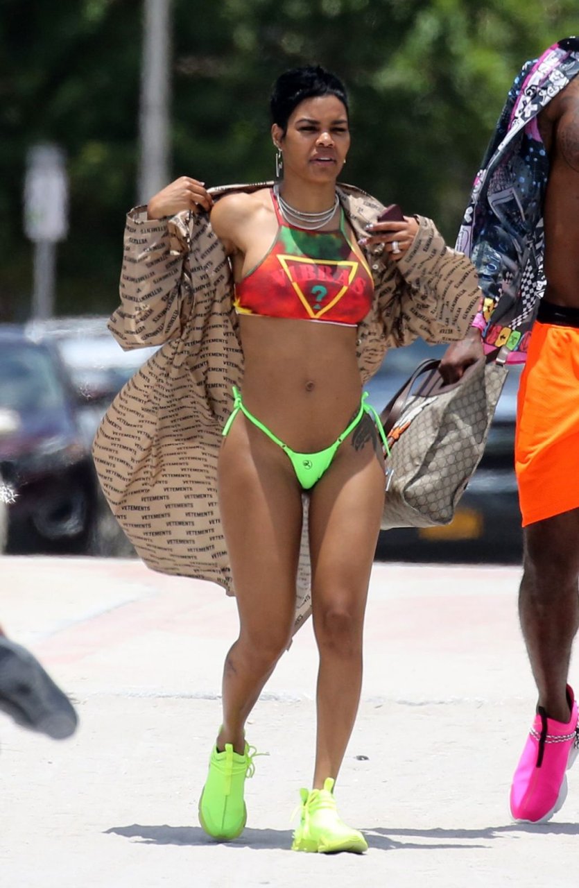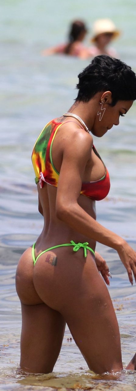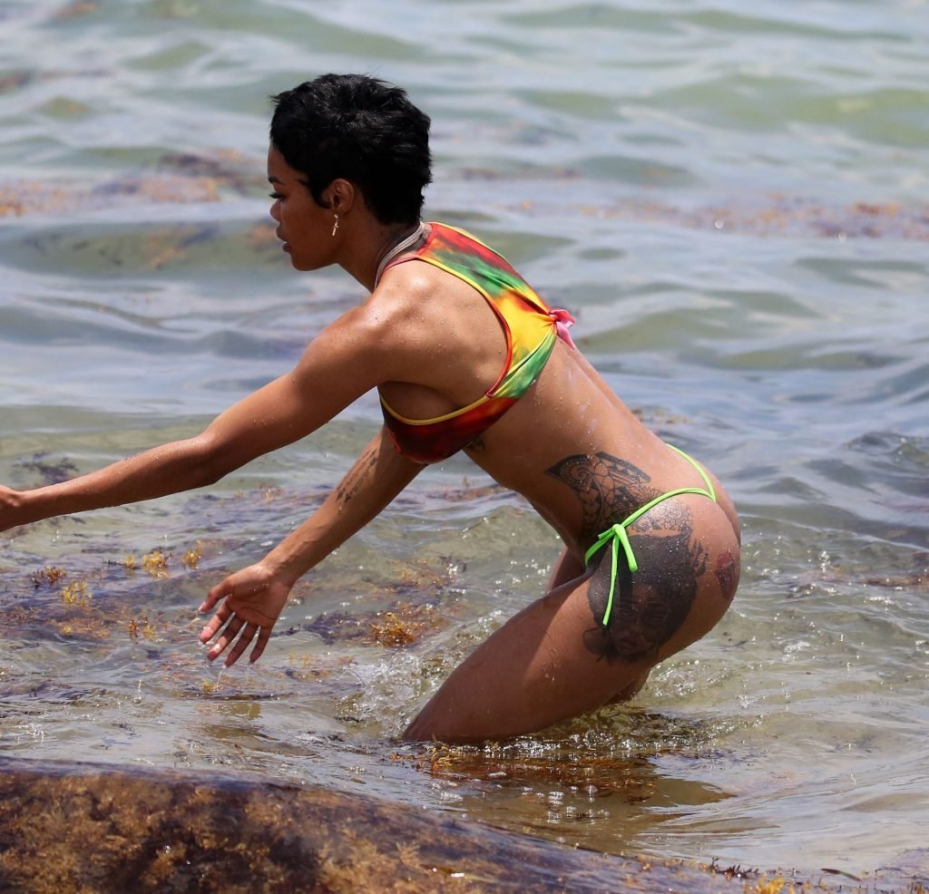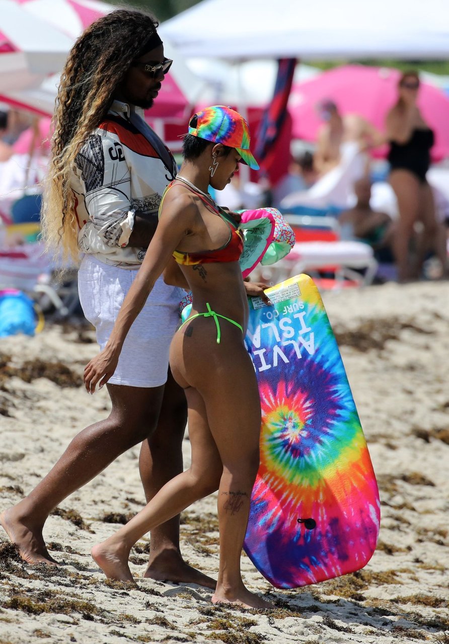La chanteuse Teyana Taylor porte un tout petit bikini dépareillé tout en profitant du 4 juillet avec son mari, le joueur de la NBA Iman Shumpert, et leur fille à Miami Beach, le 04/07/2019.