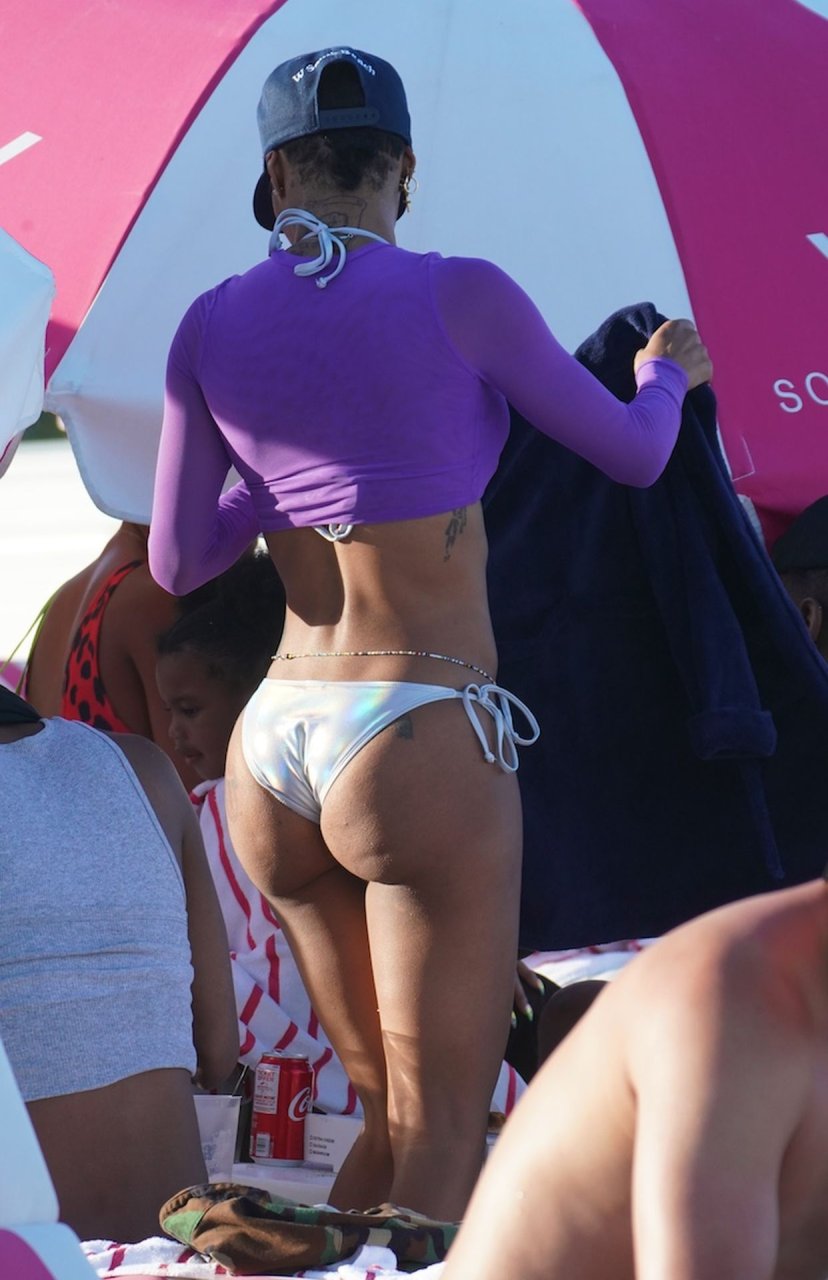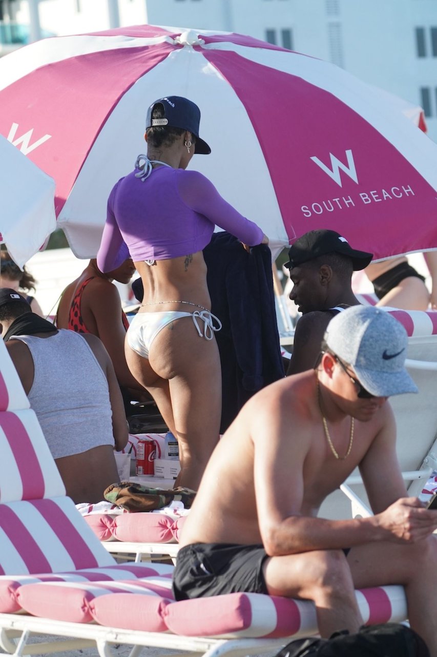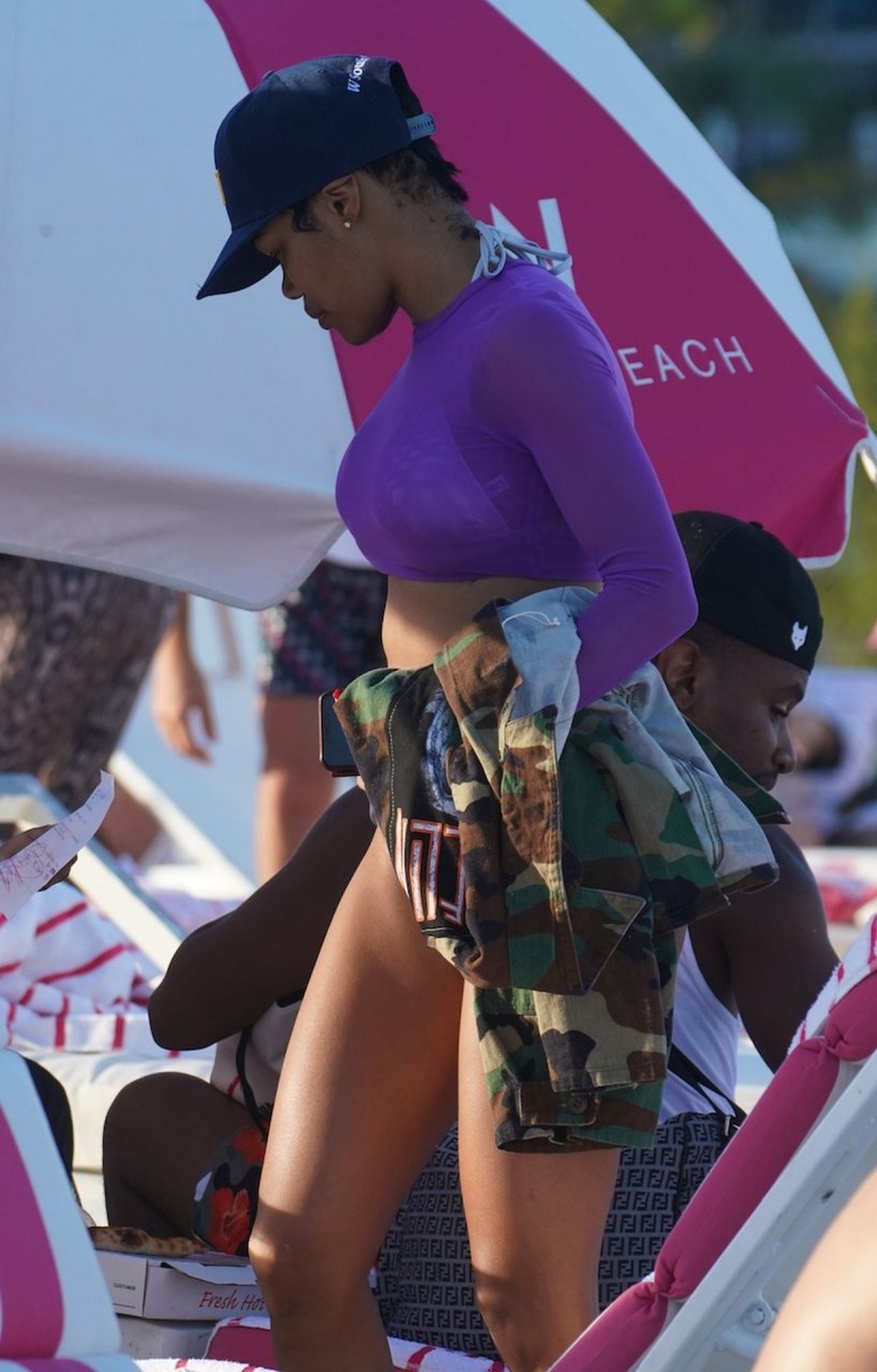 Teyana Taylor passe une journée en bikini brillant avec un haut en maille violet à la plage de Miami, 03/04/2019.