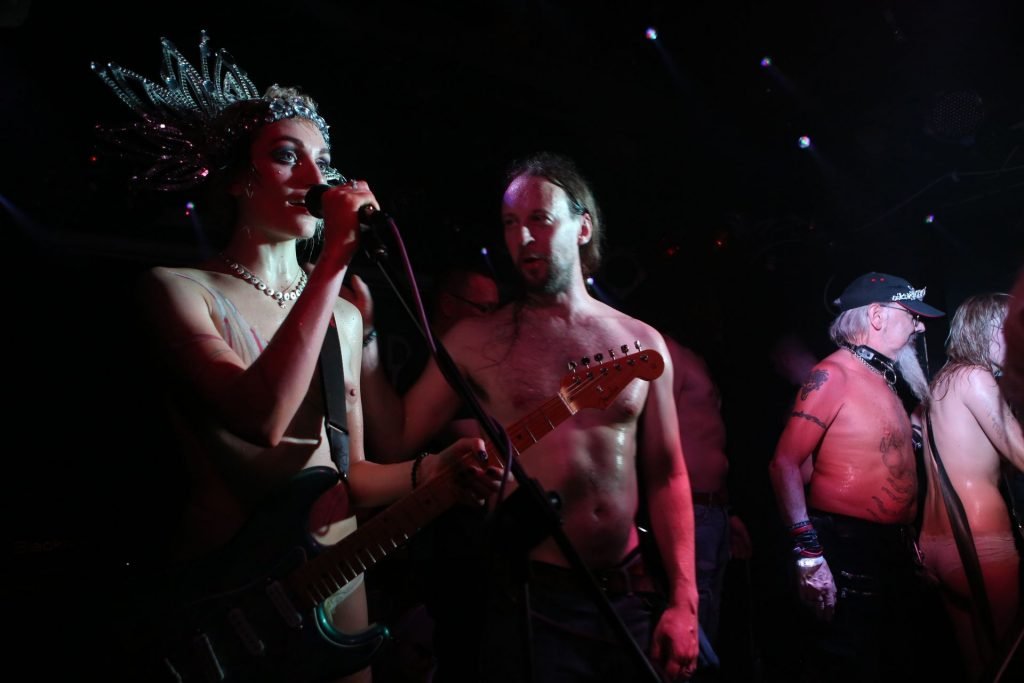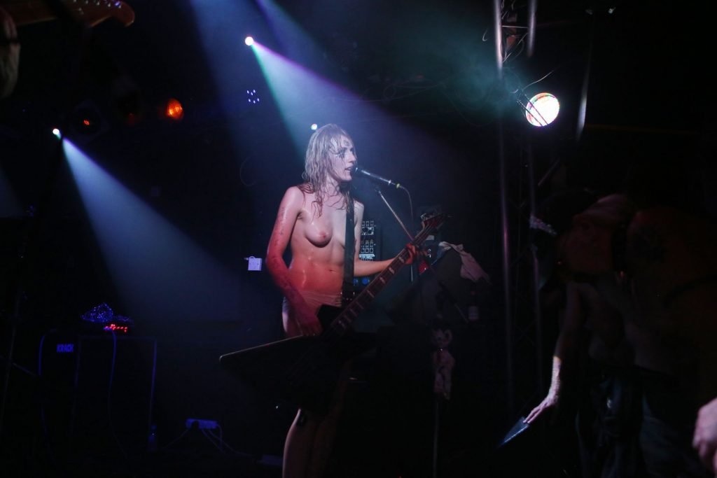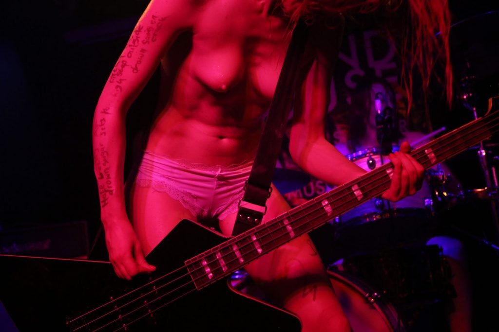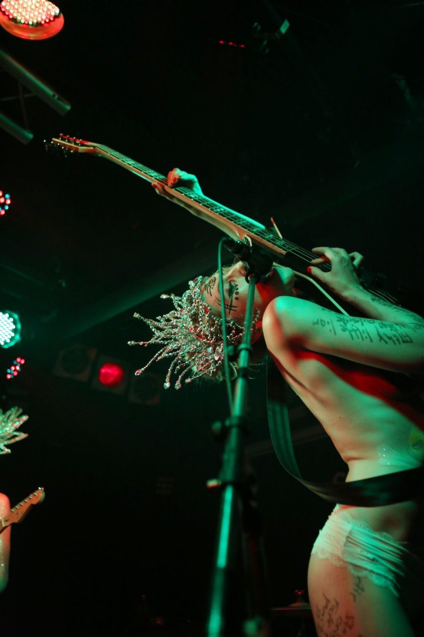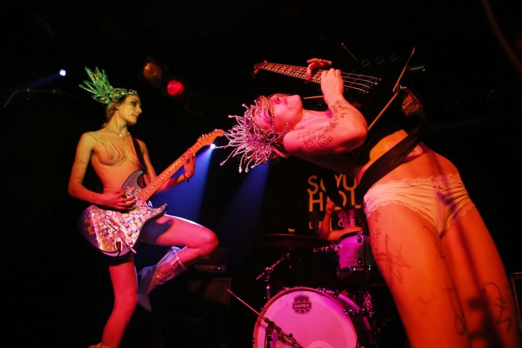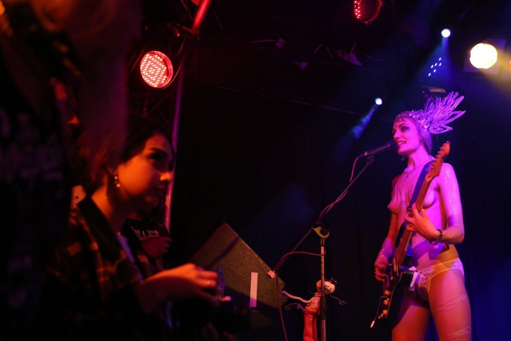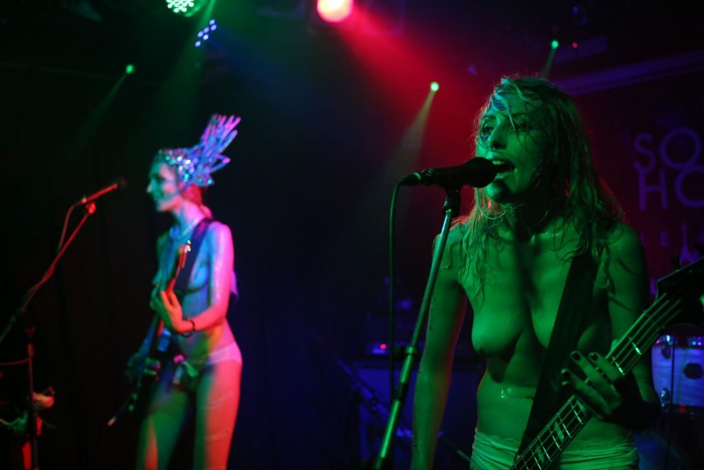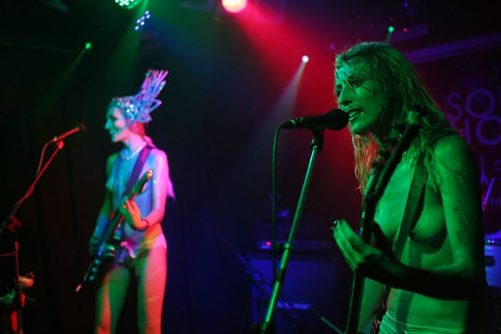 The SoapGirls se produisent au Soundhouse à Leicester, le 30/08/2019. Millie (photo) et sa sœur Mie font de la musique avec des références punk, apparaissant presque nues alors qu’elles promeuvent une éthique basée sur la libération. Leur dernier album, Elephant in the Room, est disponible maintenant.