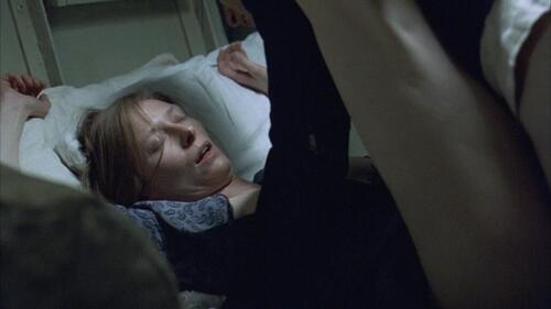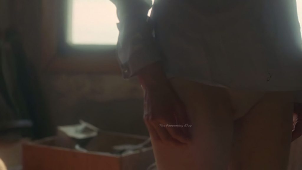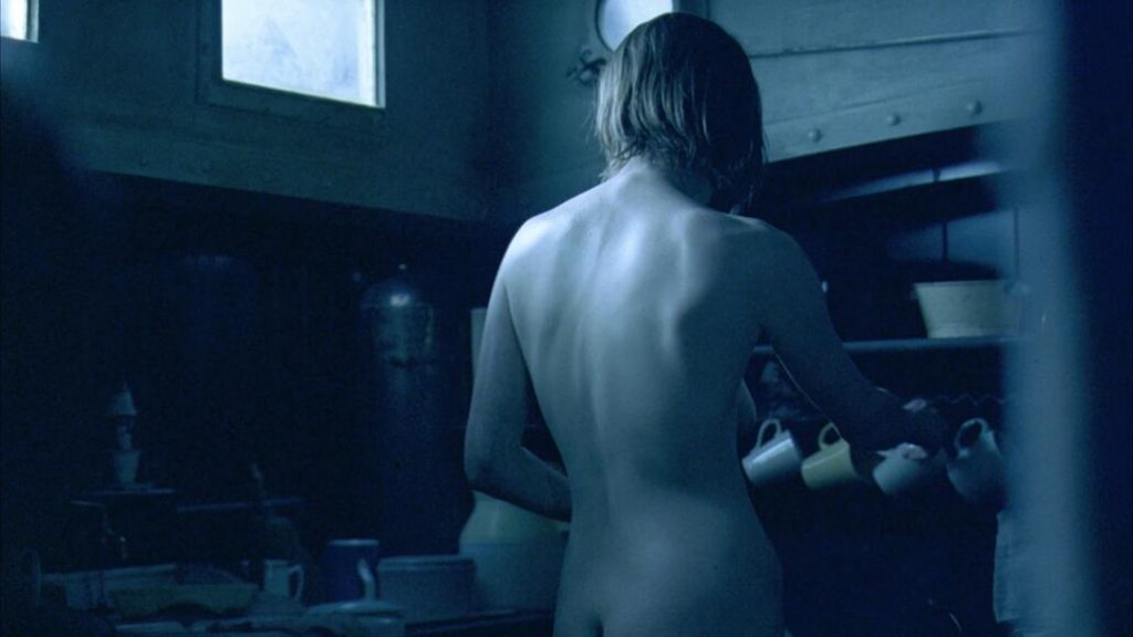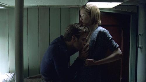 Tilda Swinton torse nu est allongée sur le dos dans son lit pendant qu’un homme regarde une mouche sur son sein pendant qu’elle dort. Elle se redresse ensuite et glisse la main sous les draps pour commencer à masturber l’homme. L’homme est Young Adam !