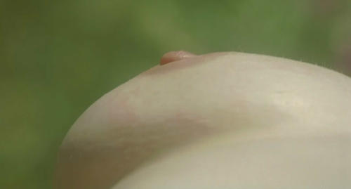 Young Karen Sillas topless in a hammock as she has her chest kissed all over while trying to resist Tilda Swinton’s temptations before finally giving in.