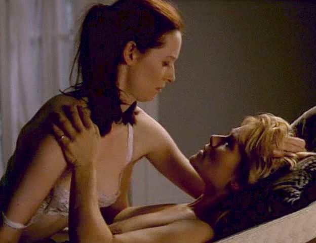 Karen Sillas having her bra removed, and then her left nipple squeezed, kissed, licked, and fondled as she cuddles in a hammock with her lesbian lover Tilda Swinton.