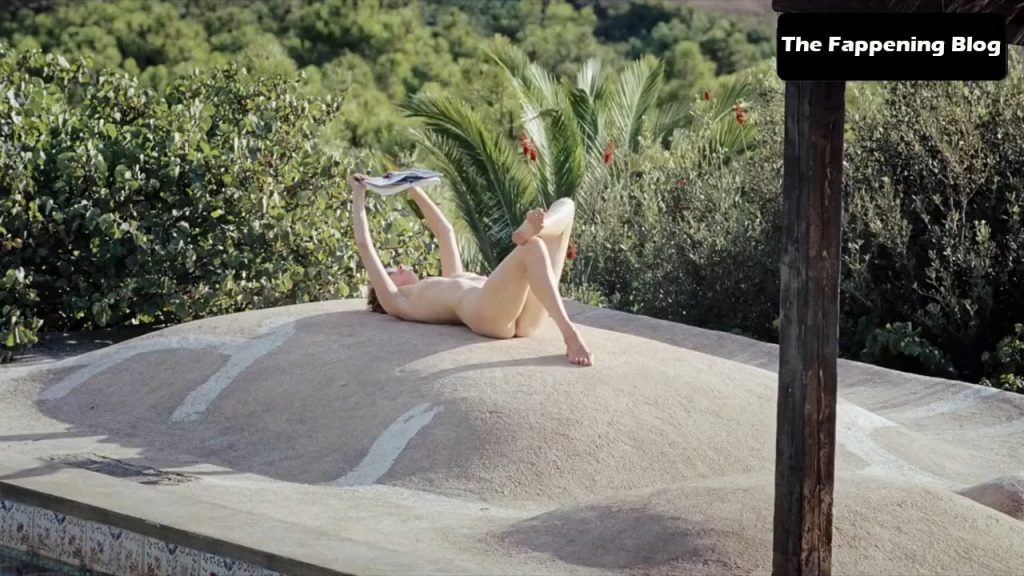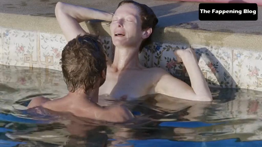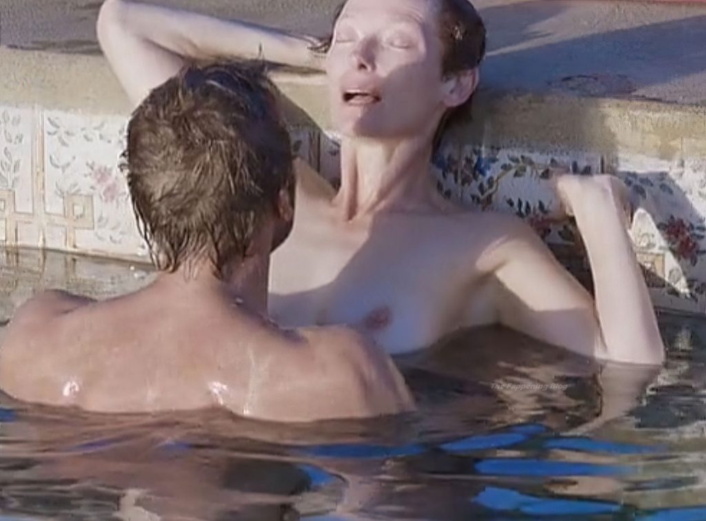 Tilda Swinton is lying fully nude on her back beside a swimming pool, holding a book above her head as she reads while sunbathing. We then see Tilda and a guy having sex in the water, Tilda showing her breasts again as she leans against the side of the pool with the guy in front of her.