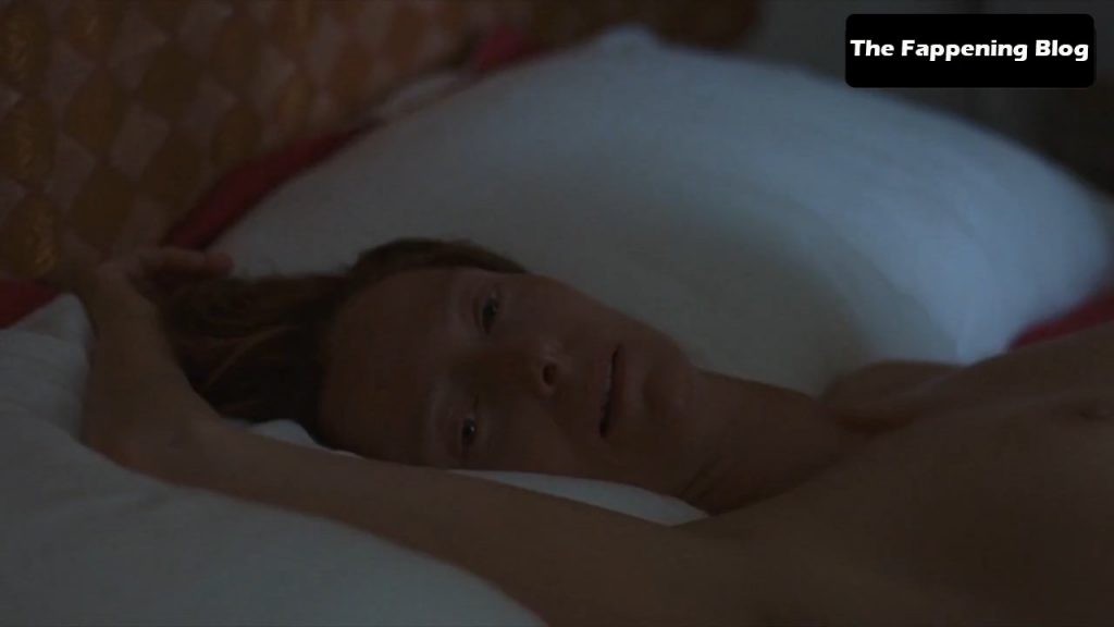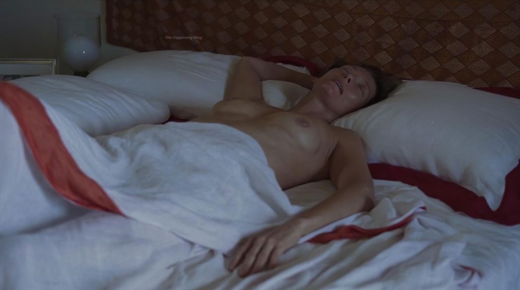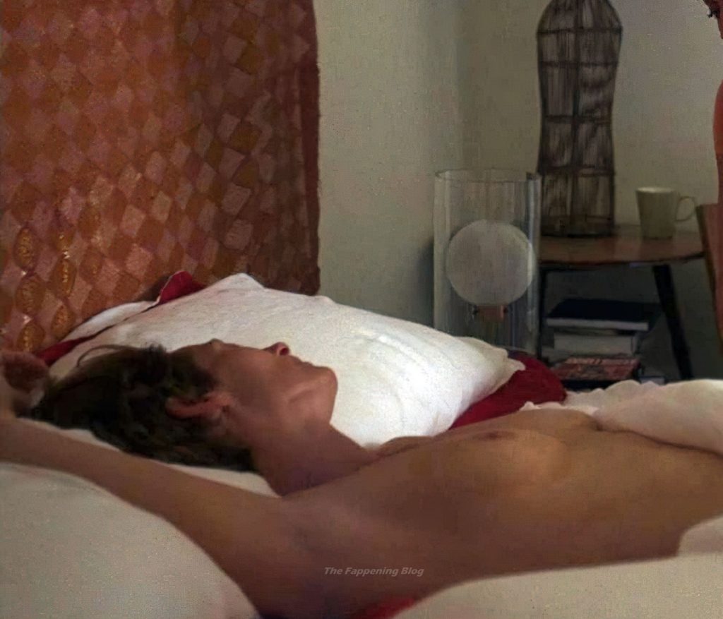 Tilda Swinton is lying topless in bed, her breasts exposed for a long time as she talks to a guy next to her.