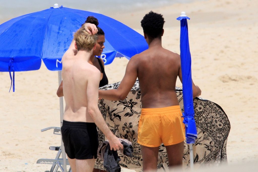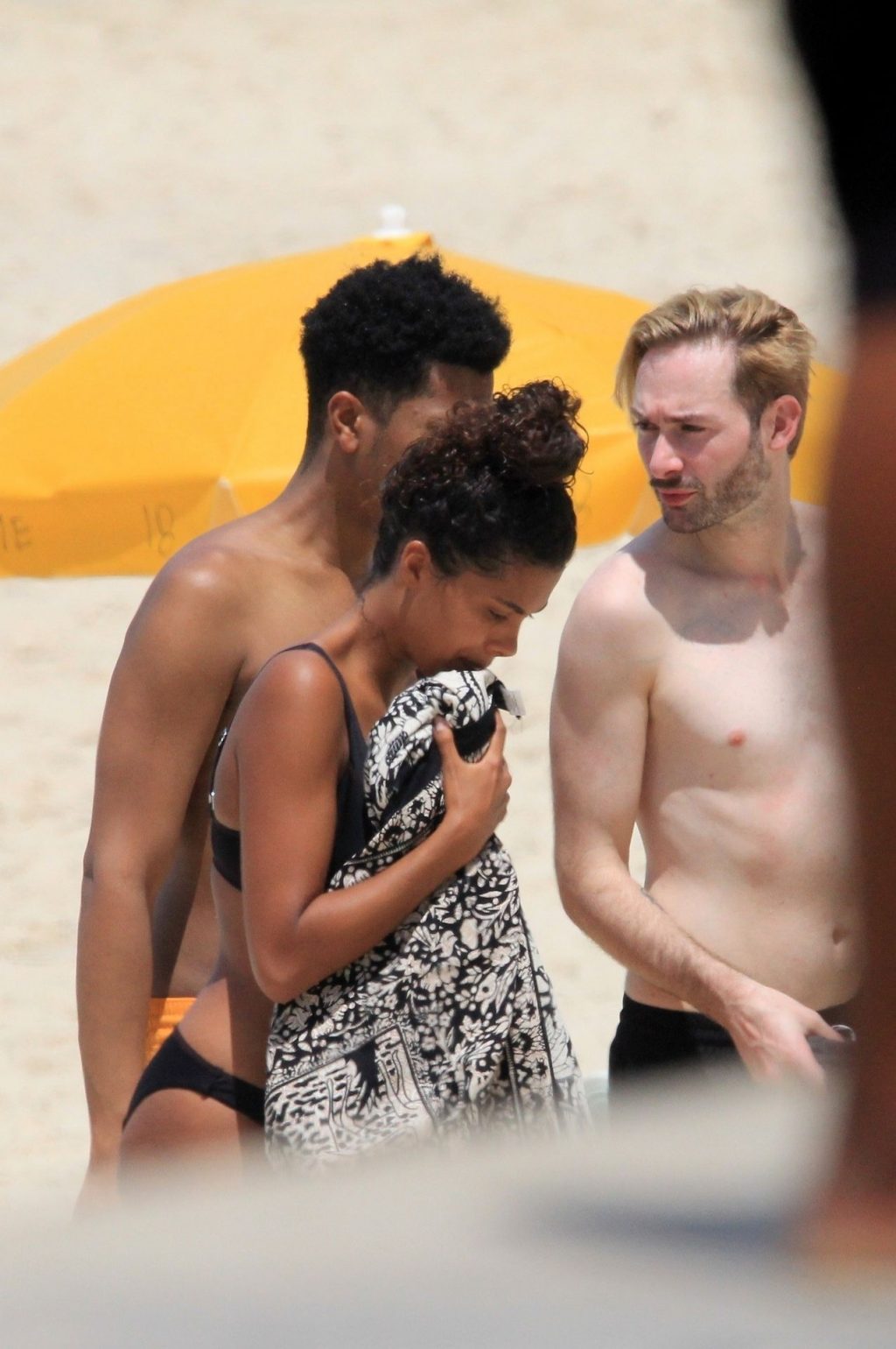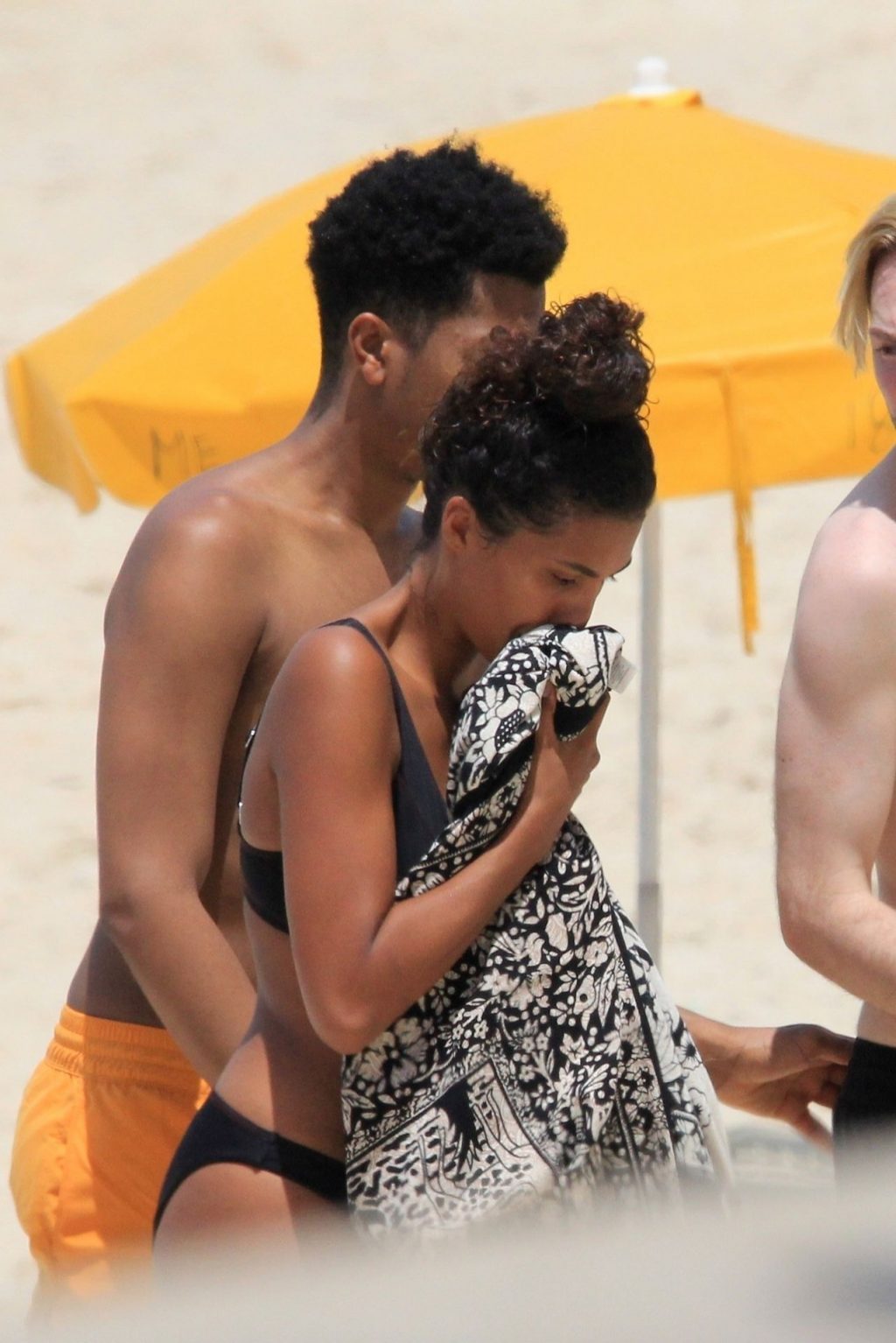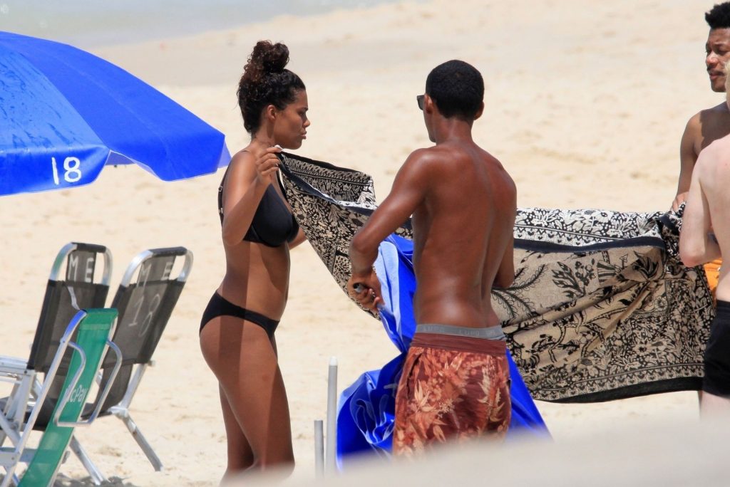 La femme mannequin de Vincent Cassel, Tina Kunakey, est accompagnée de deux amies pour une journée à la plage à Rio de Janeiro, le 24/02/2020. Le mannequin, portant un bikini noir, plie une serviette de plage avant de quitter la plage avec ses deux amies.