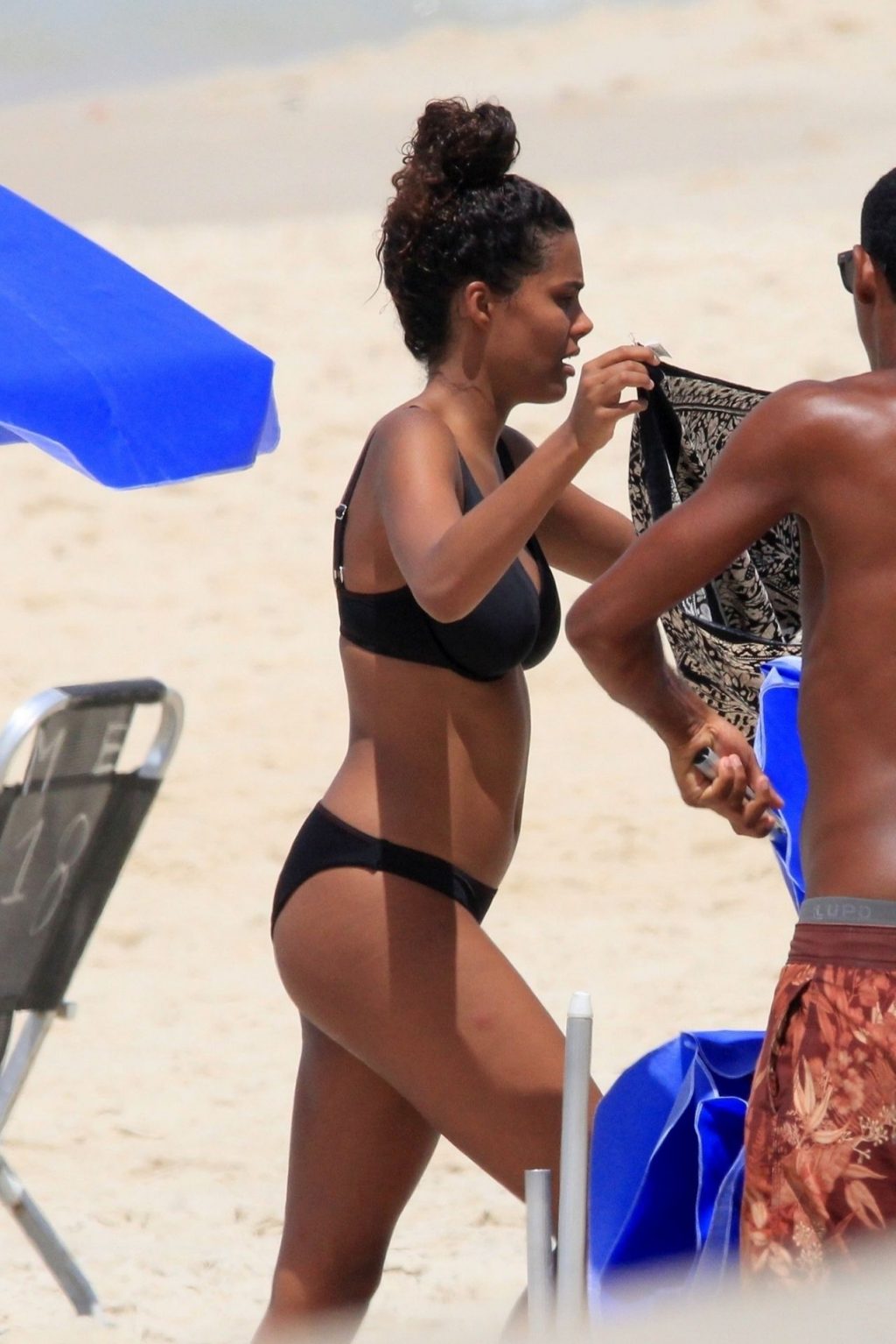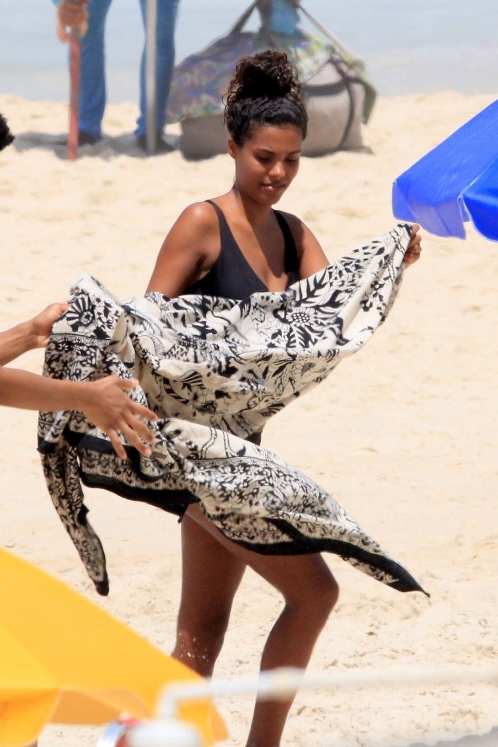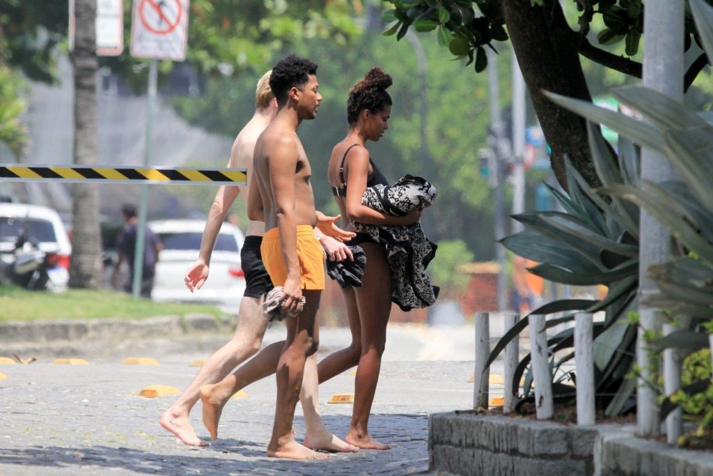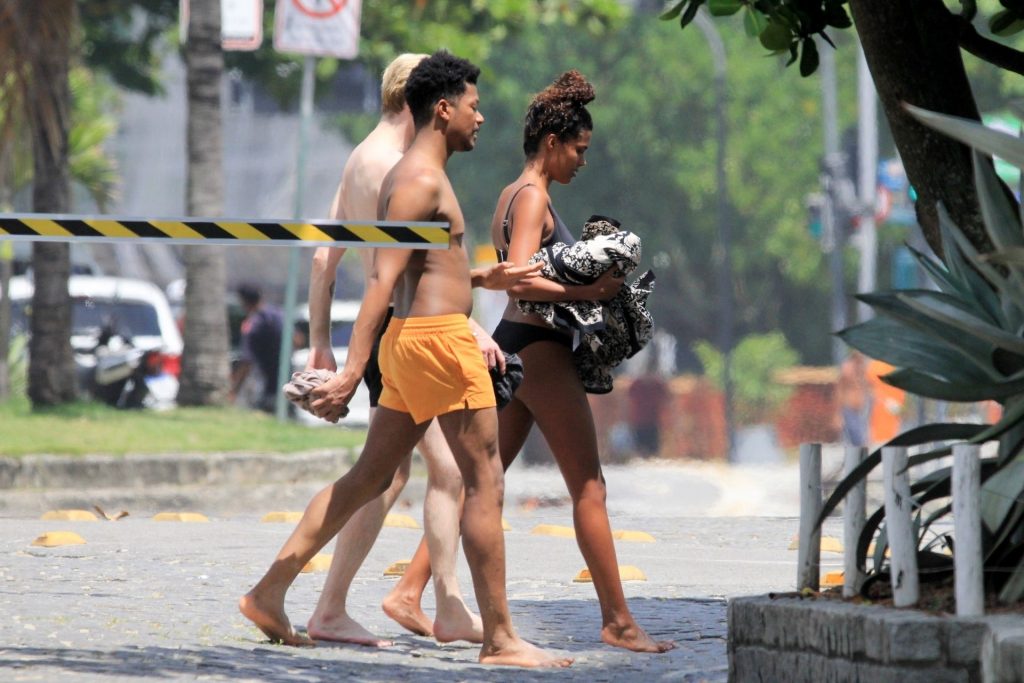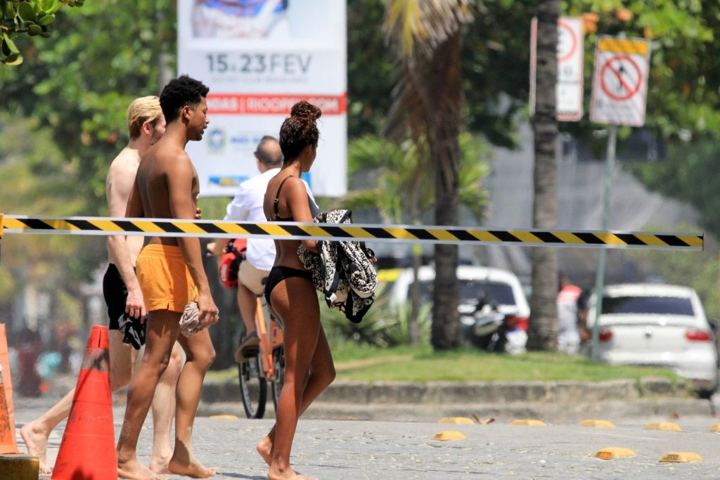 La femme mannequin de Vincent Cassel, Tina Kunakey, est accompagnée de deux amies pour une journée à la plage à Rio de Janeiro, le 24/02/2020. Le mannequin, portant un bikini noir, plie une serviette de plage avant de quitter la plage avec ses deux amies.
