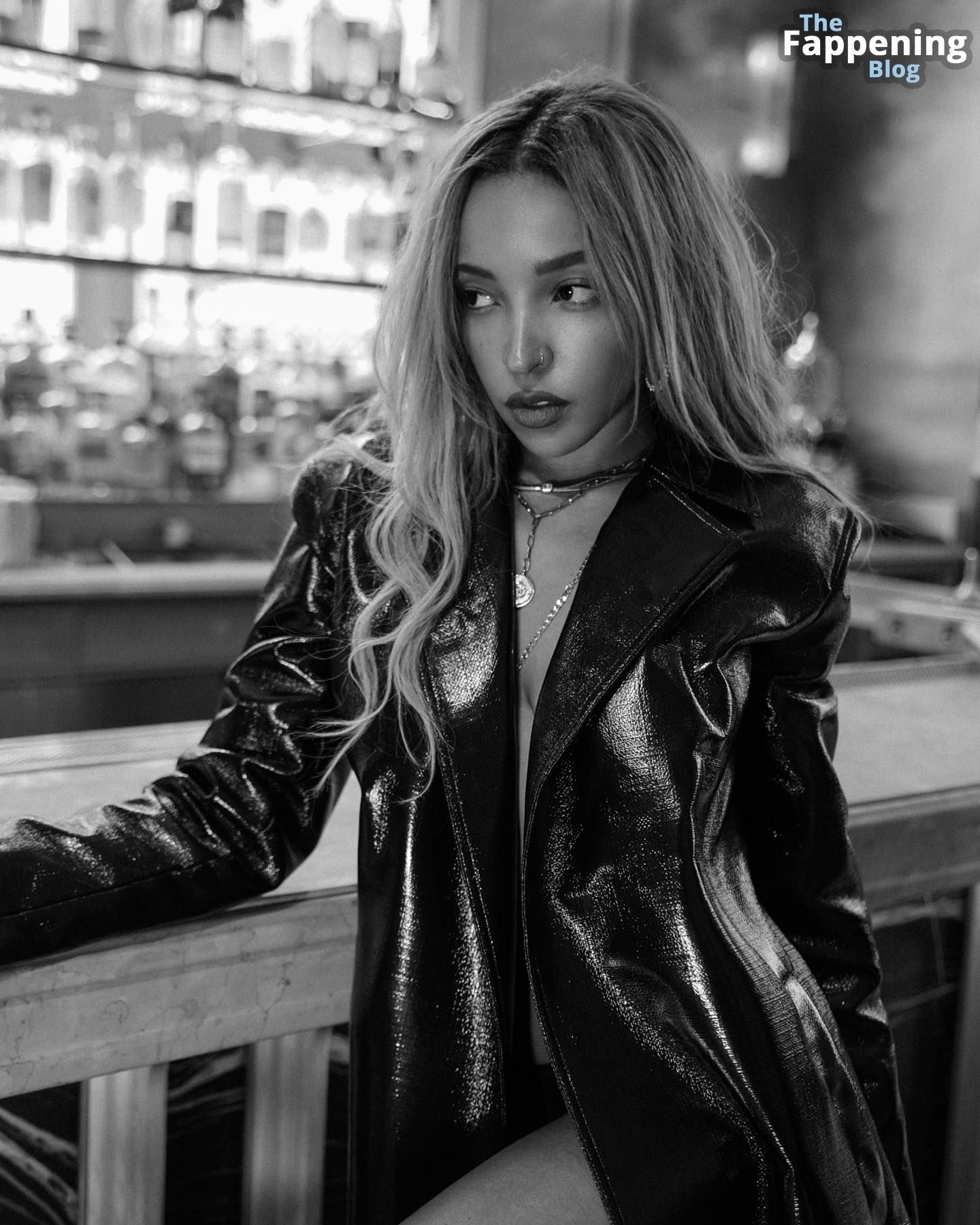 Tinashe domine le jeu, affichant un décolleté féroce, saisissant ses seins, montrant ses jambes de tueuse, et arborant ce corps de danseuse serré dans un string brûlant et une veste ouverte.