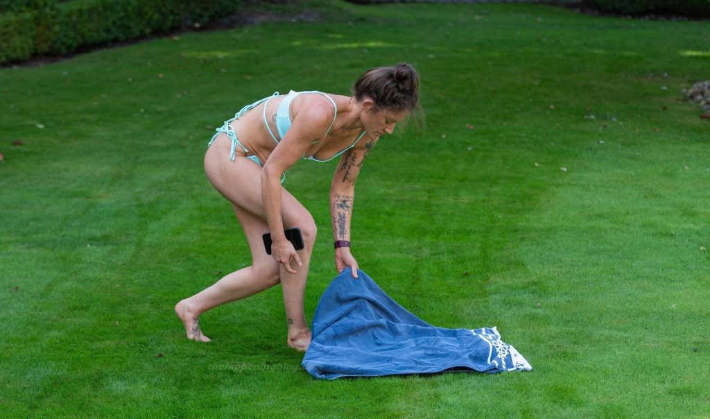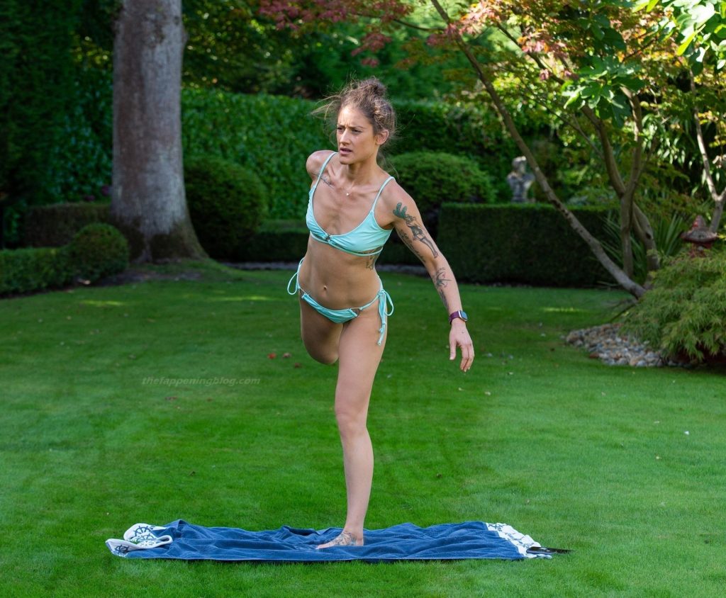 La coach personnelle qualifiée lancera son site de fitness début de l’année prochaine. Katie porte un bikini bleu et est vue dans différentes positions de yoga.