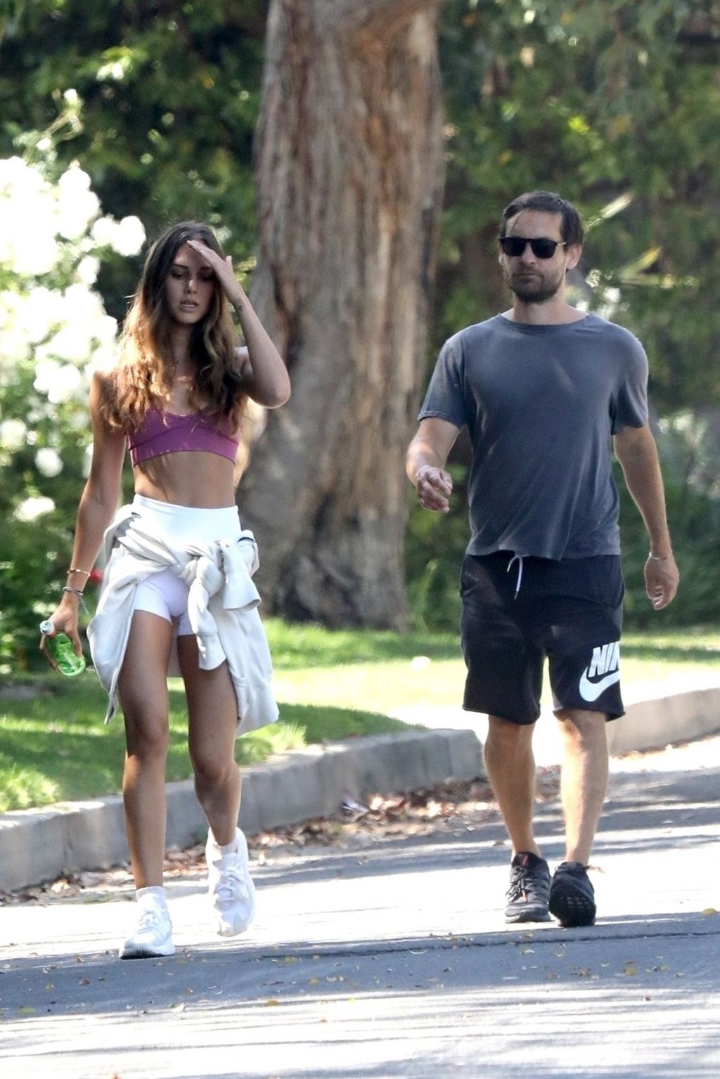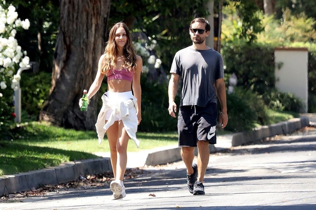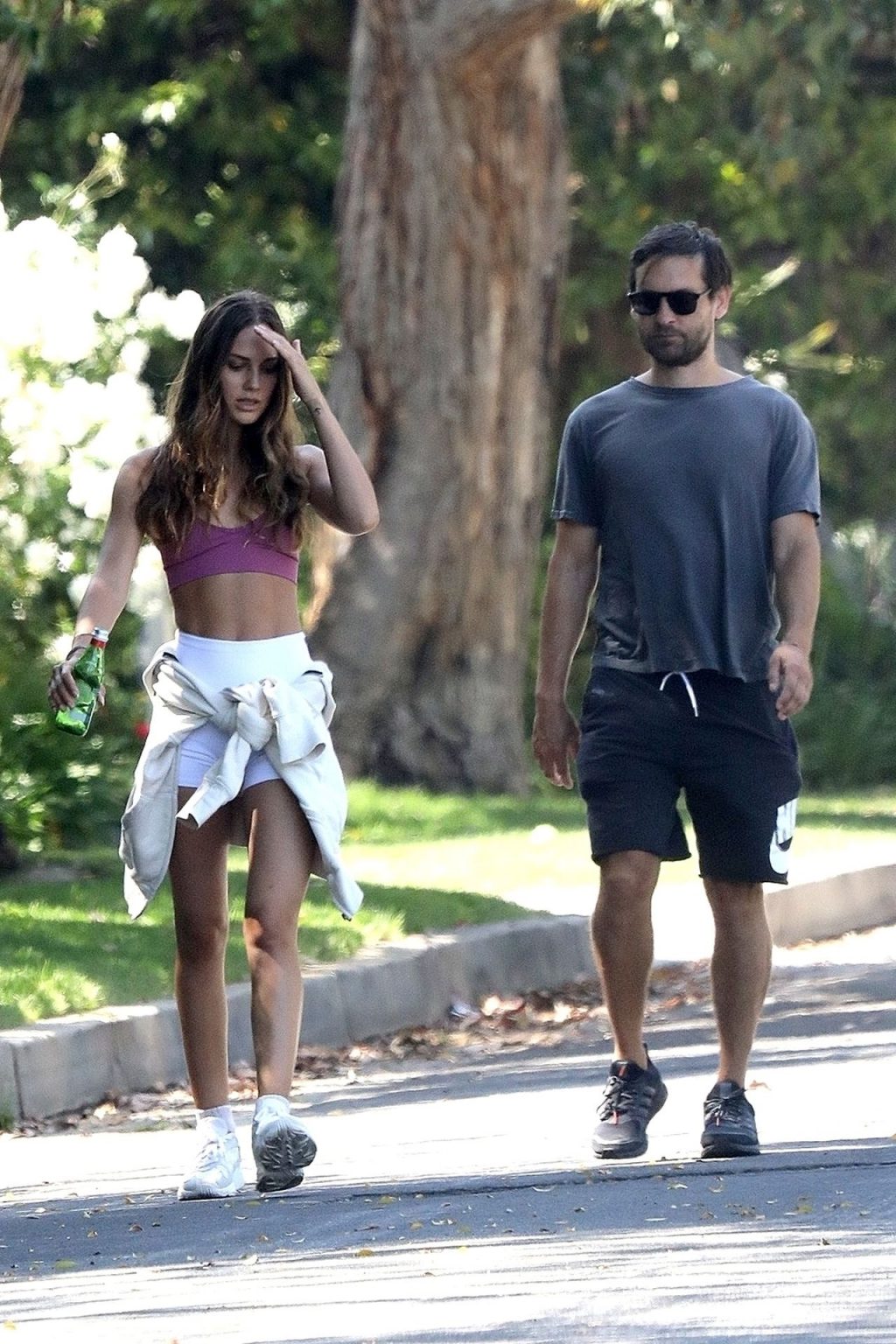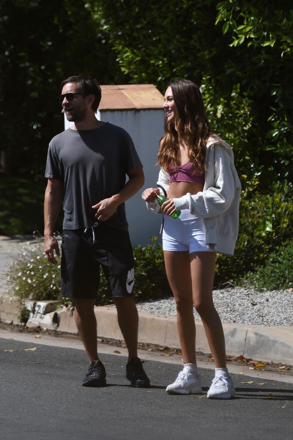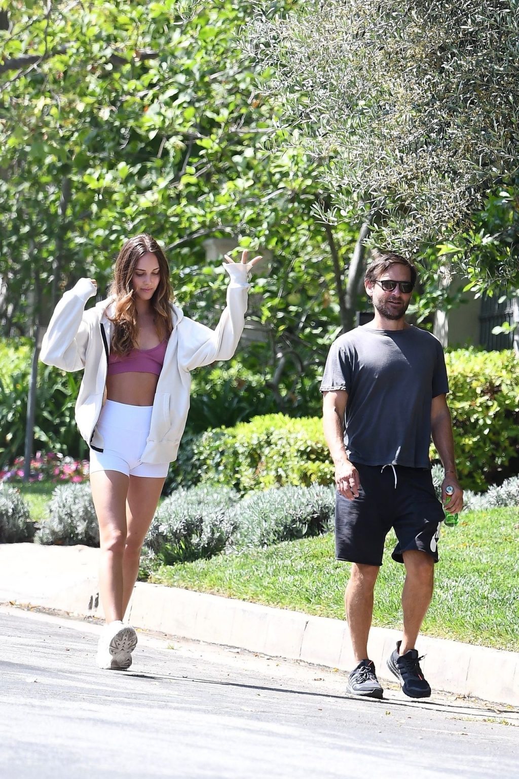 L’acteur Tobey Maguire et sa petite amie Tatiana Dieteman sortent pour une promenade décontractée afin de faire leur exercice quotidien pendant le confinement à Brentwood, le 10/05/2020.