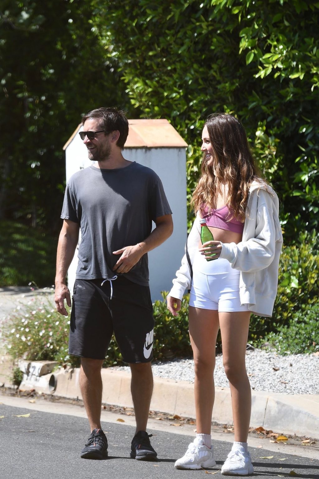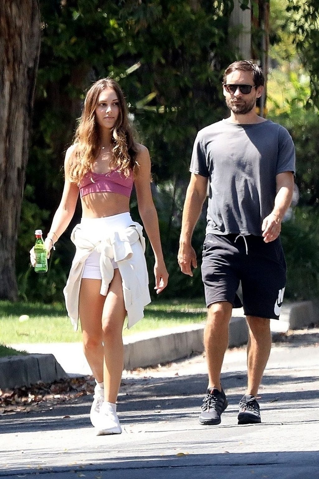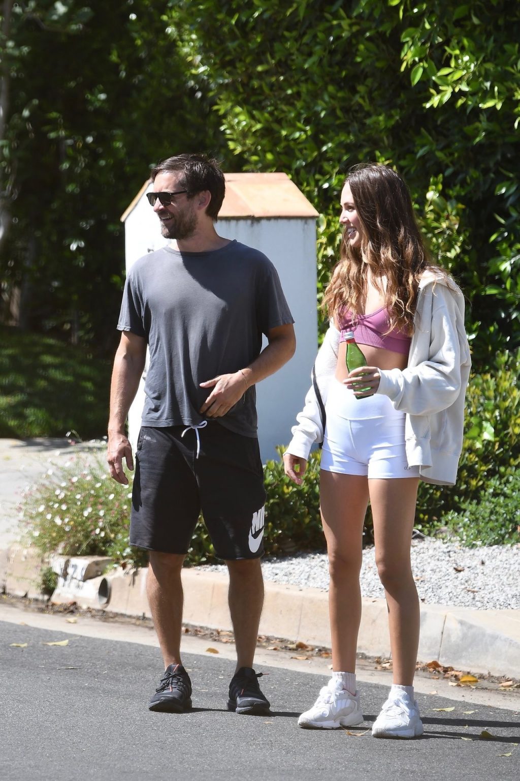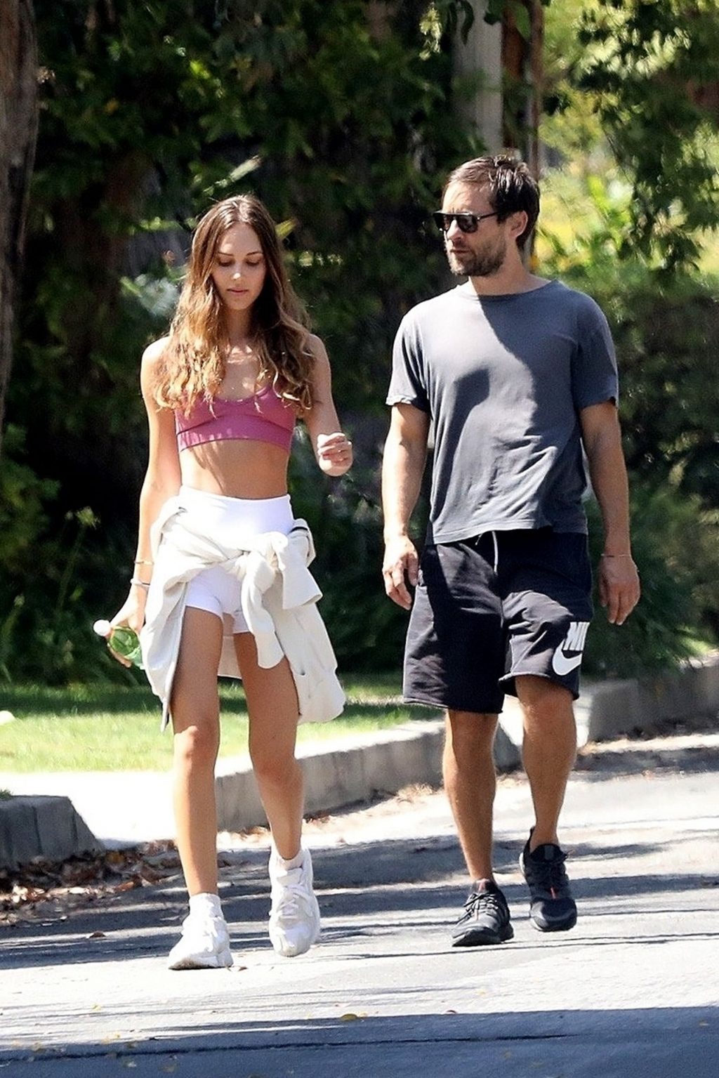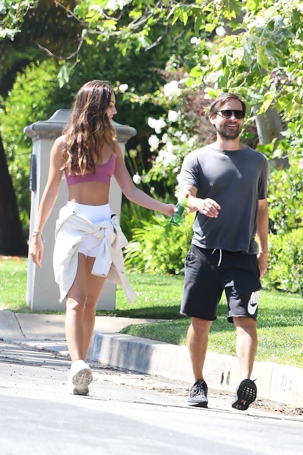 L’acteur Tobey Maguire et sa petite amie Tatiana Dieteman sortent pour une promenade décontractée afin de faire leur exercice quotidien pendant le confinement à Brentwood, le 10/05/2020.