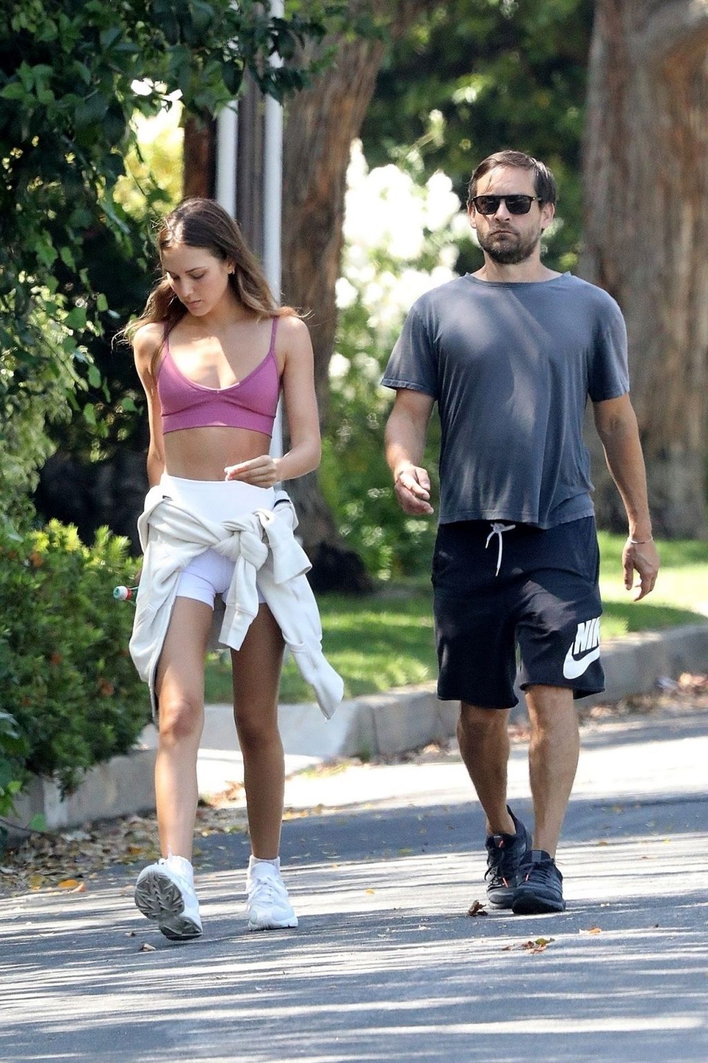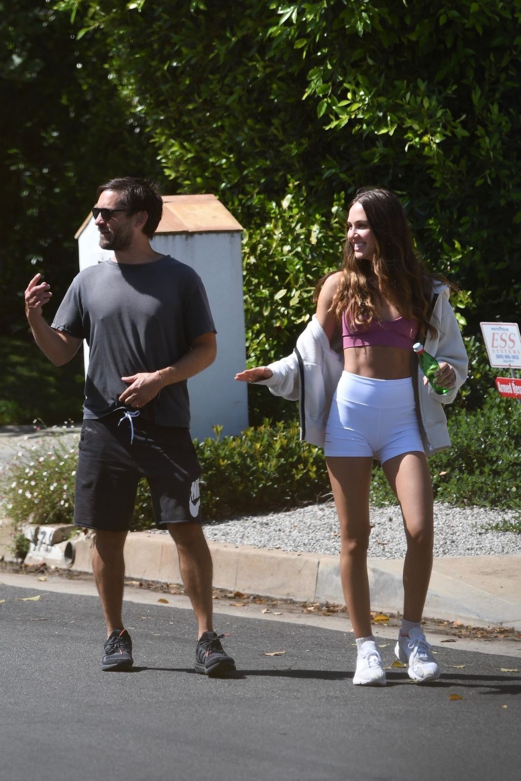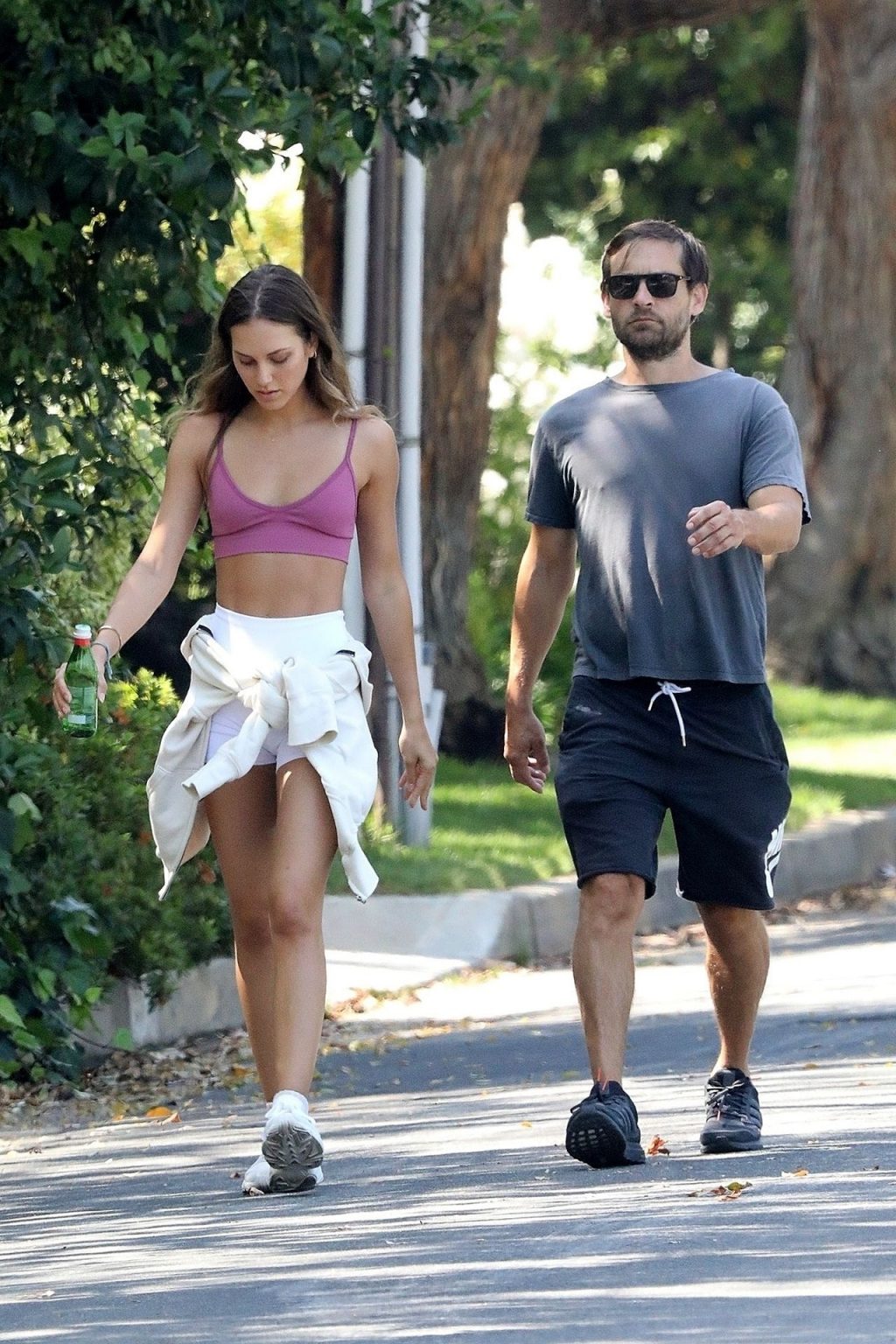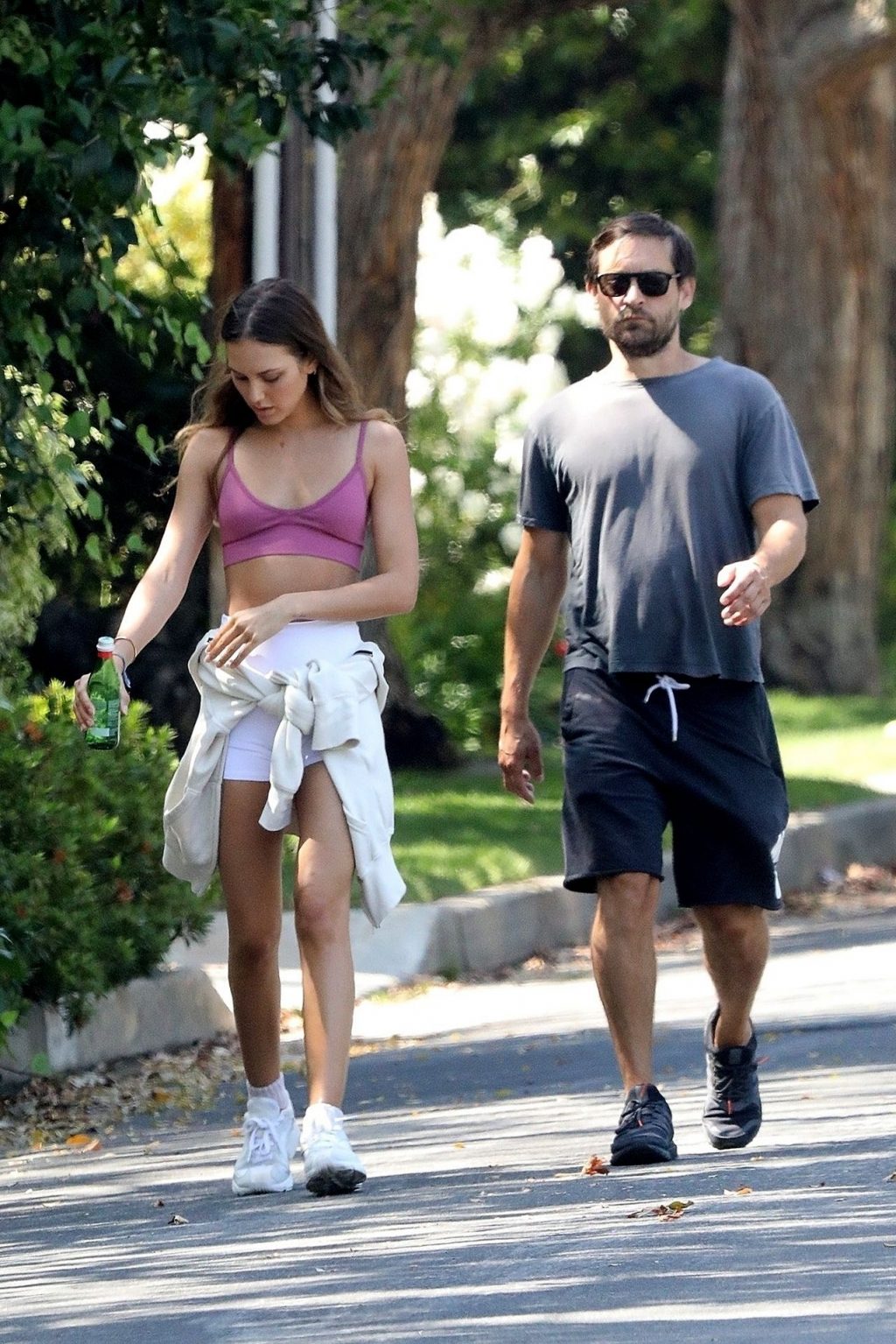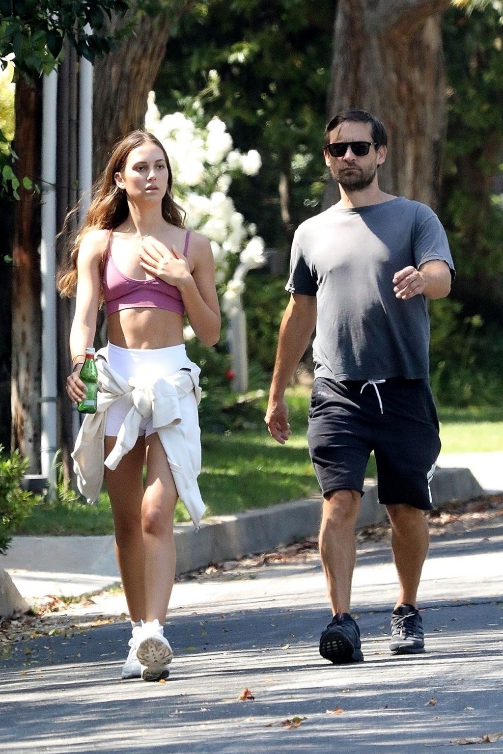 L’acteur Tobey Maguire et sa petite amie Tatiana Dieteman sortent pour une promenade décontractée afin de faire leur exercice quotidien pendant le confinement à Brentwood, le 10/05/2020.