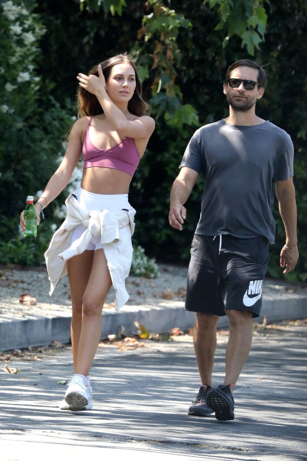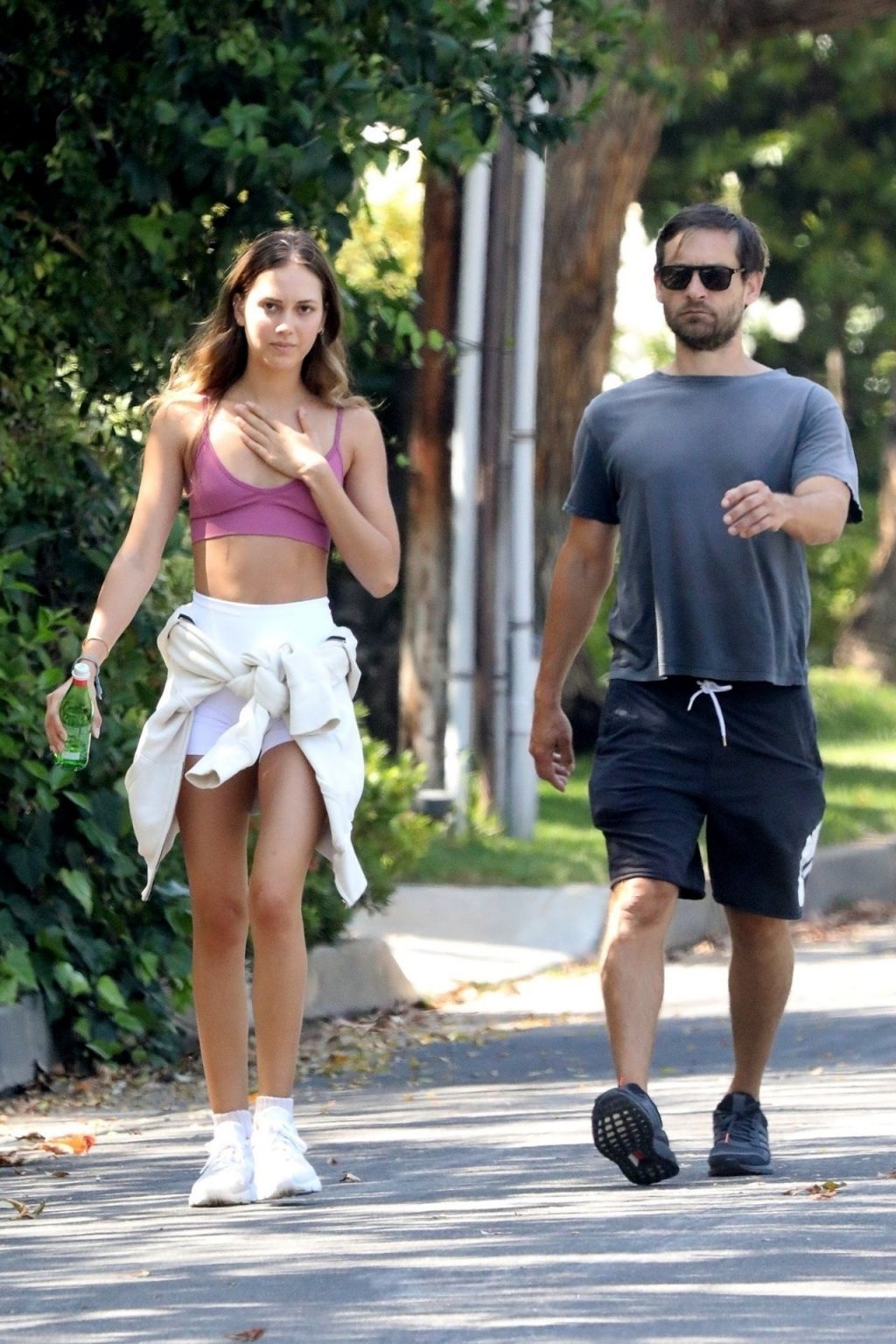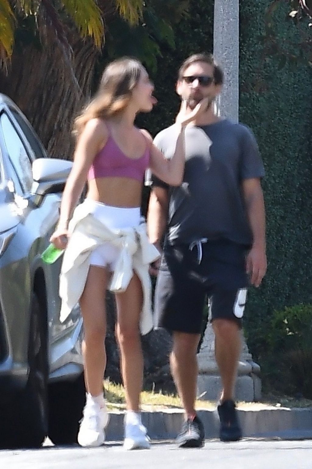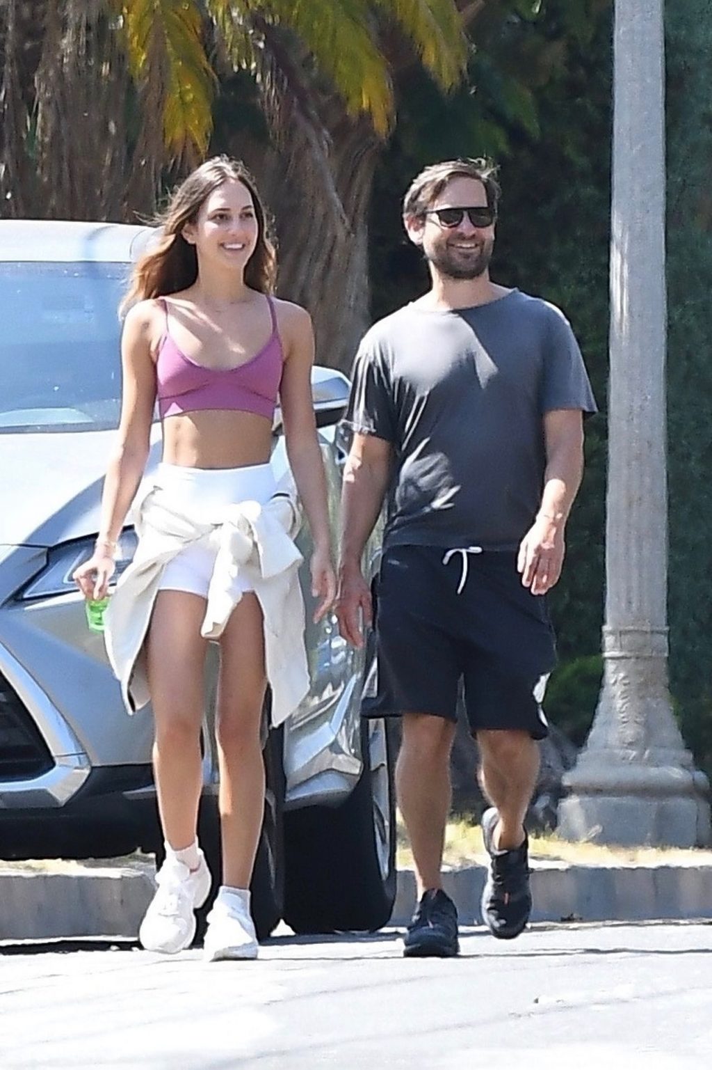 L’acteur Tobey Maguire et sa petite amie Tatiana Dieteman sortent pour une promenade décontractée afin de faire leur exercice quotidien pendant le confinement à Brentwood, le 10/05/2020.