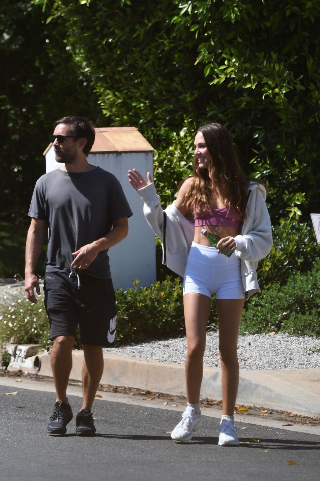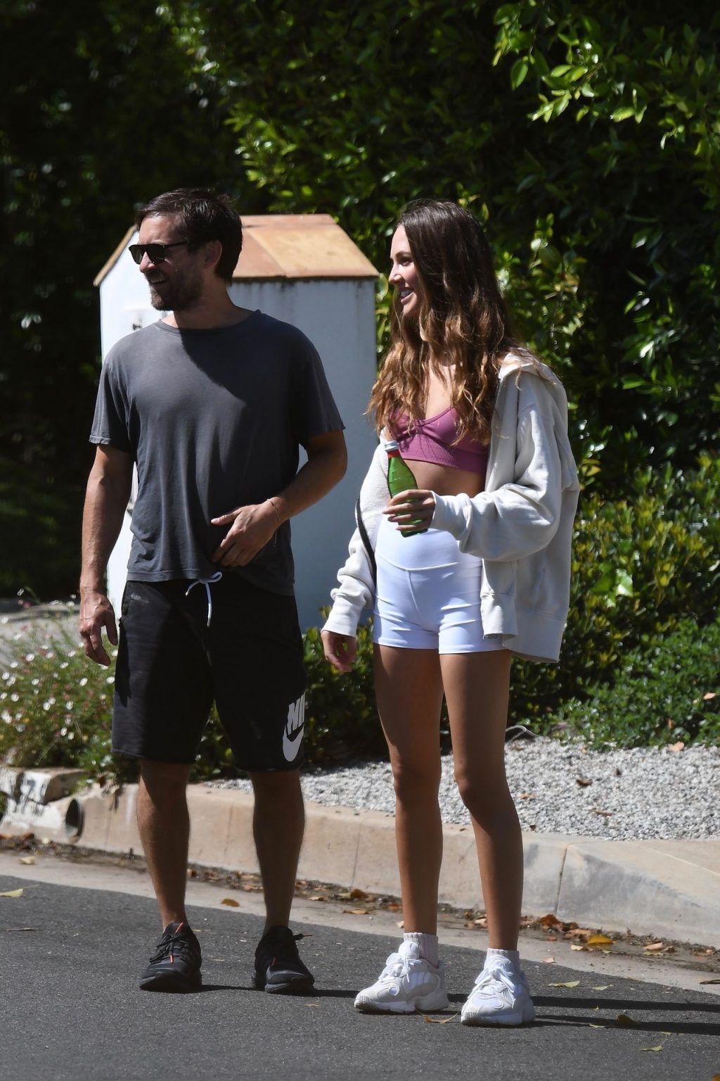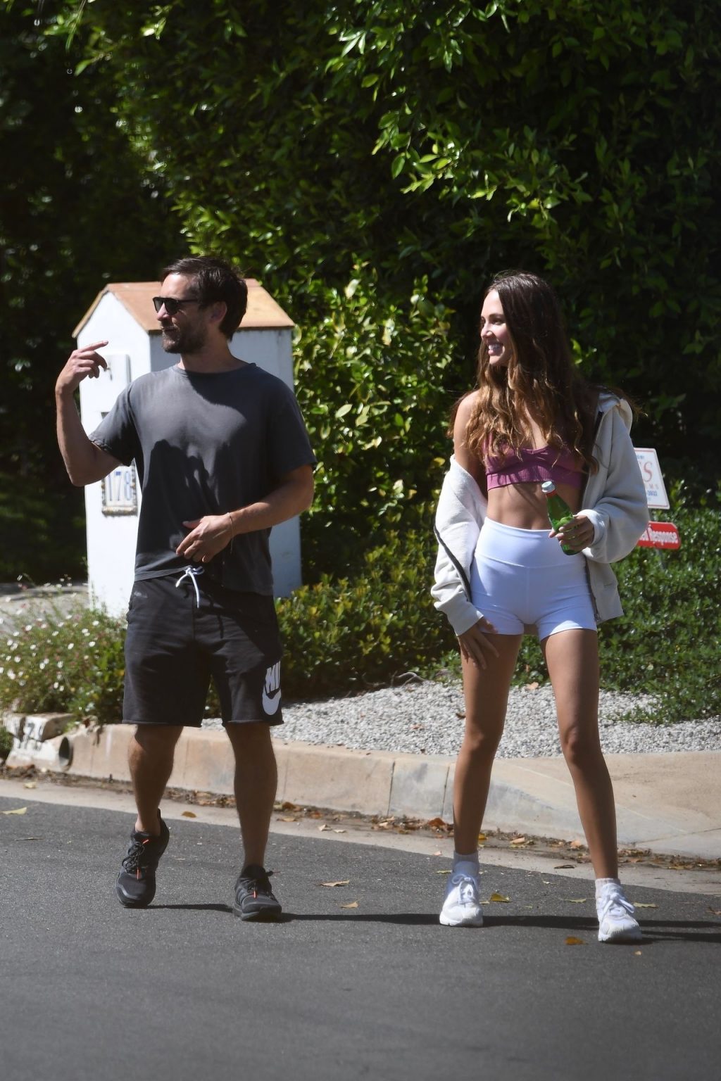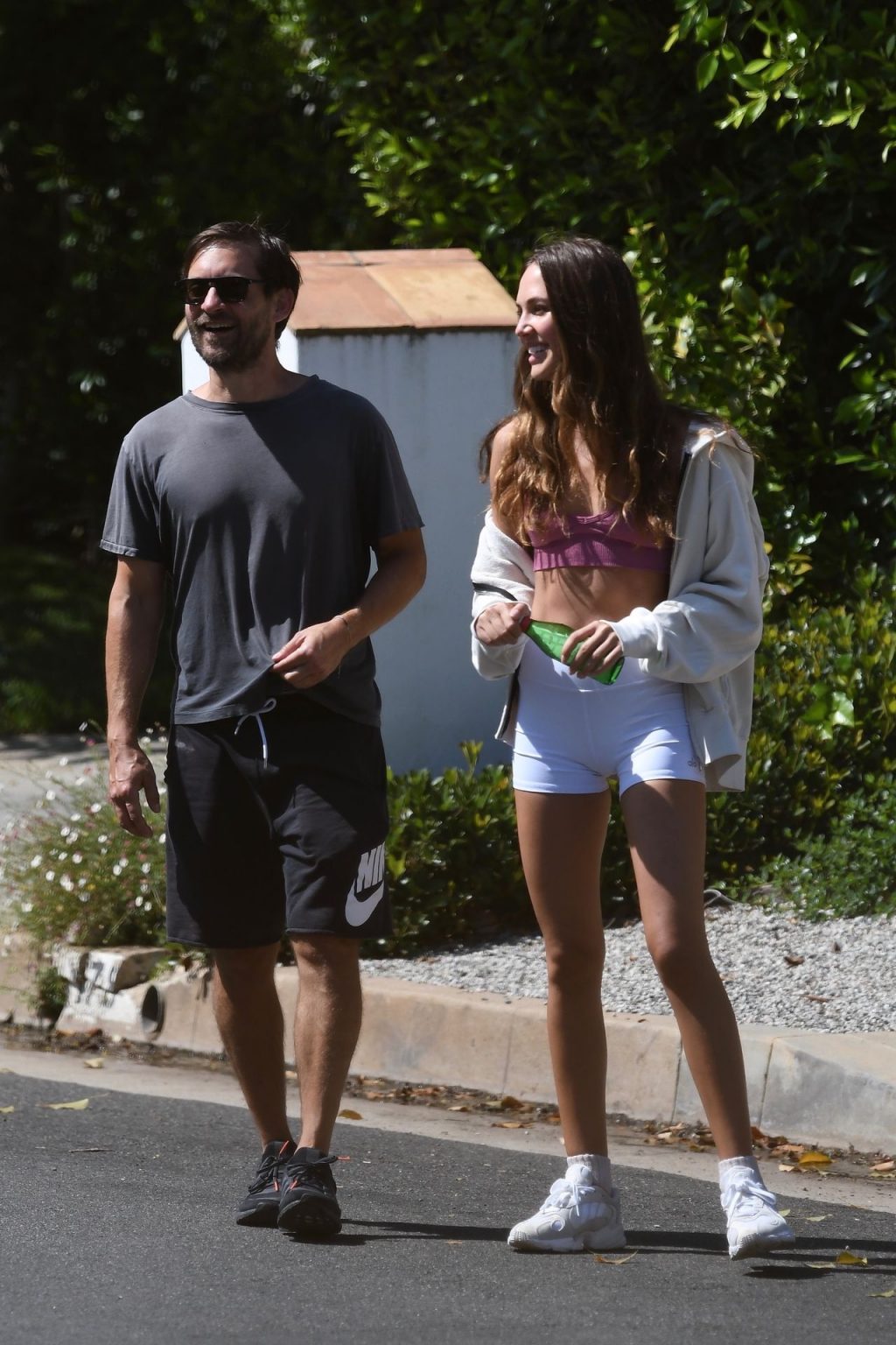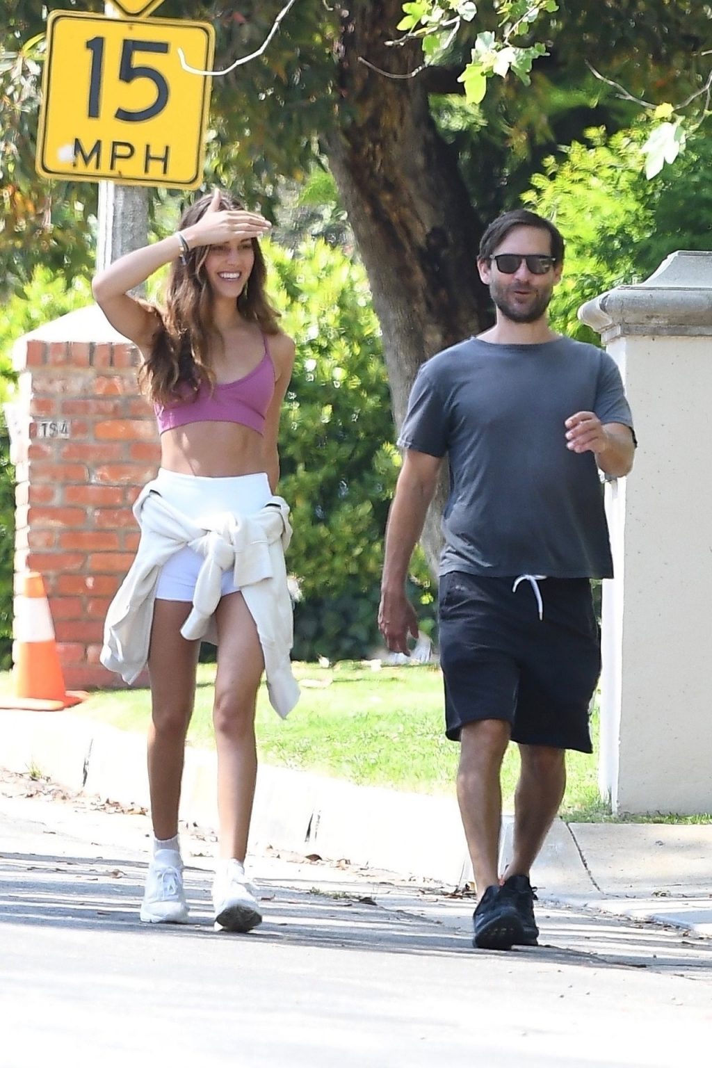 L’acteur Tobey Maguire et sa petite amie Tatiana Dieteman sortent pour une promenade décontractée afin de faire leur exercice quotidien pendant le confinement à Brentwood, le 10/05/2020.