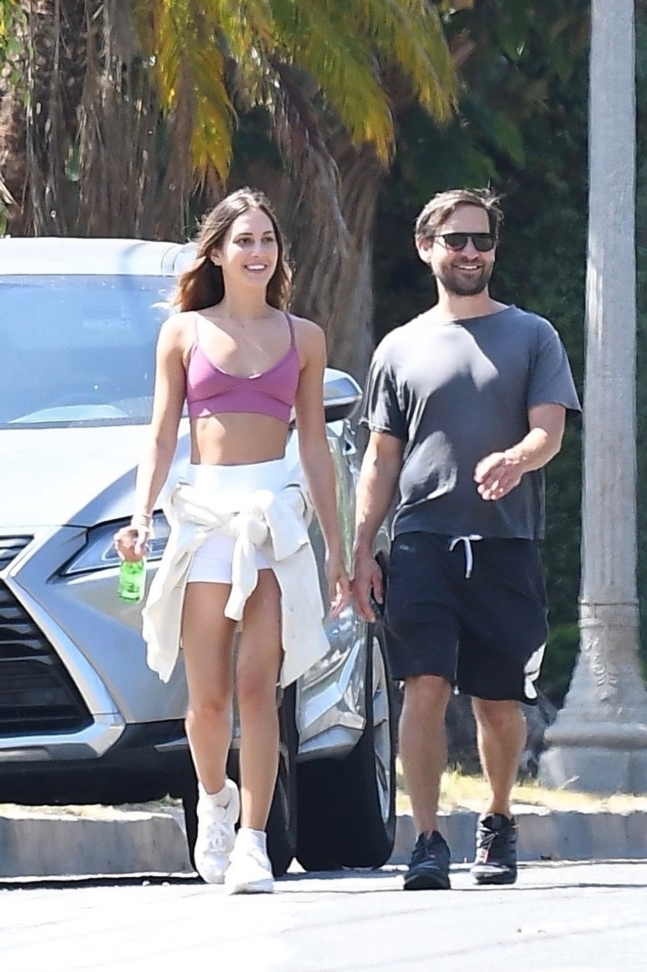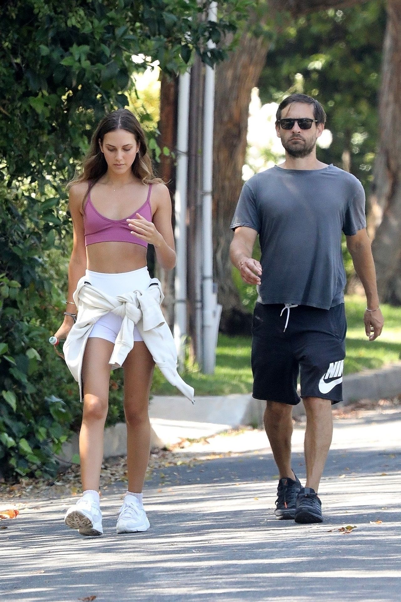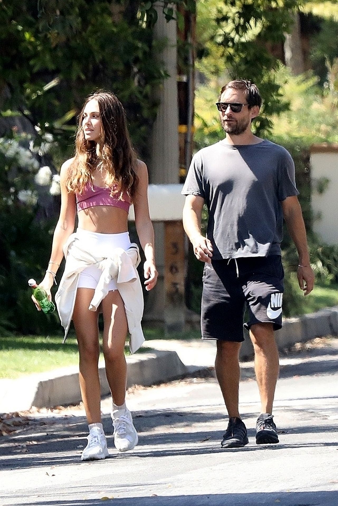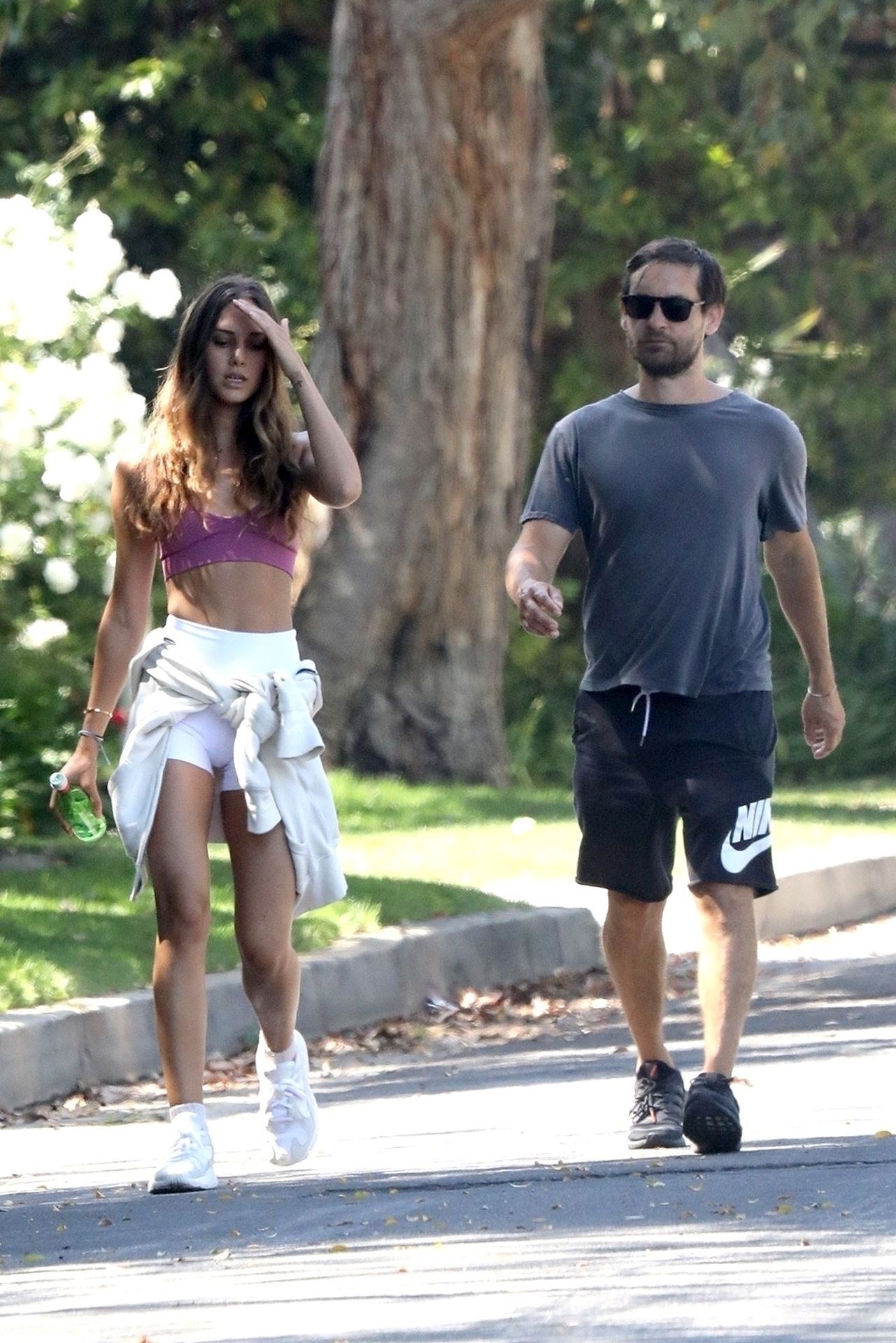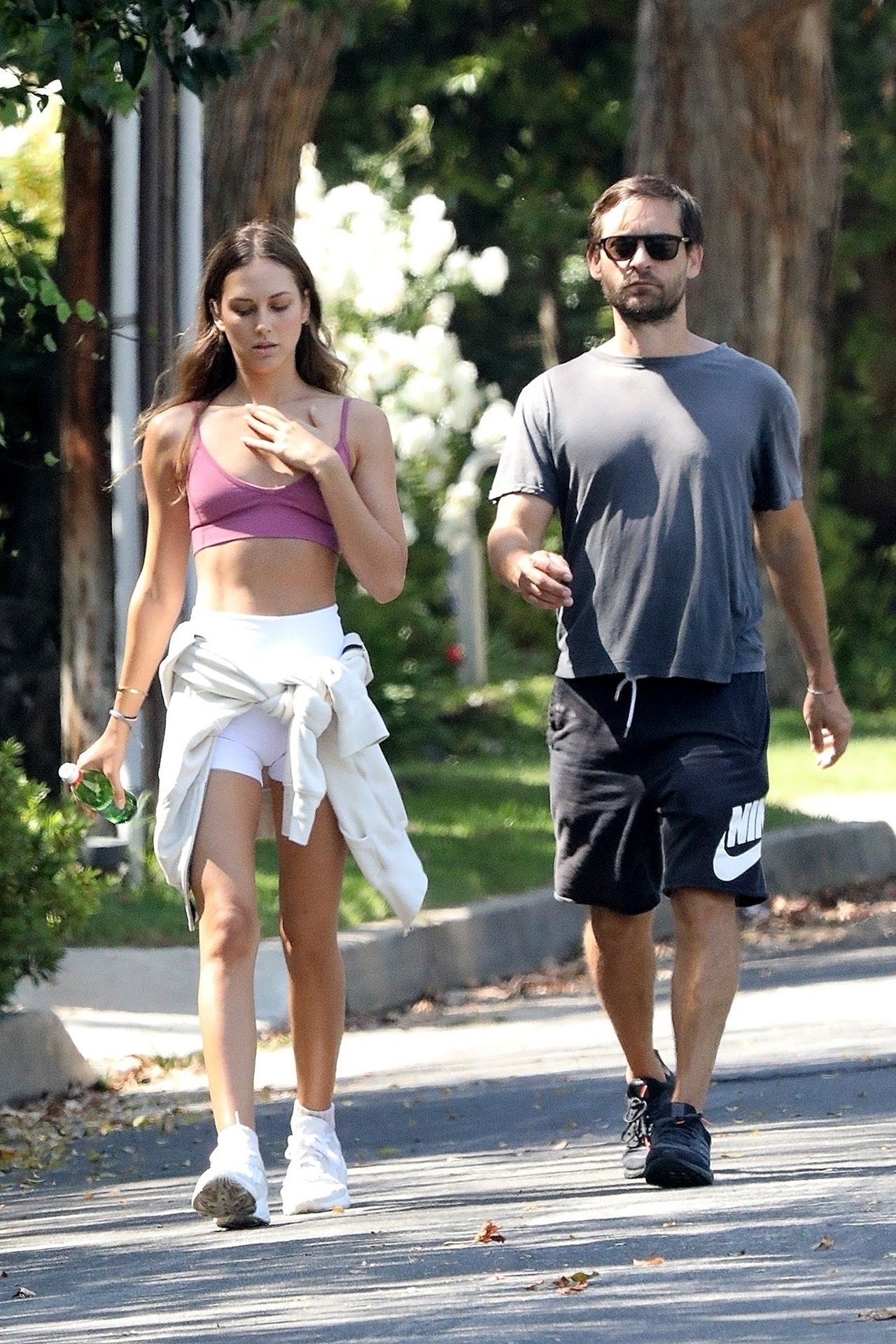 L’acteur Tobey Maguire et sa petite amie Tatiana Dieteman sortent pour une promenade décontractée afin de faire leur exercice quotidien pendant le confinement à Brentwood, le 10/05/2020.