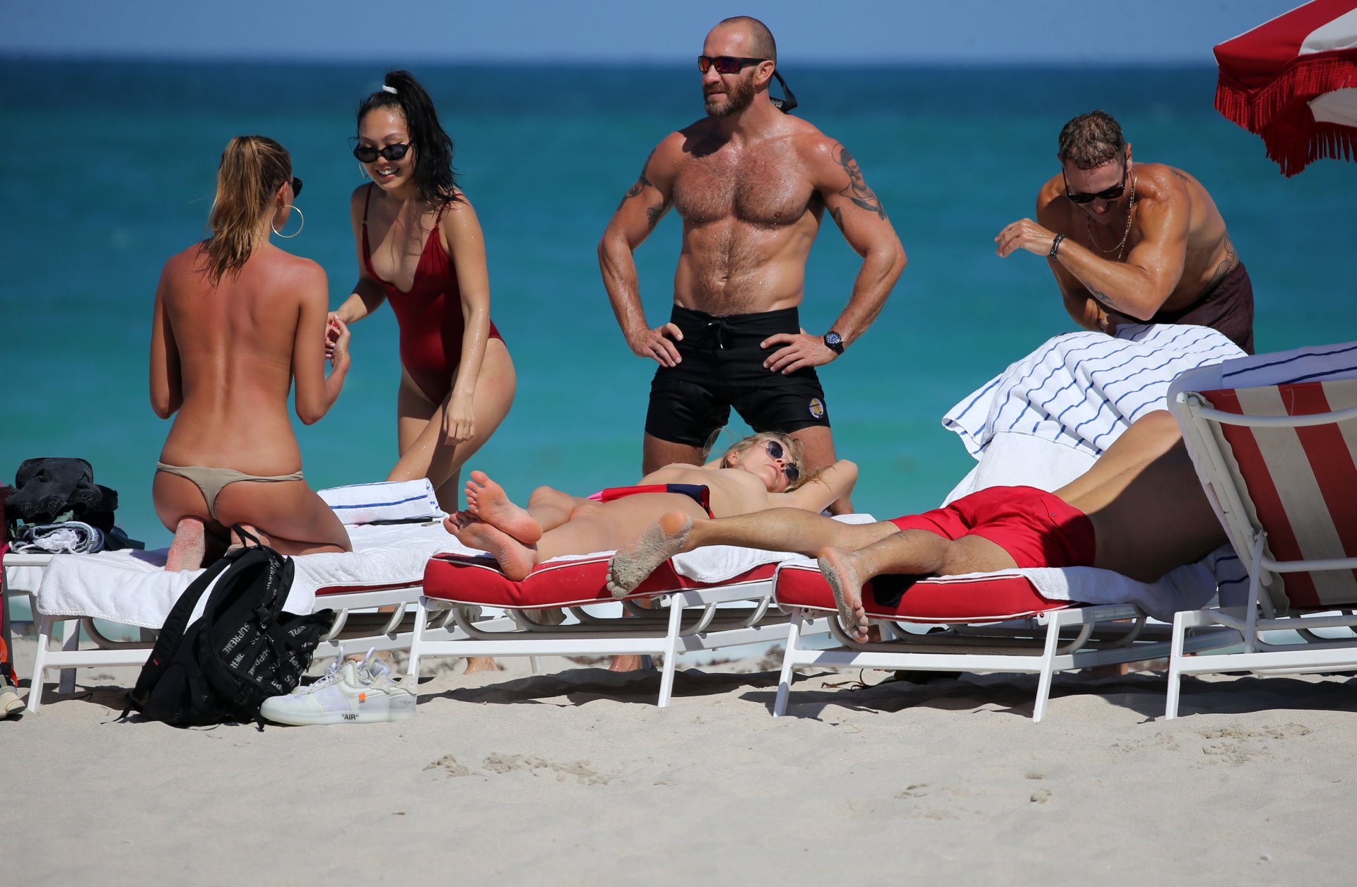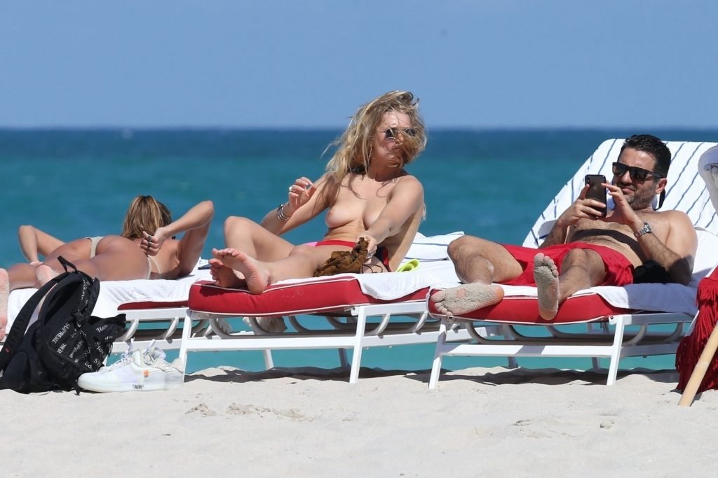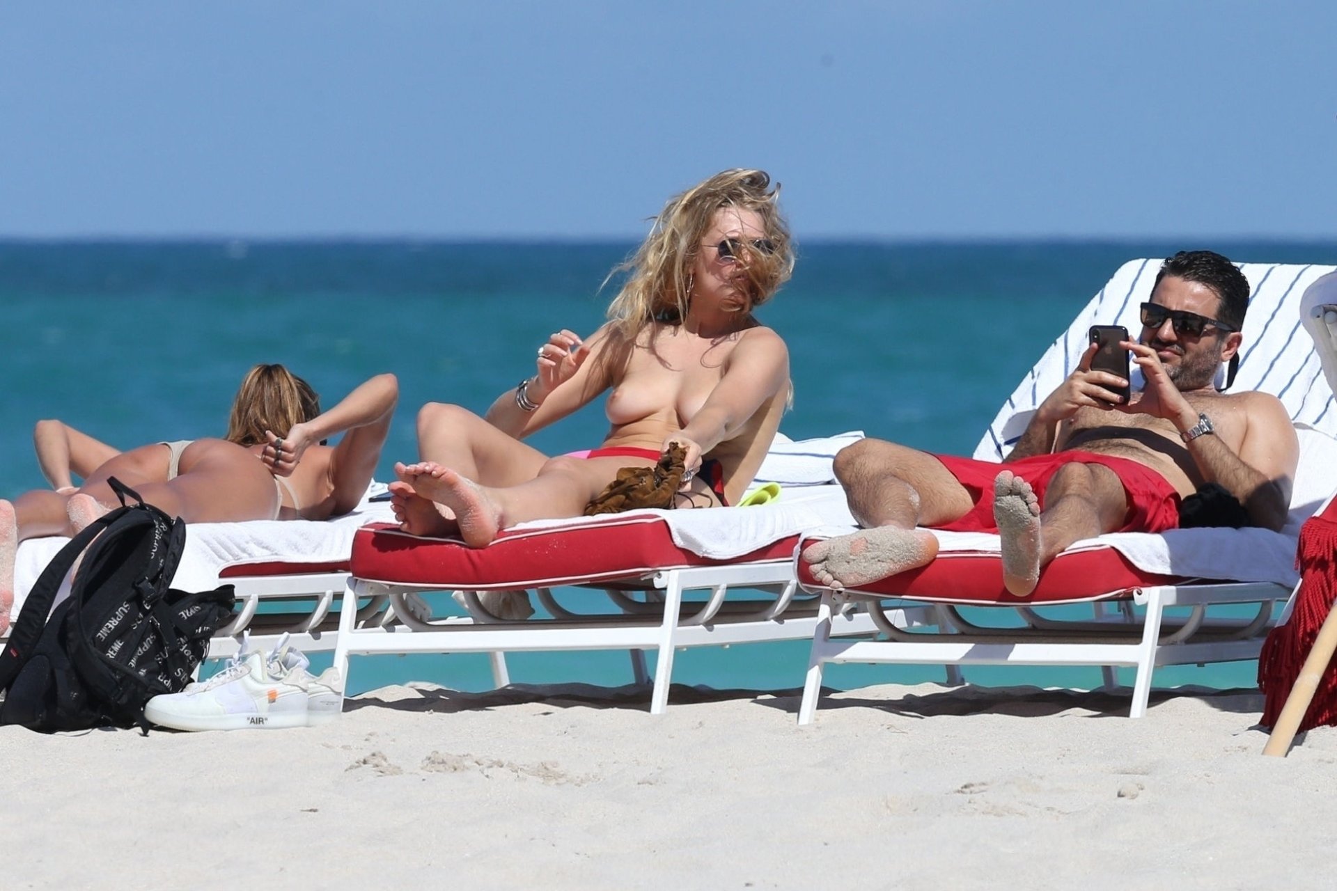 Le mannequin et actrice Toni Garrn se rend à la plage avec des amis pour profiter du soleil pendant le week-end de Pâques à Miami, le 01/04/2018. Toni a choisi d’enlever son haut pour la journée, exposant ainsi sa poitrine nue. Peut-être que Toni ne veut tout simplement pas de marques de bronzage.