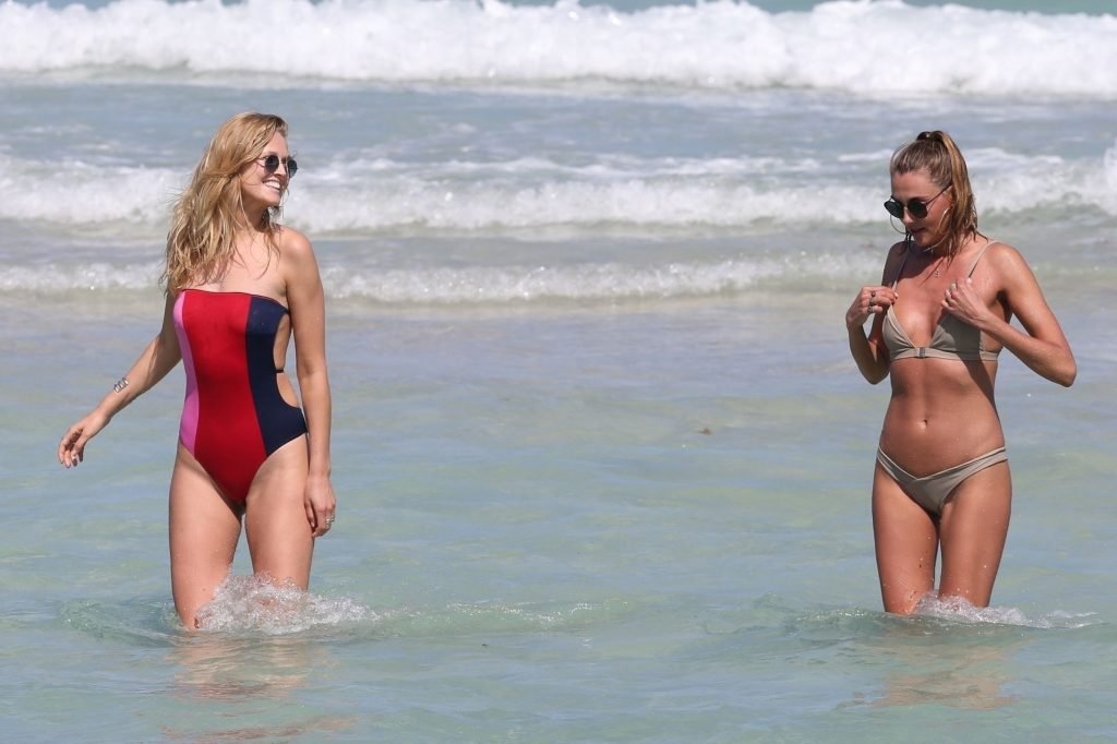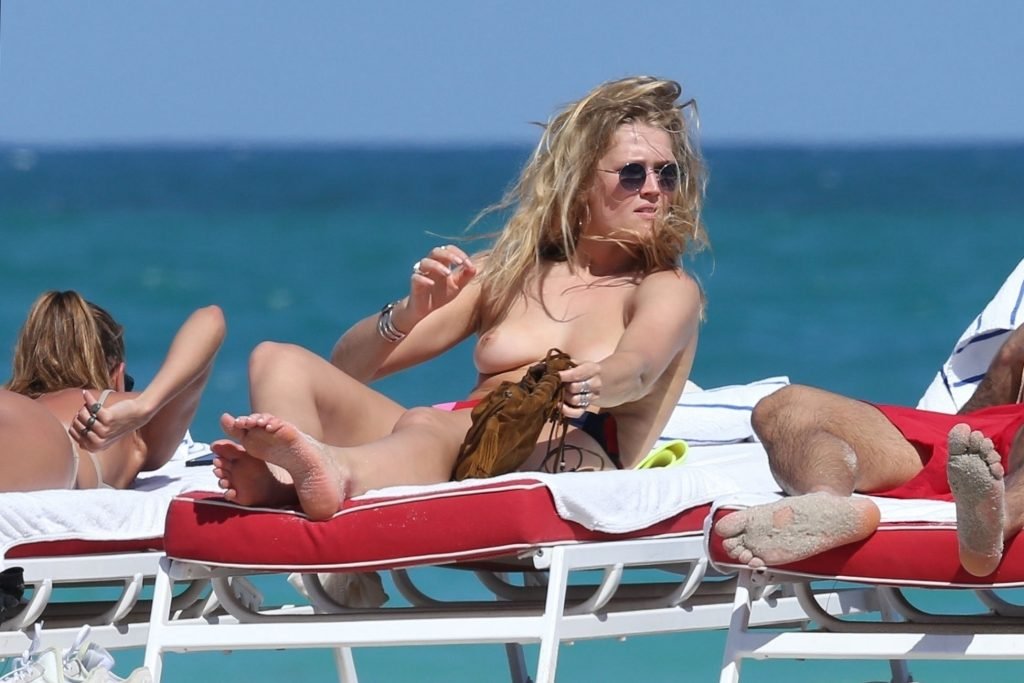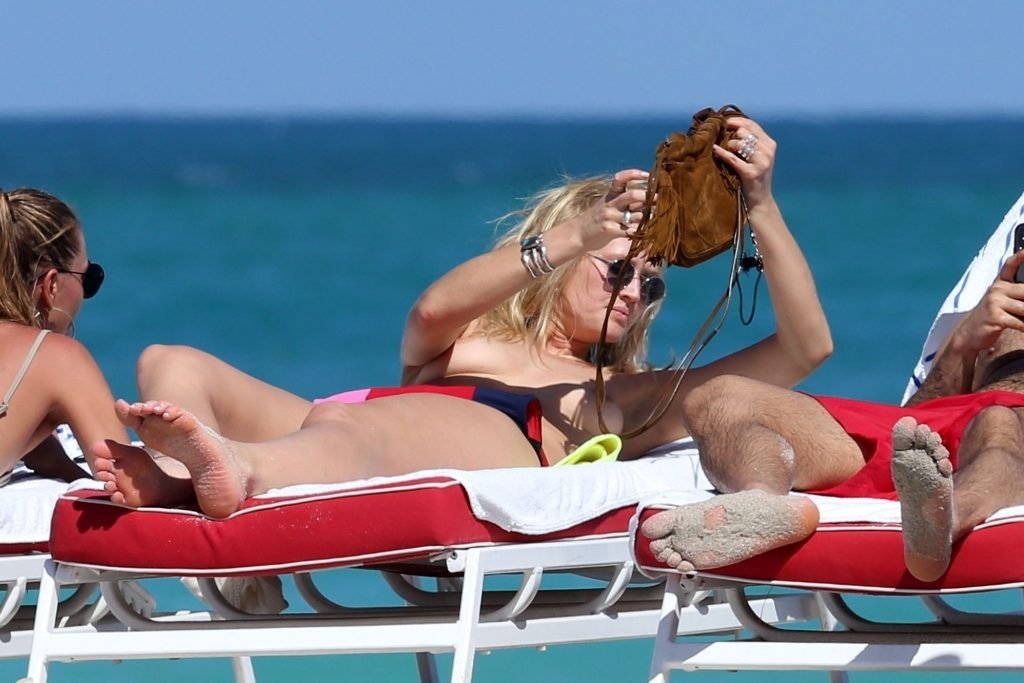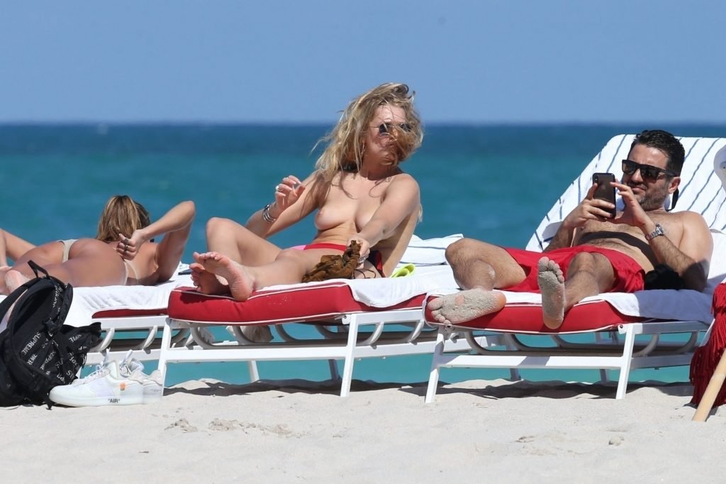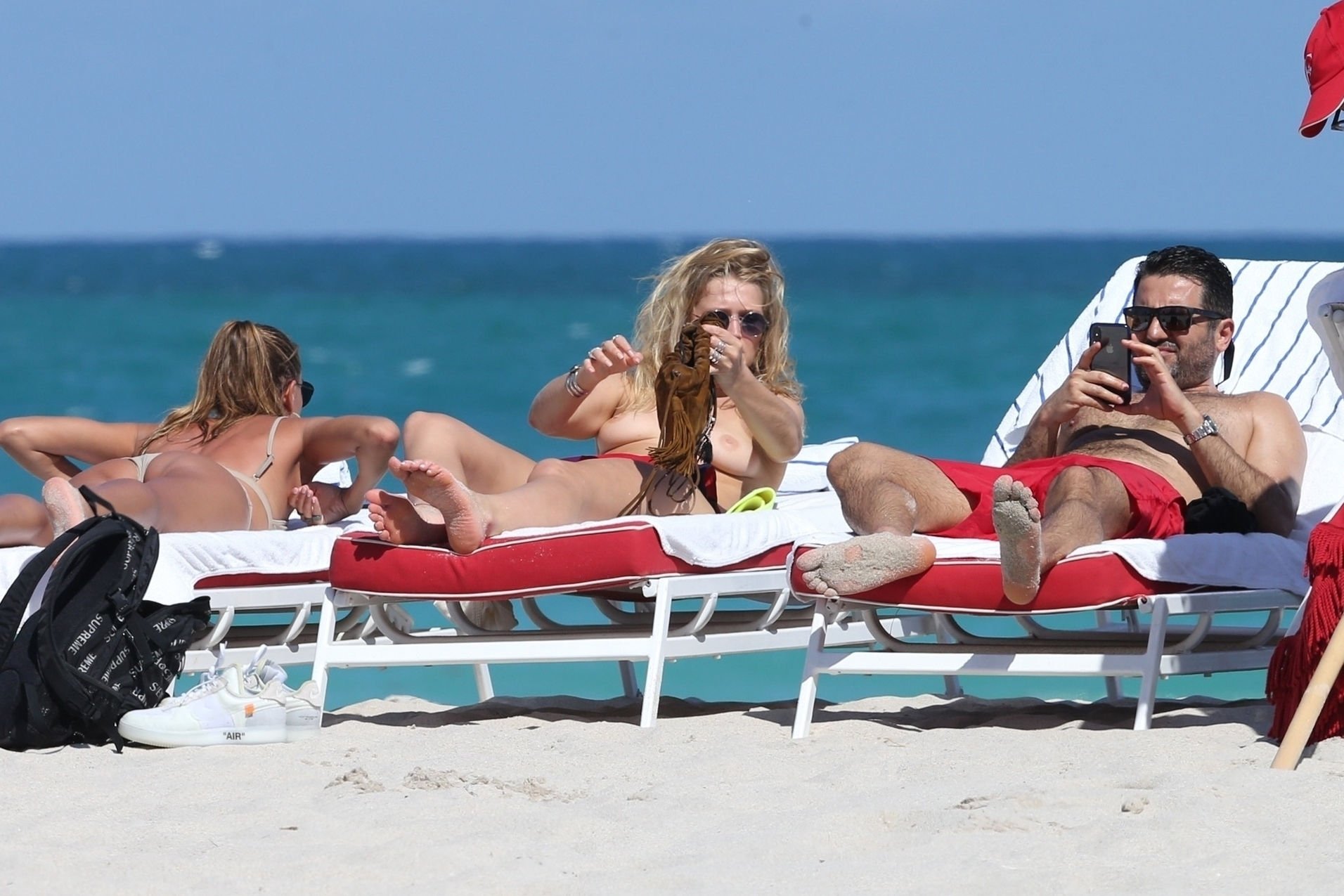 Le mannequin et actrice Toni Garrn se rend à la plage avec des amis pour profiter du soleil pendant le week-end de Pâques à Miami, le 01/04/2018. Toni a choisi d’enlever son haut pour la journée, exposant ainsi sa poitrine nue. Peut-être que Toni ne veut tout simplement pas de marques de bronzage.