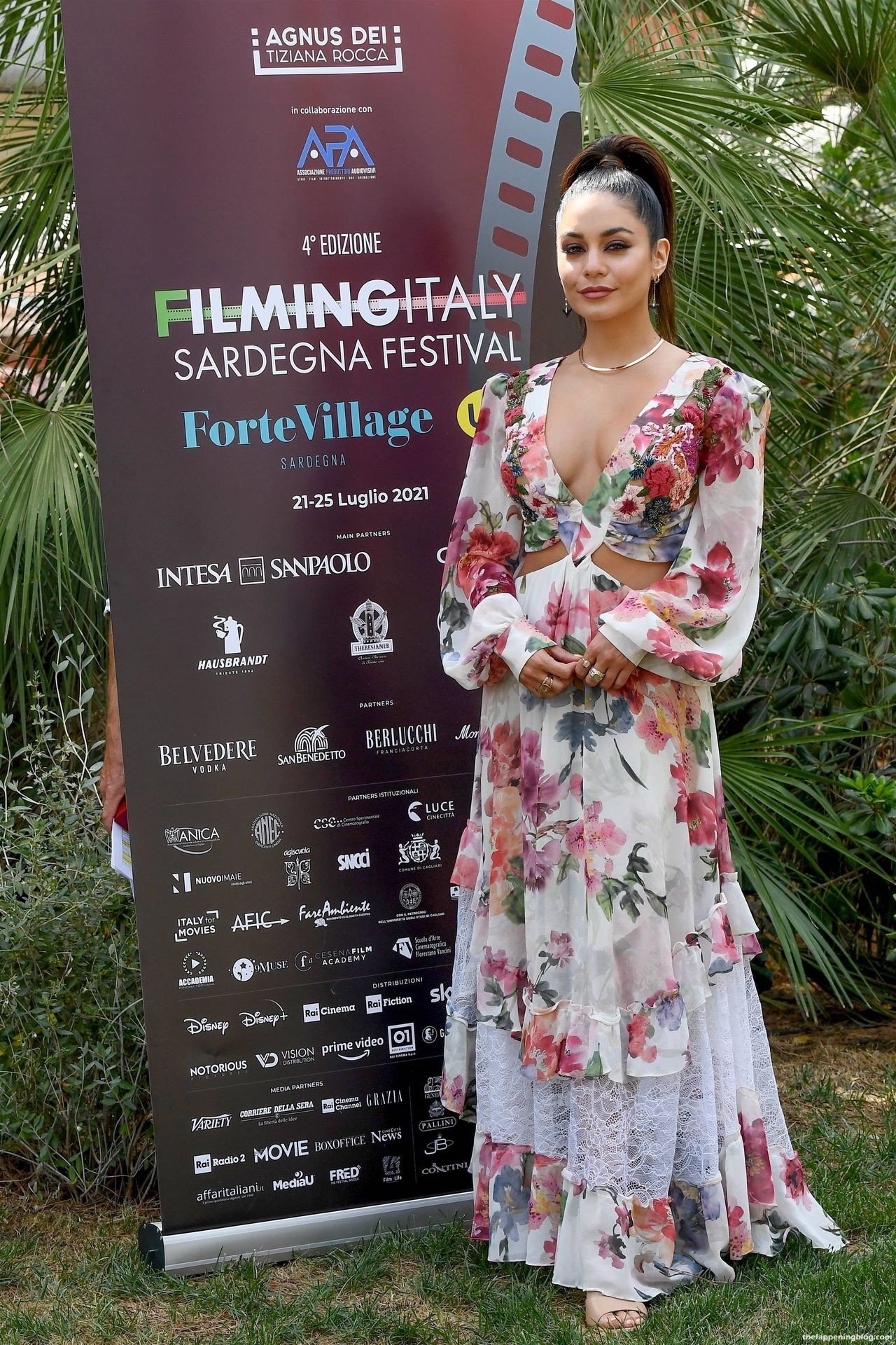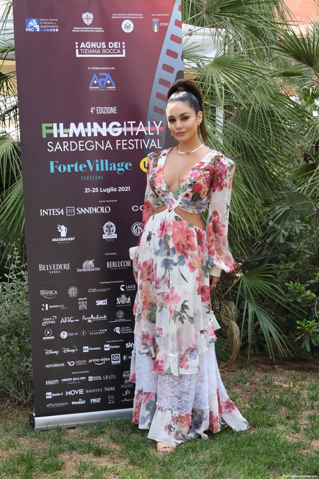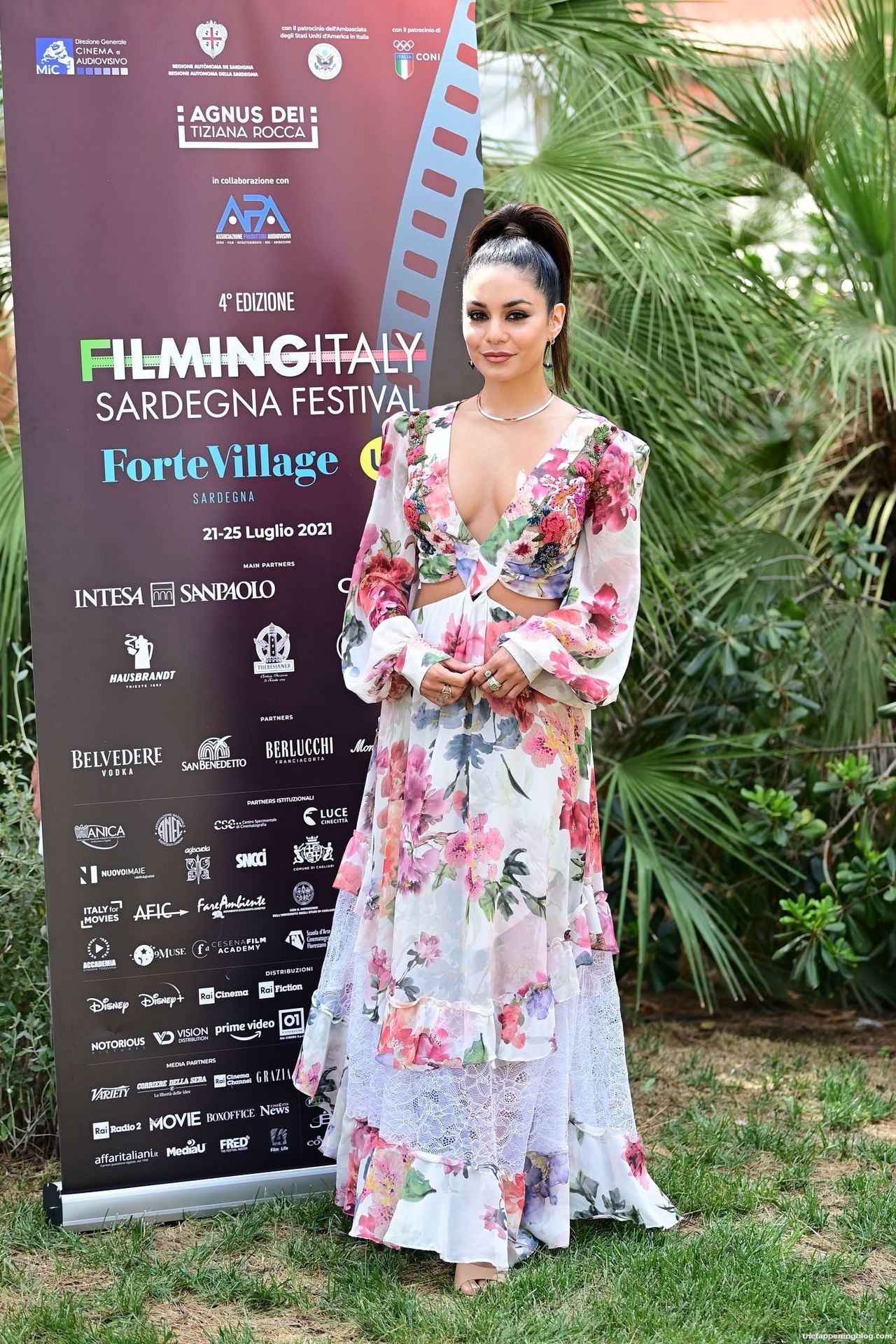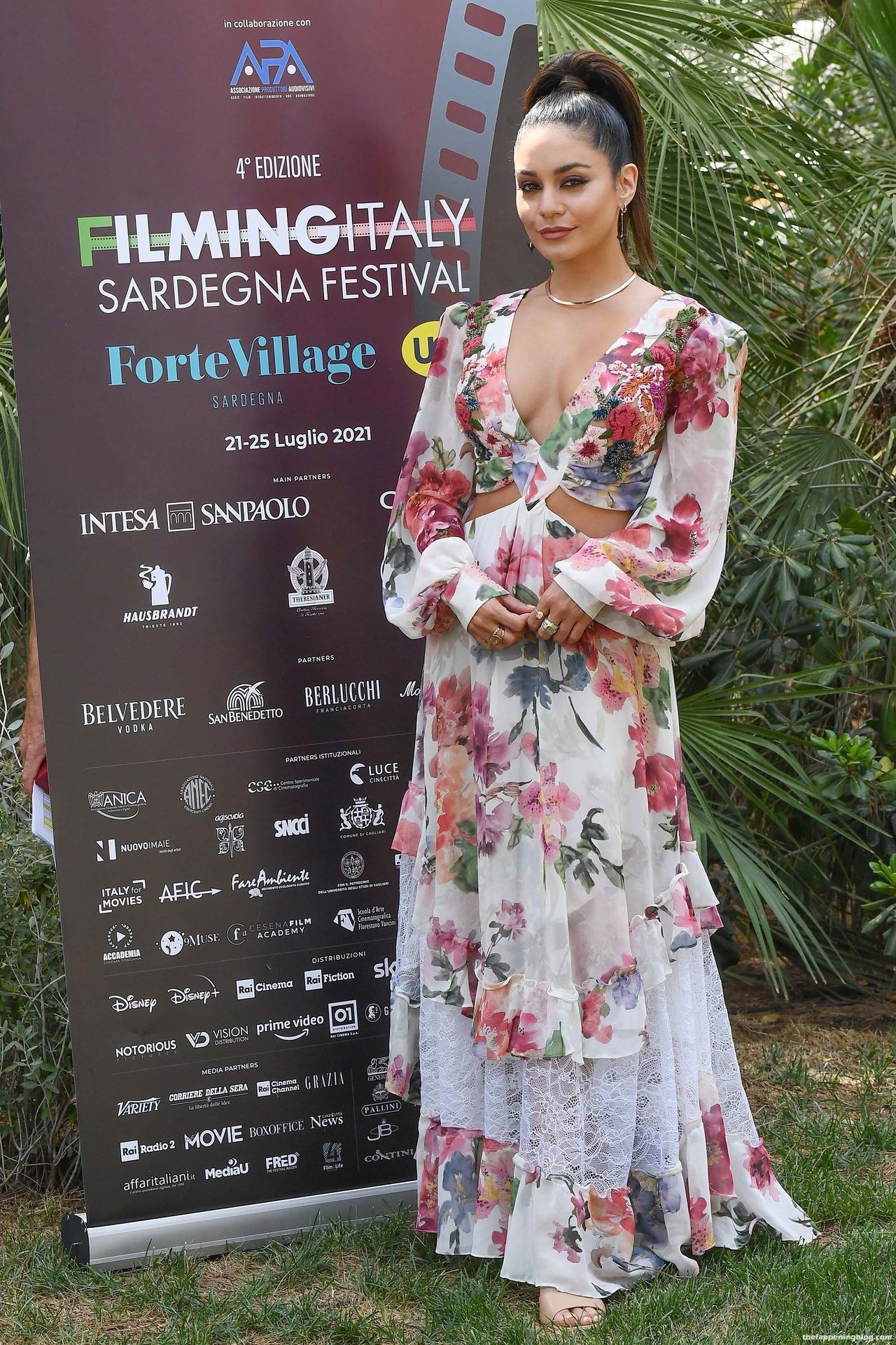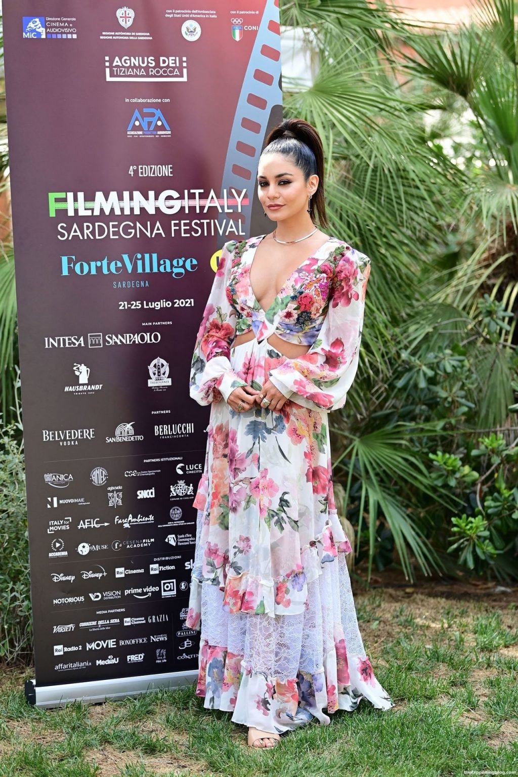 La star de The Fappening et actrice Vanessa Hudgens pose sans soutien-gorge dans une robe d’été au Filming Italy Sardegna Festival, le 24/07/2021.