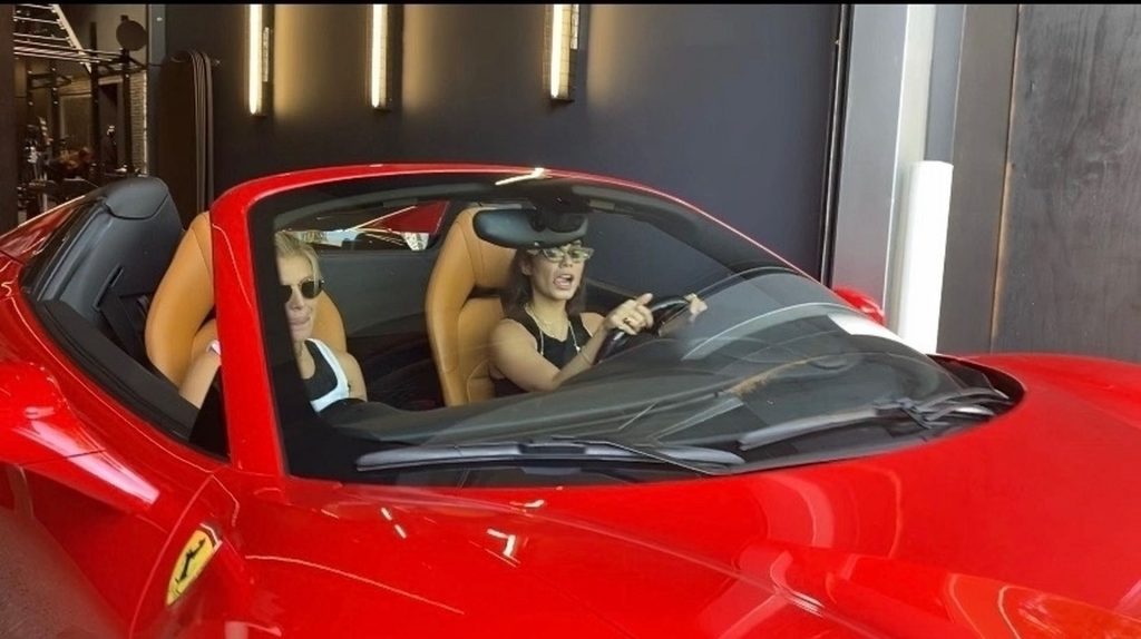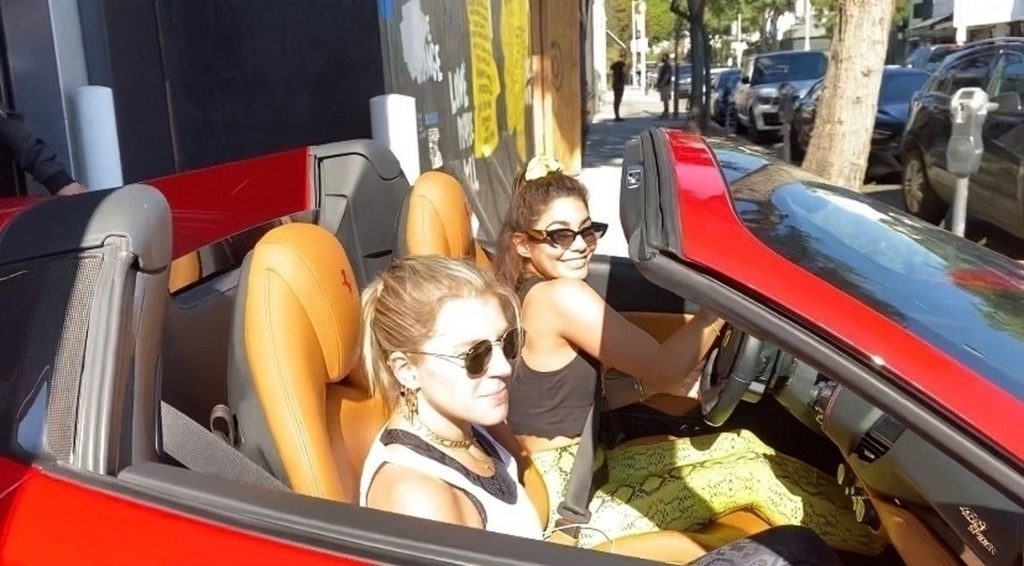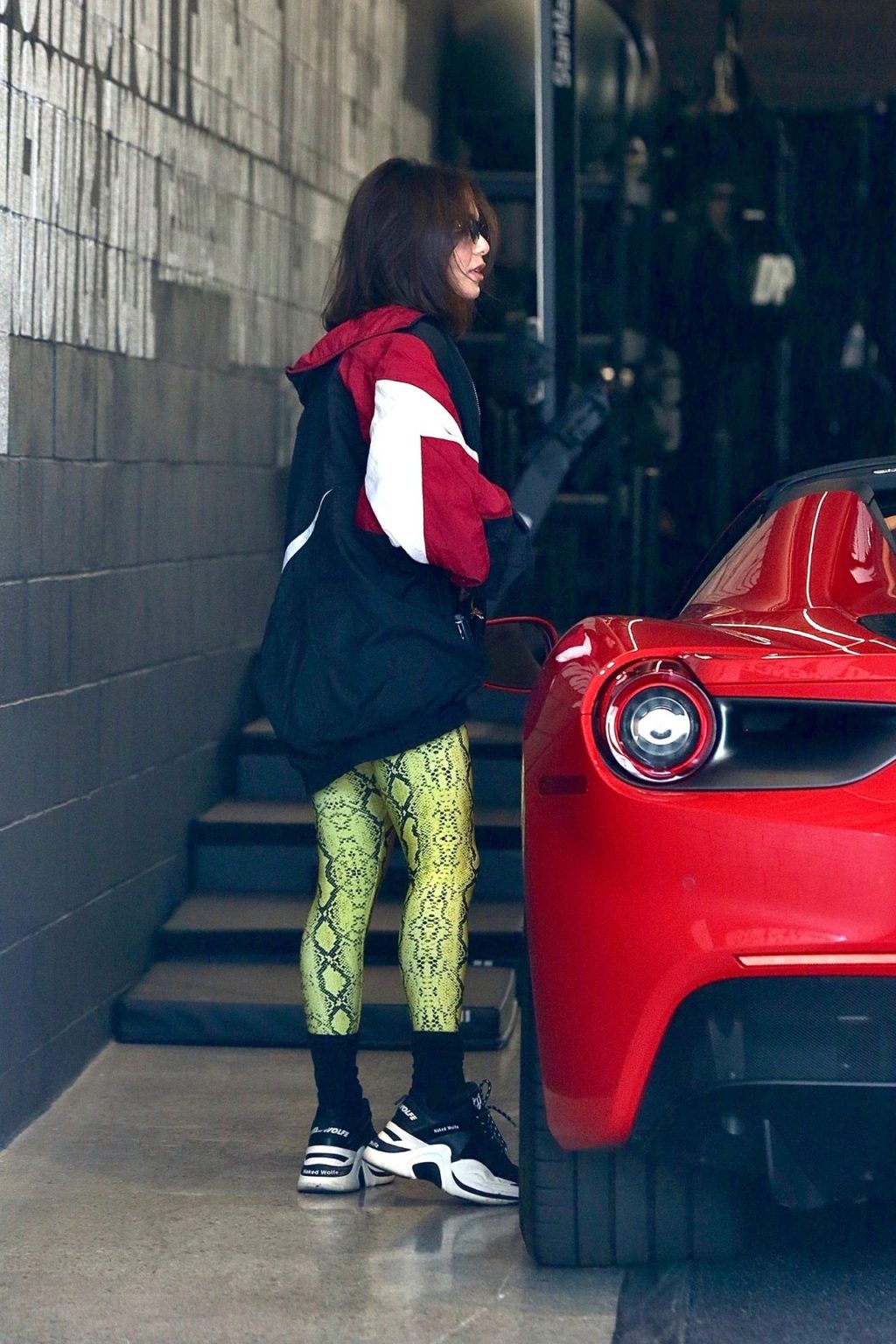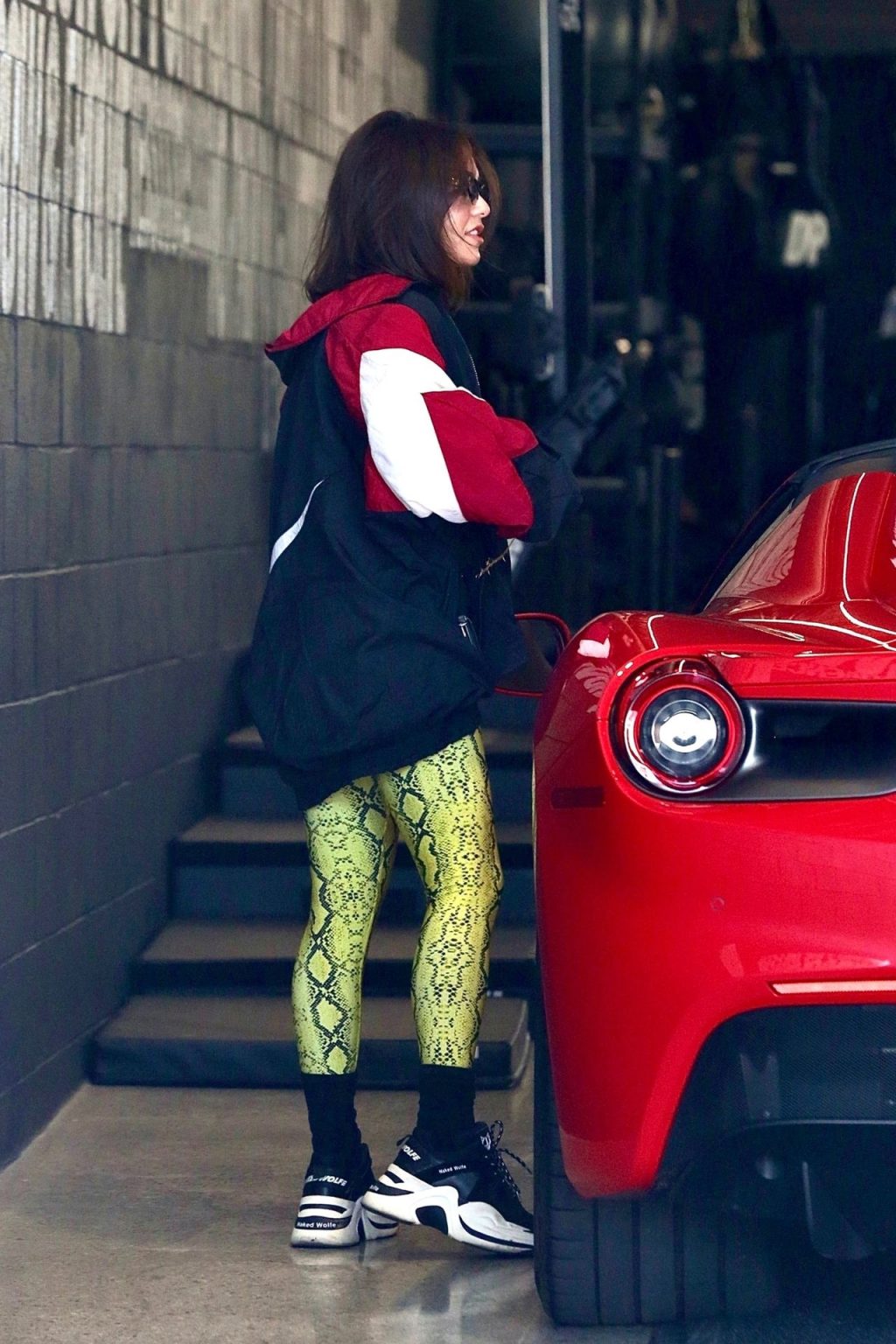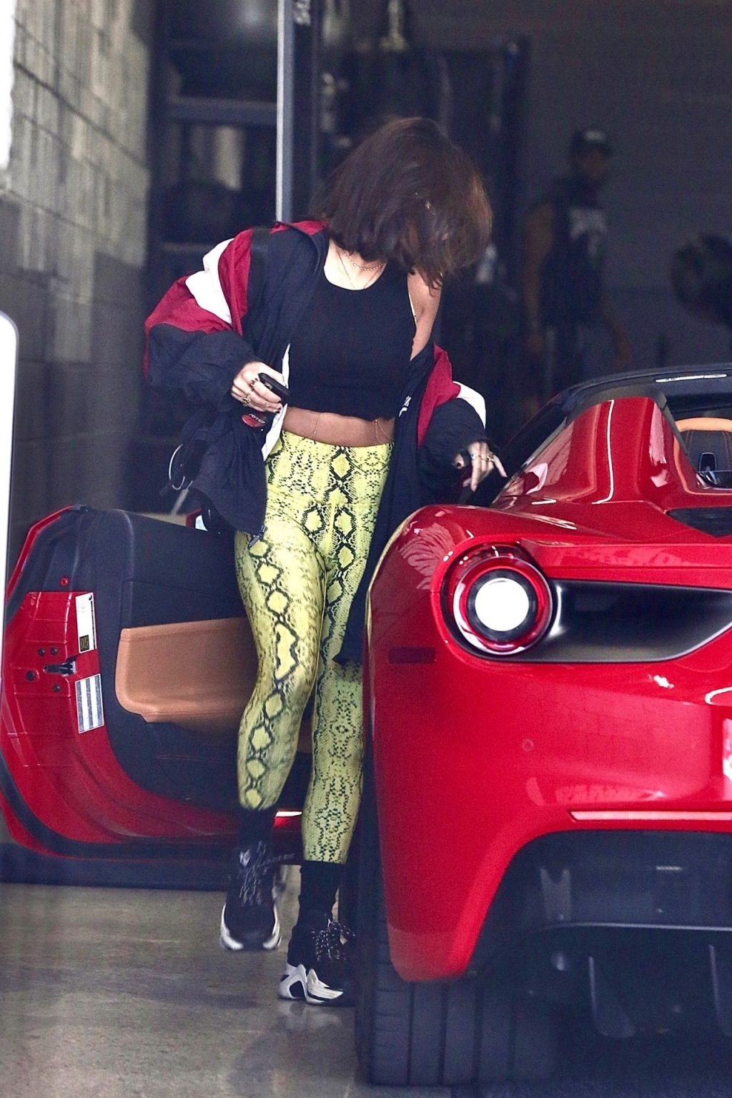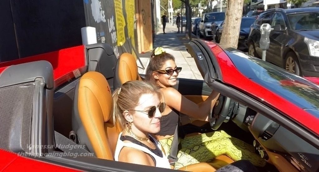 La star du Fappening Vanessa Hudgens arrive ce matin à la salle de sport en Ferrari rouge, arborant des collants à imprimé exotique et une coupe courte pour son entraînement à West Hollywood, le 17/11/2020.