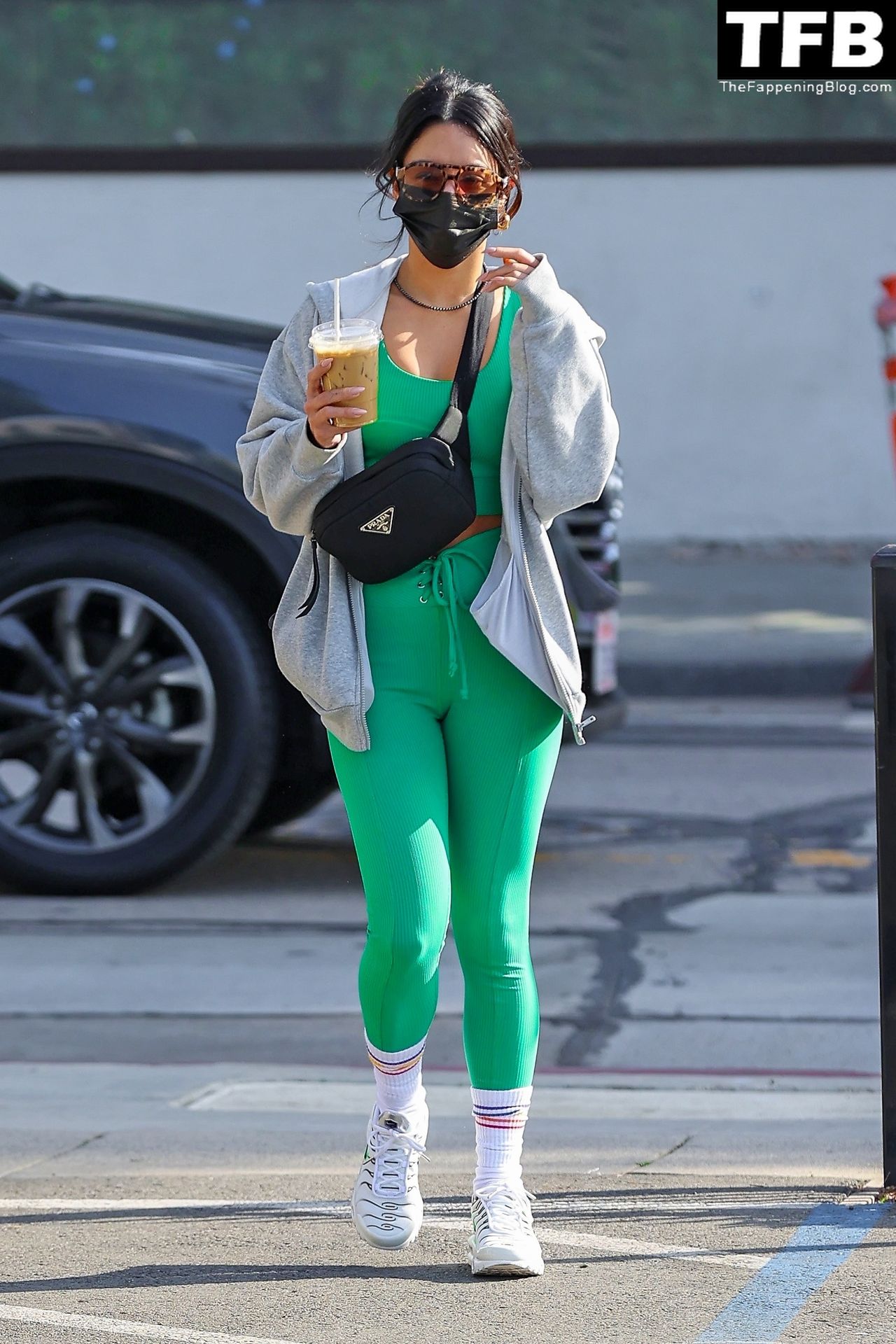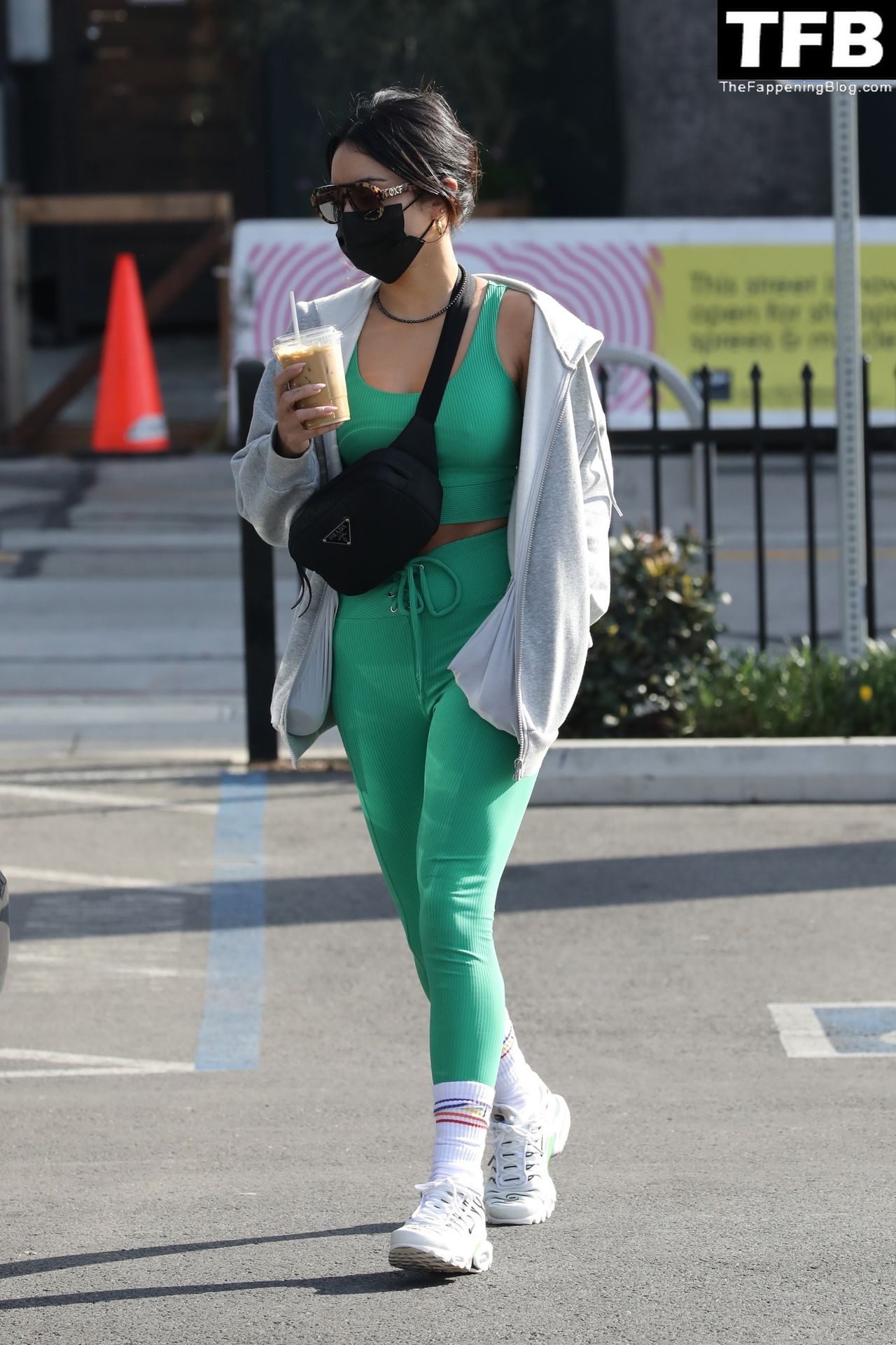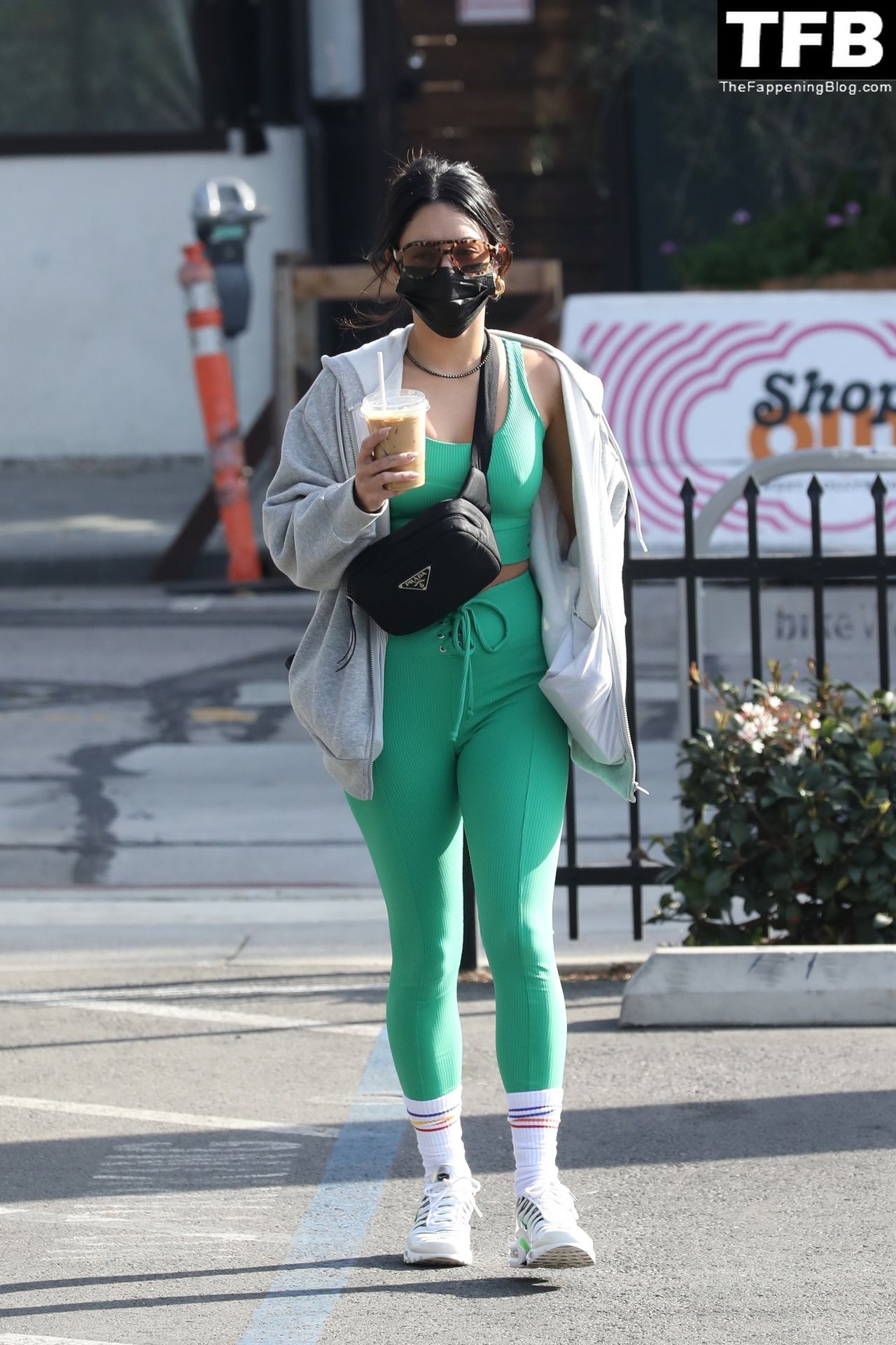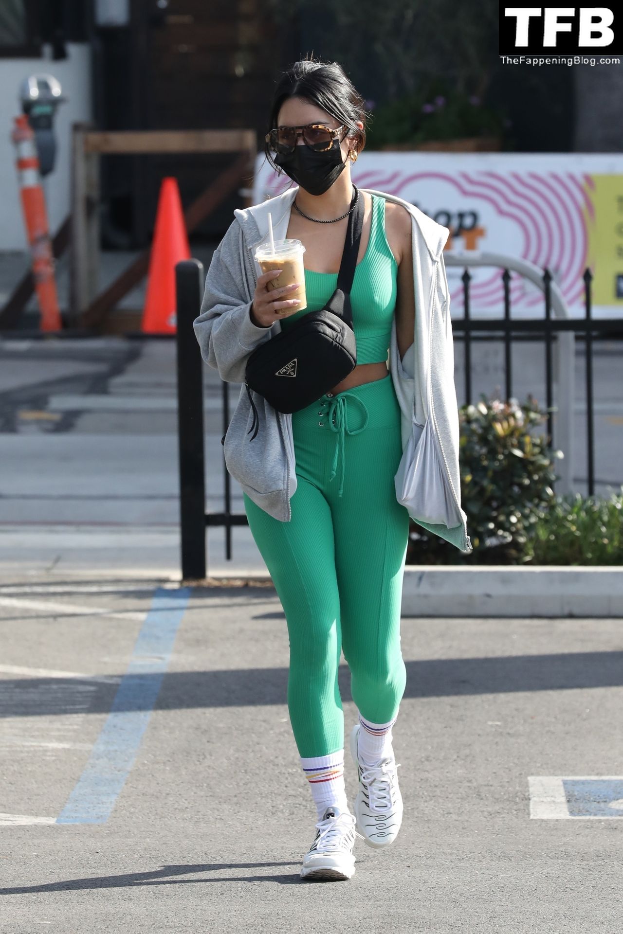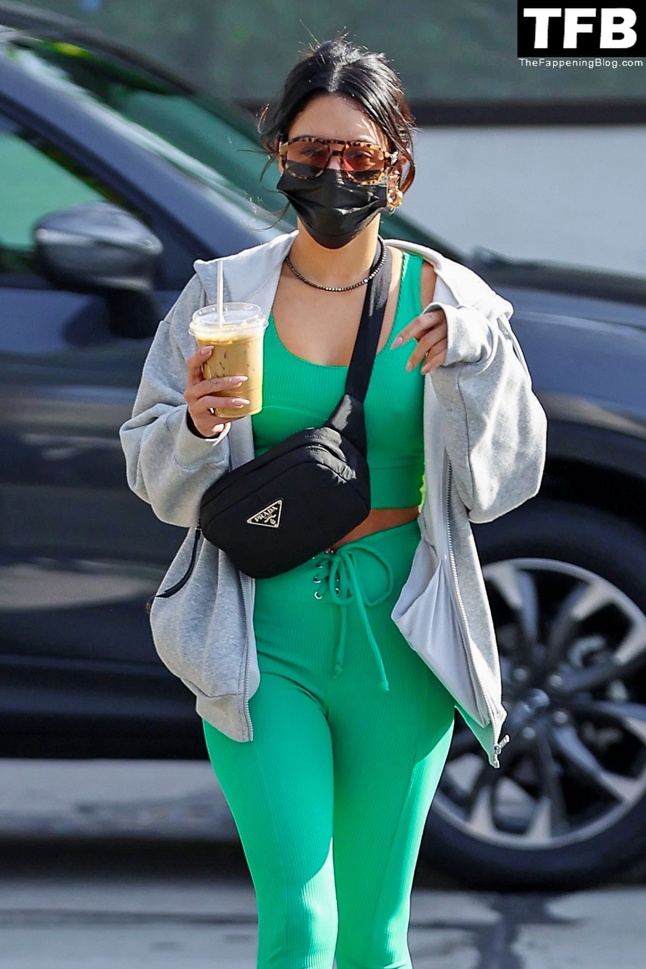La star de The Fappening Vanessa Hudgens savoure son café glacé après une séance au Dogpound Gym à West Hollywood, 14/01/2022.