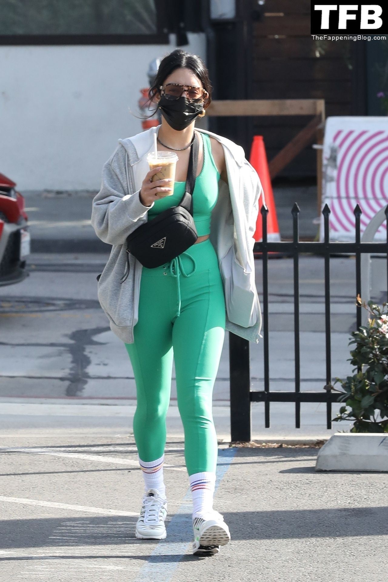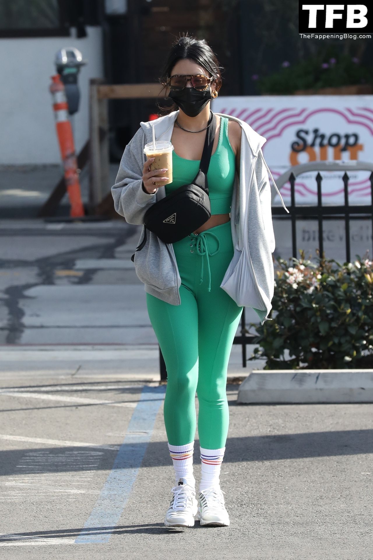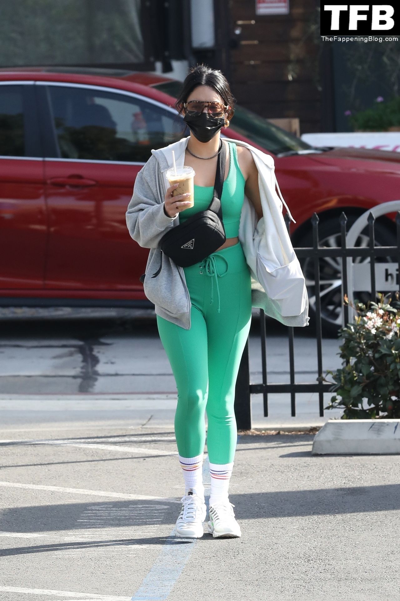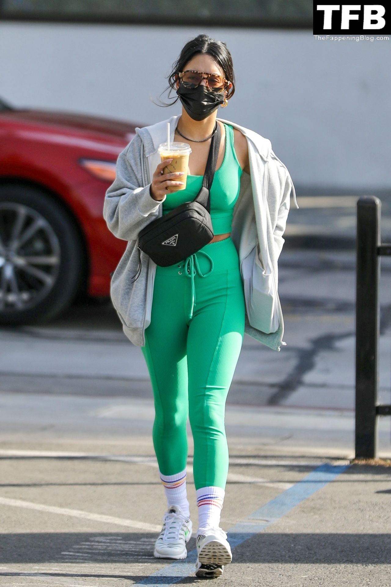 La star de The Fappening Vanessa Hudgens savoure son café glacé après une séance au Dogpound Gym à West Hollywood, 14/01/2022.