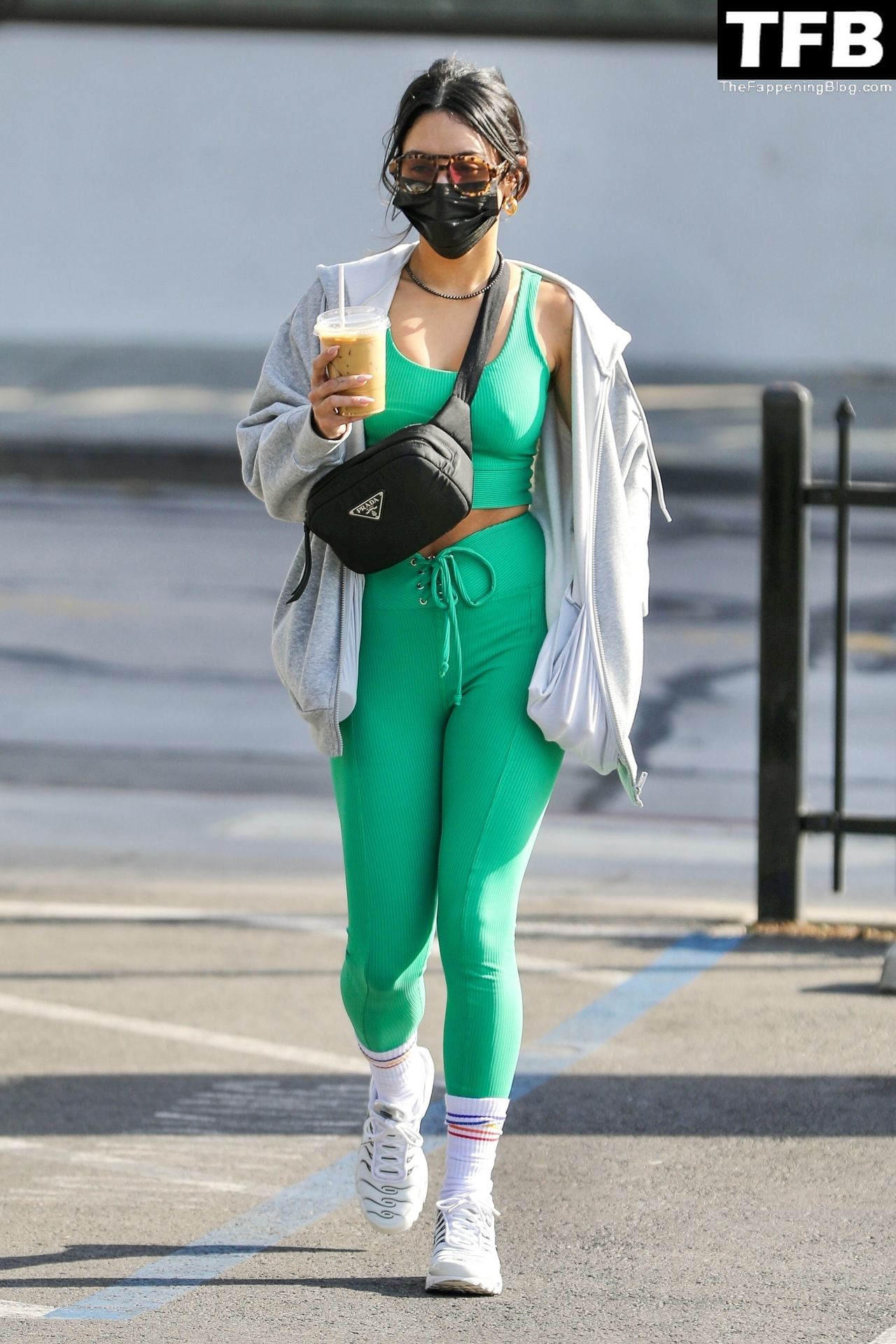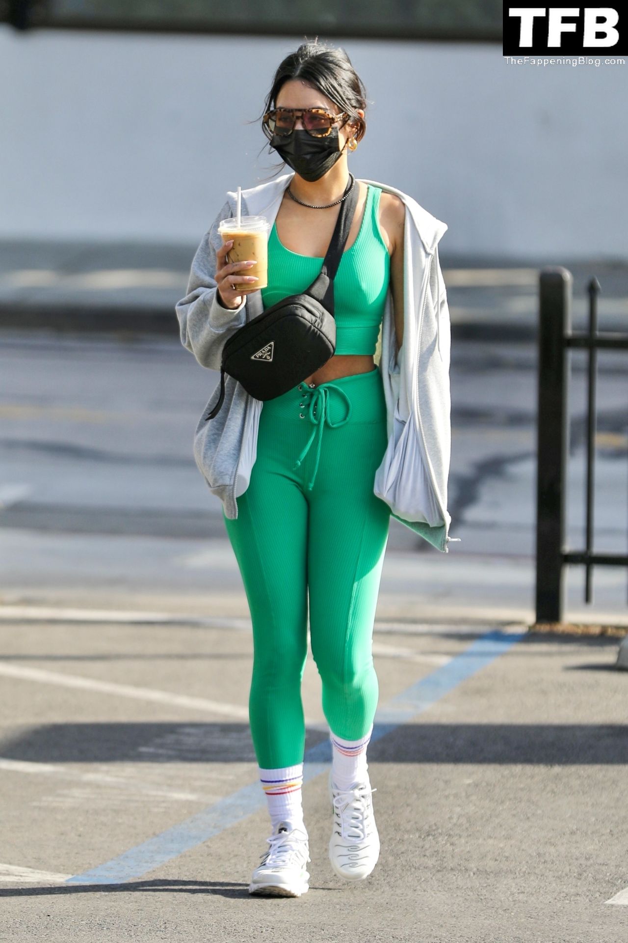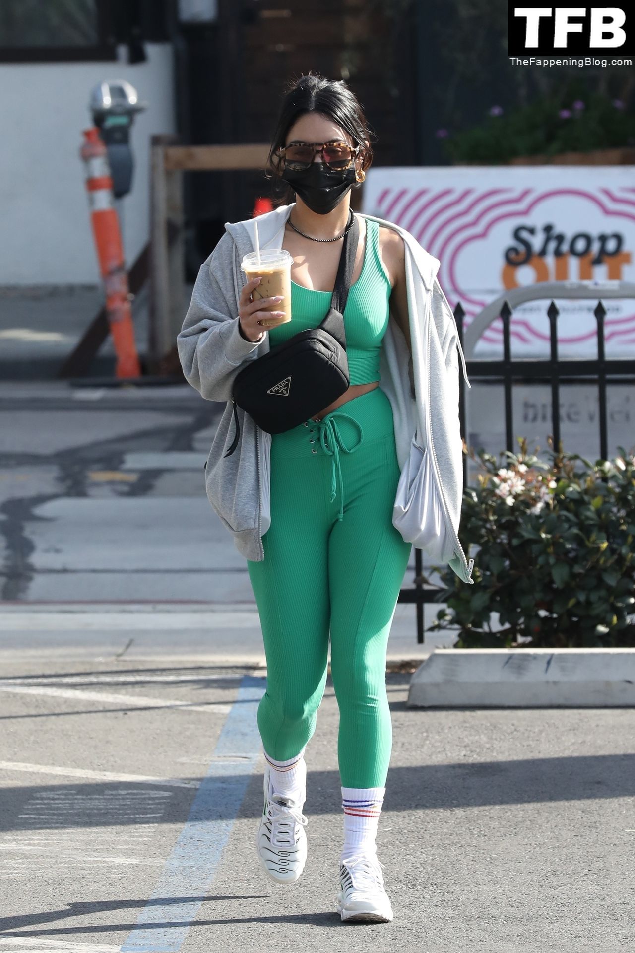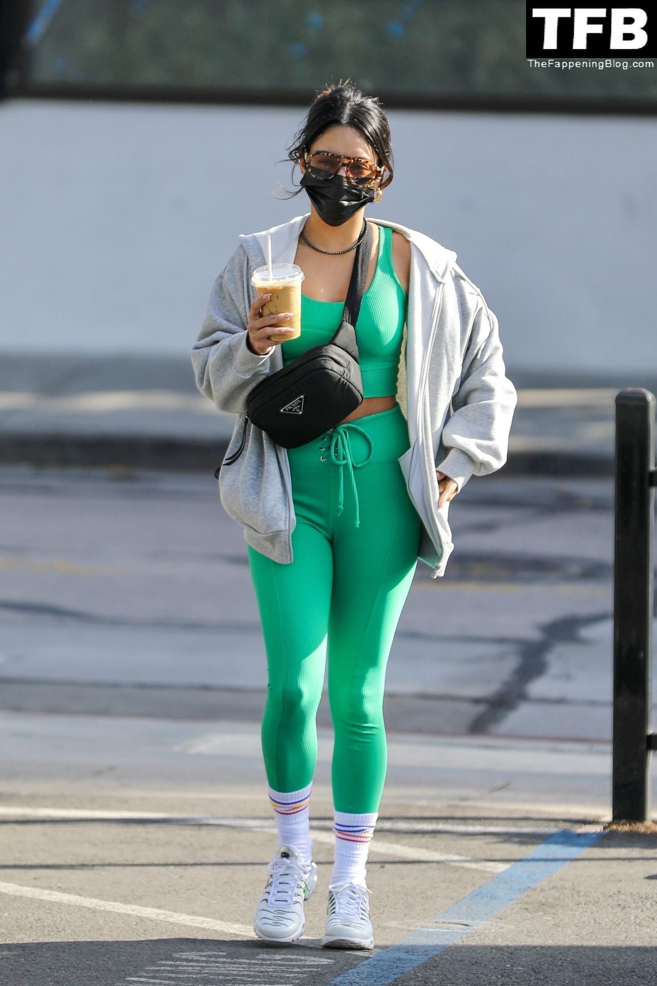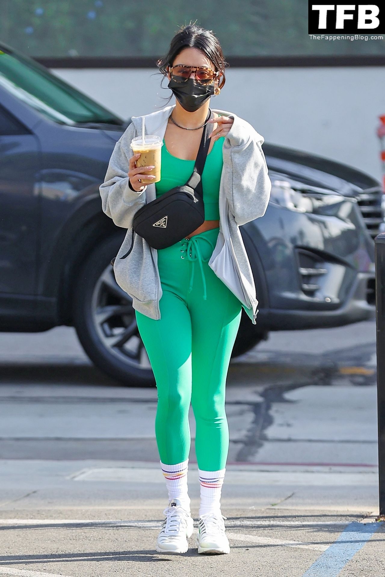 La star de The Fappening Vanessa Hudgens savoure son café glacé après une séance au Dogpound Gym à West Hollywood, 14/01/2022.