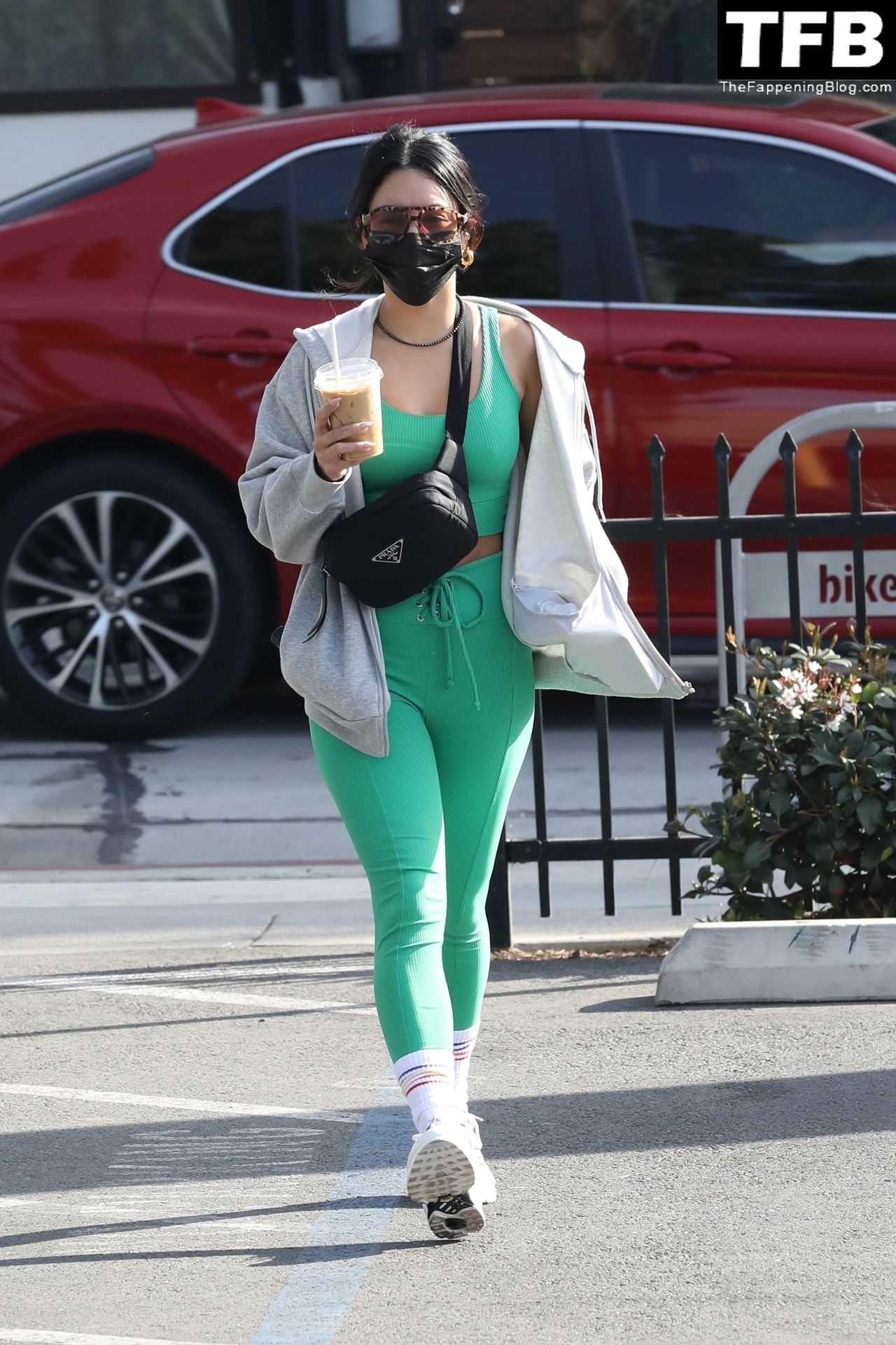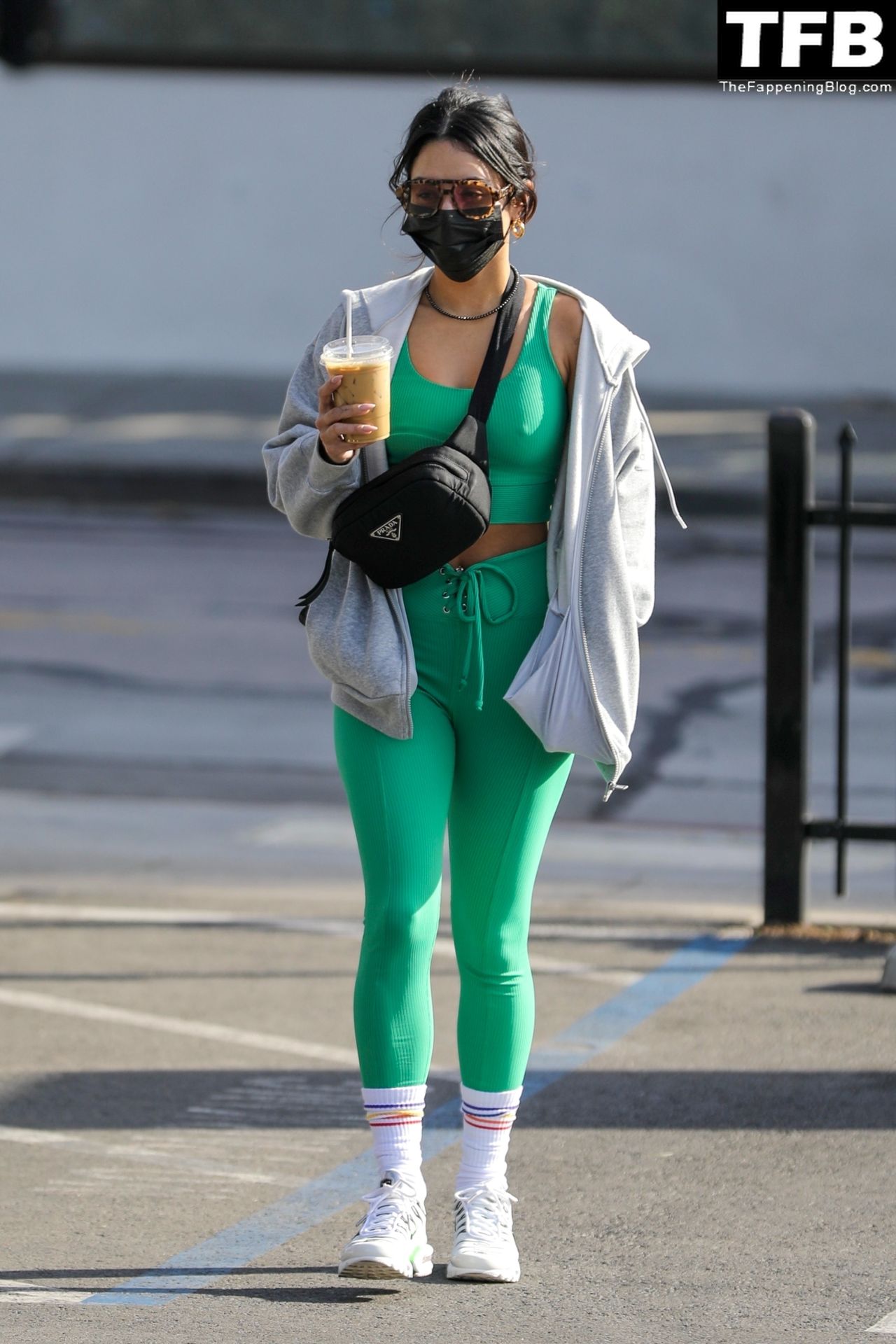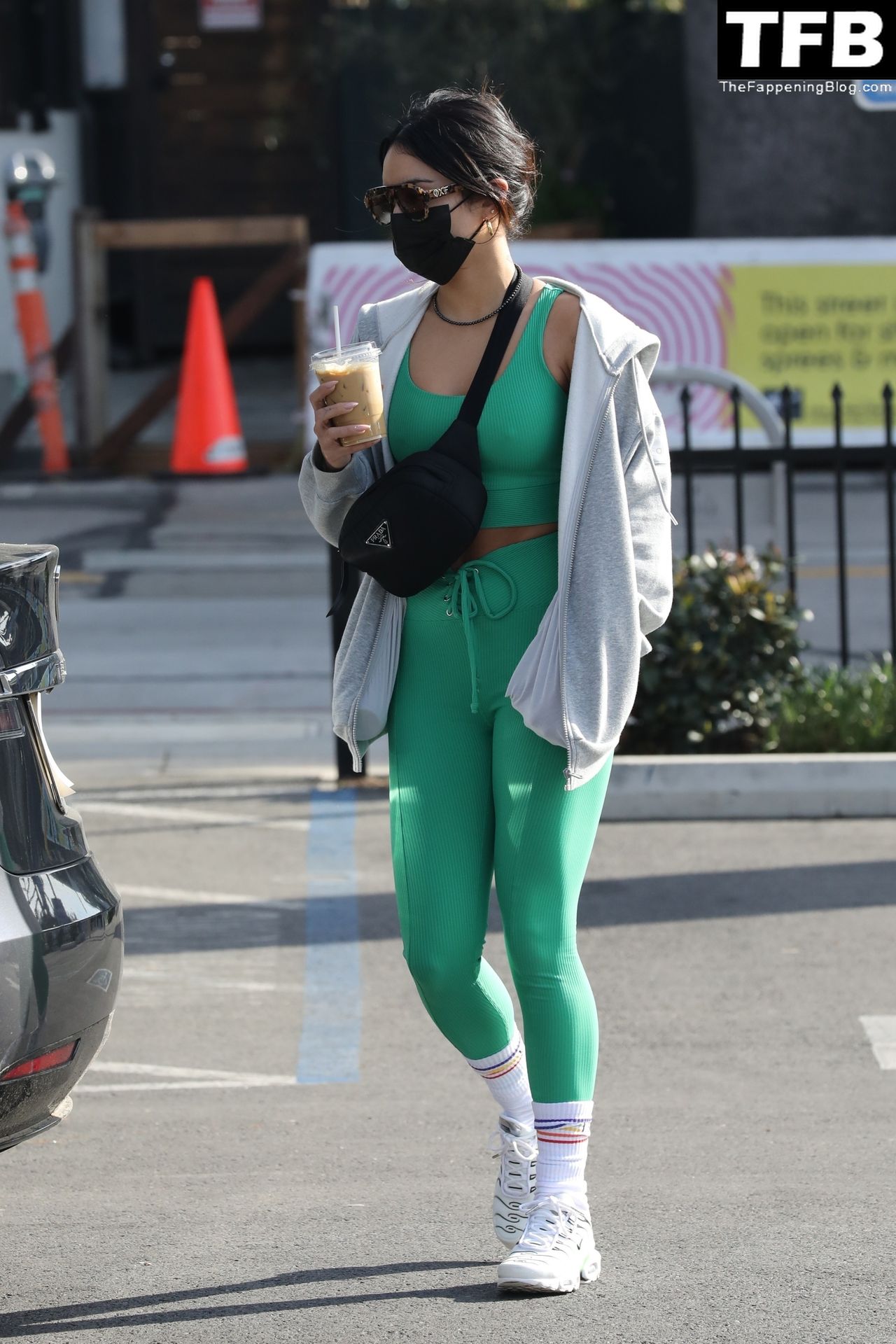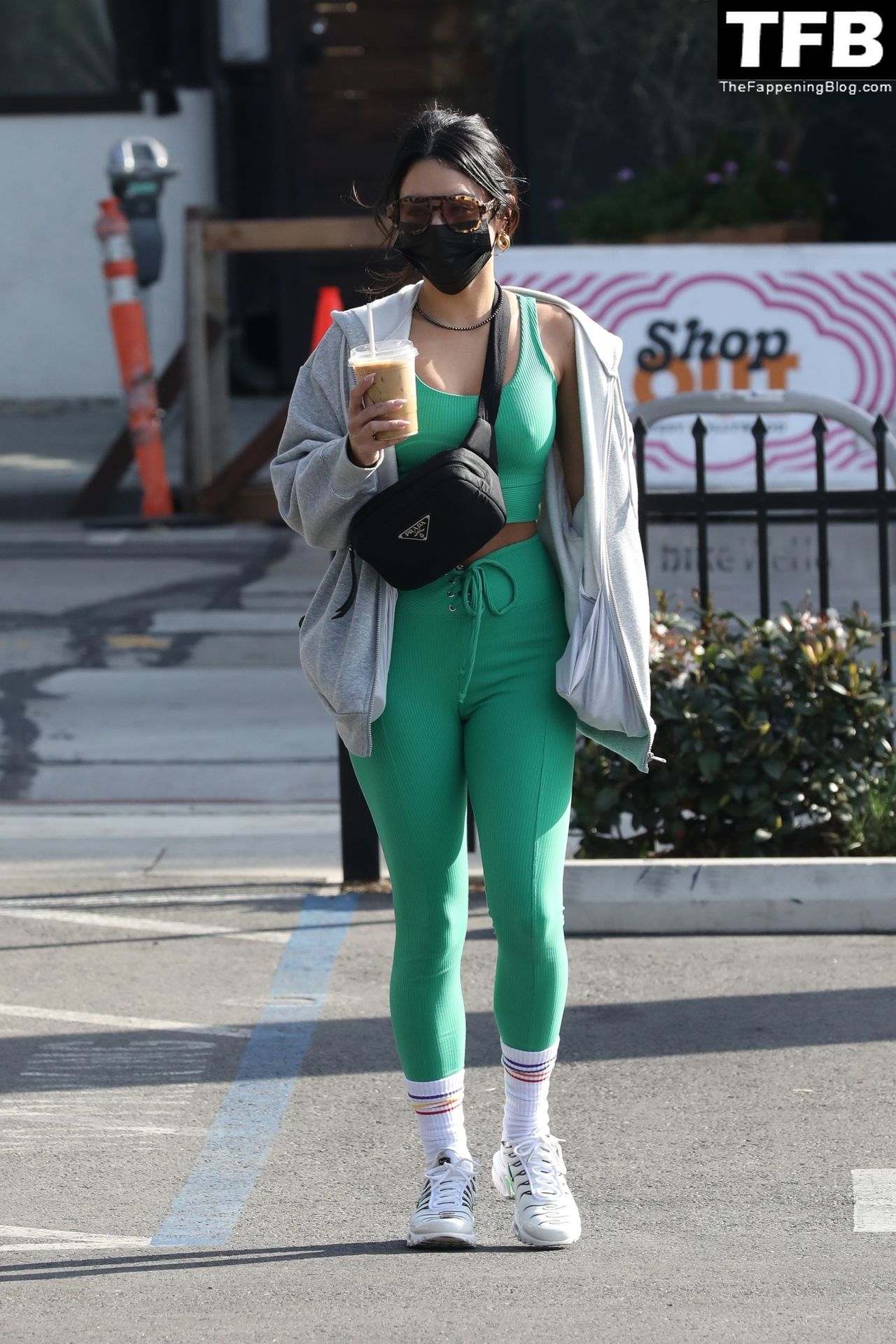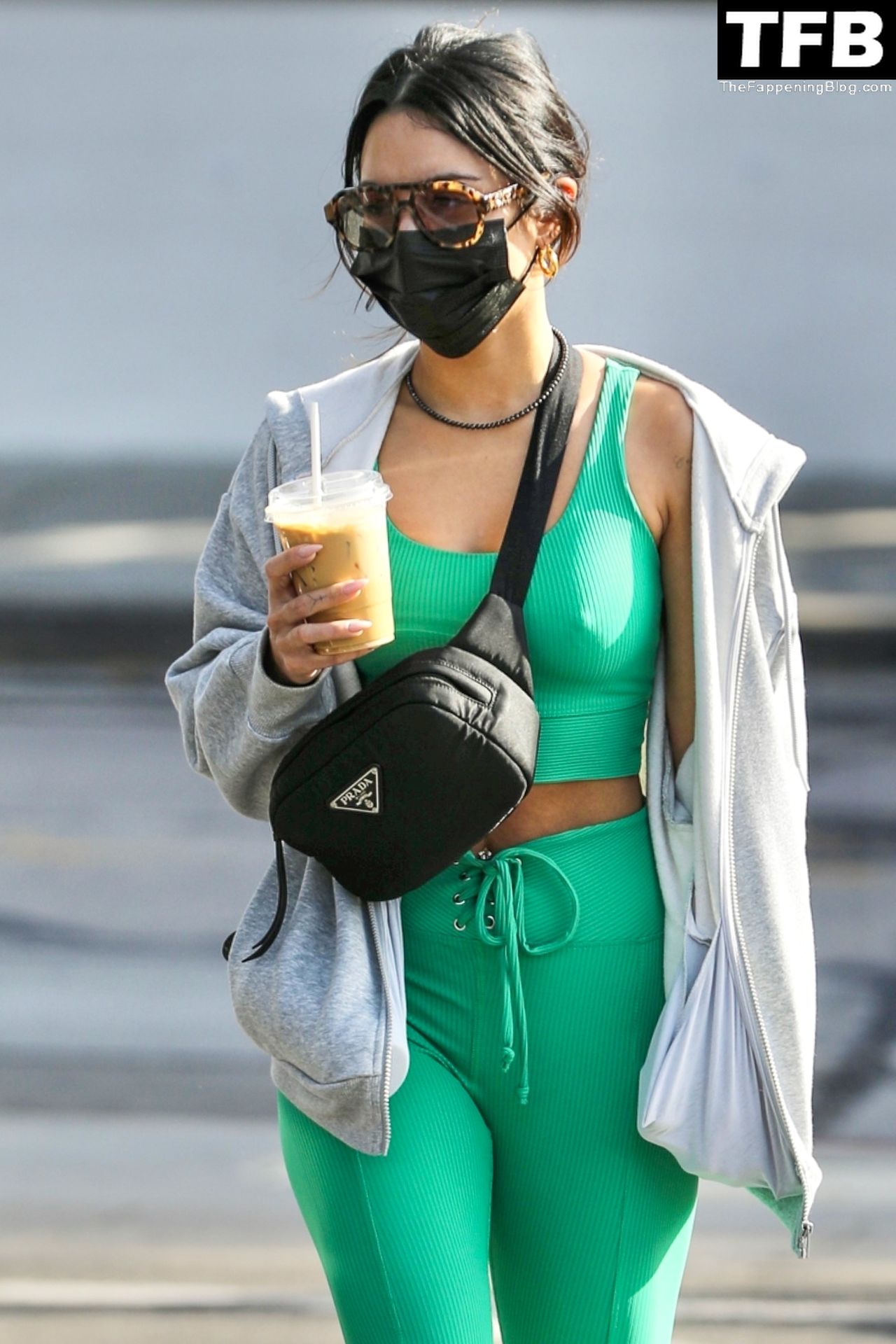 La star de The Fappening Vanessa Hudgens savoure son café glacé après une séance au Dogpound Gym à West Hollywood, 14/01/2022.
