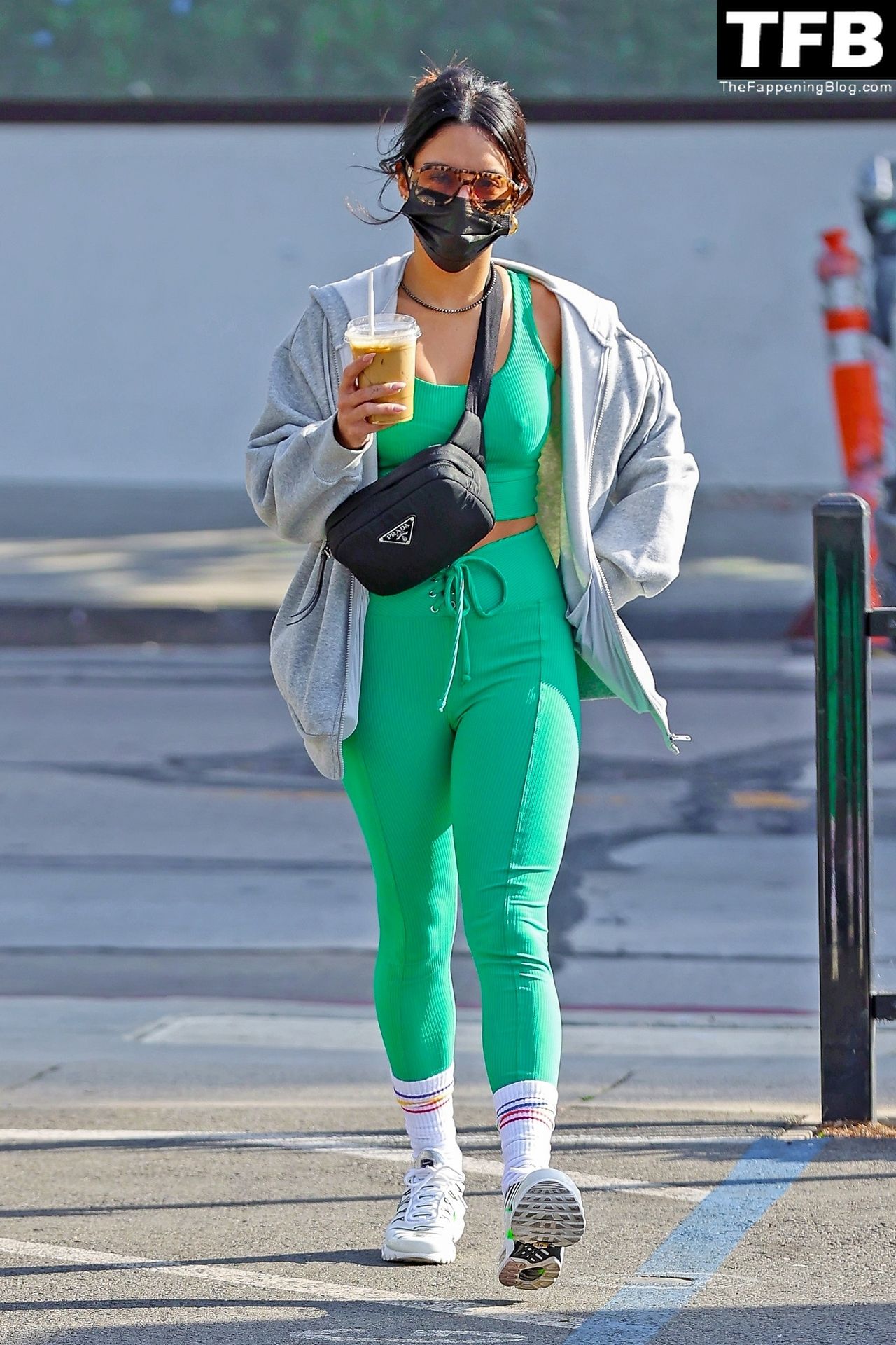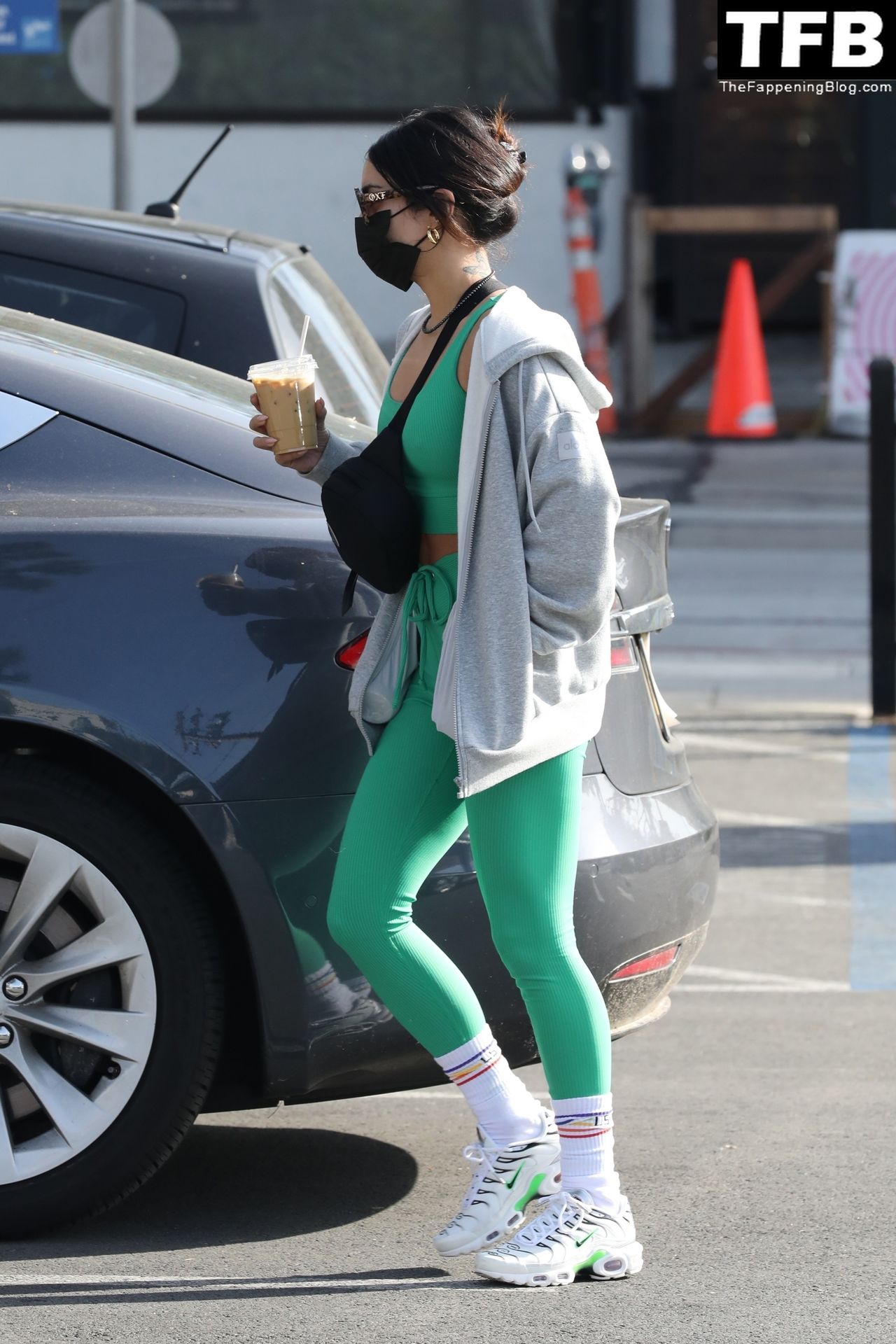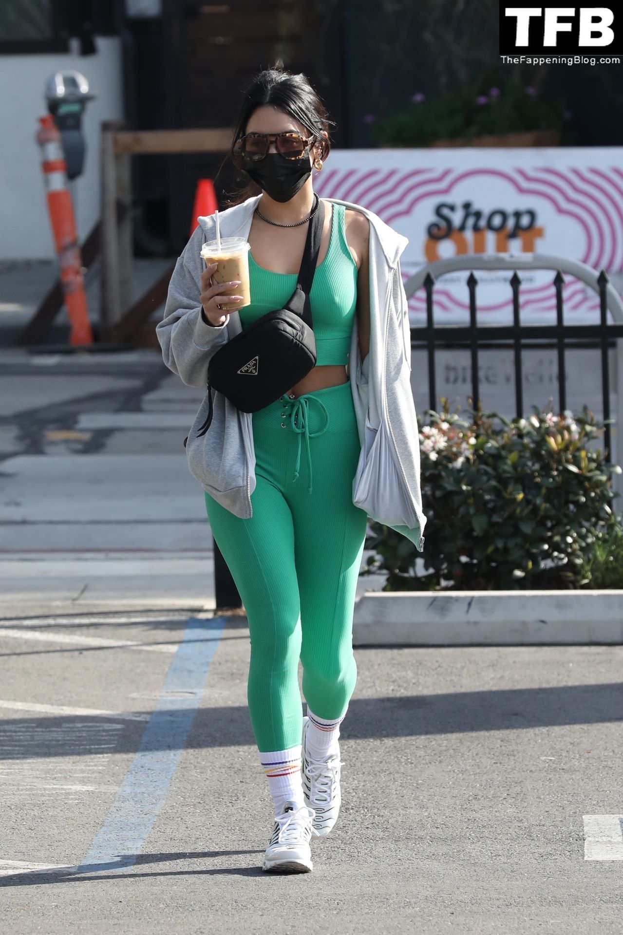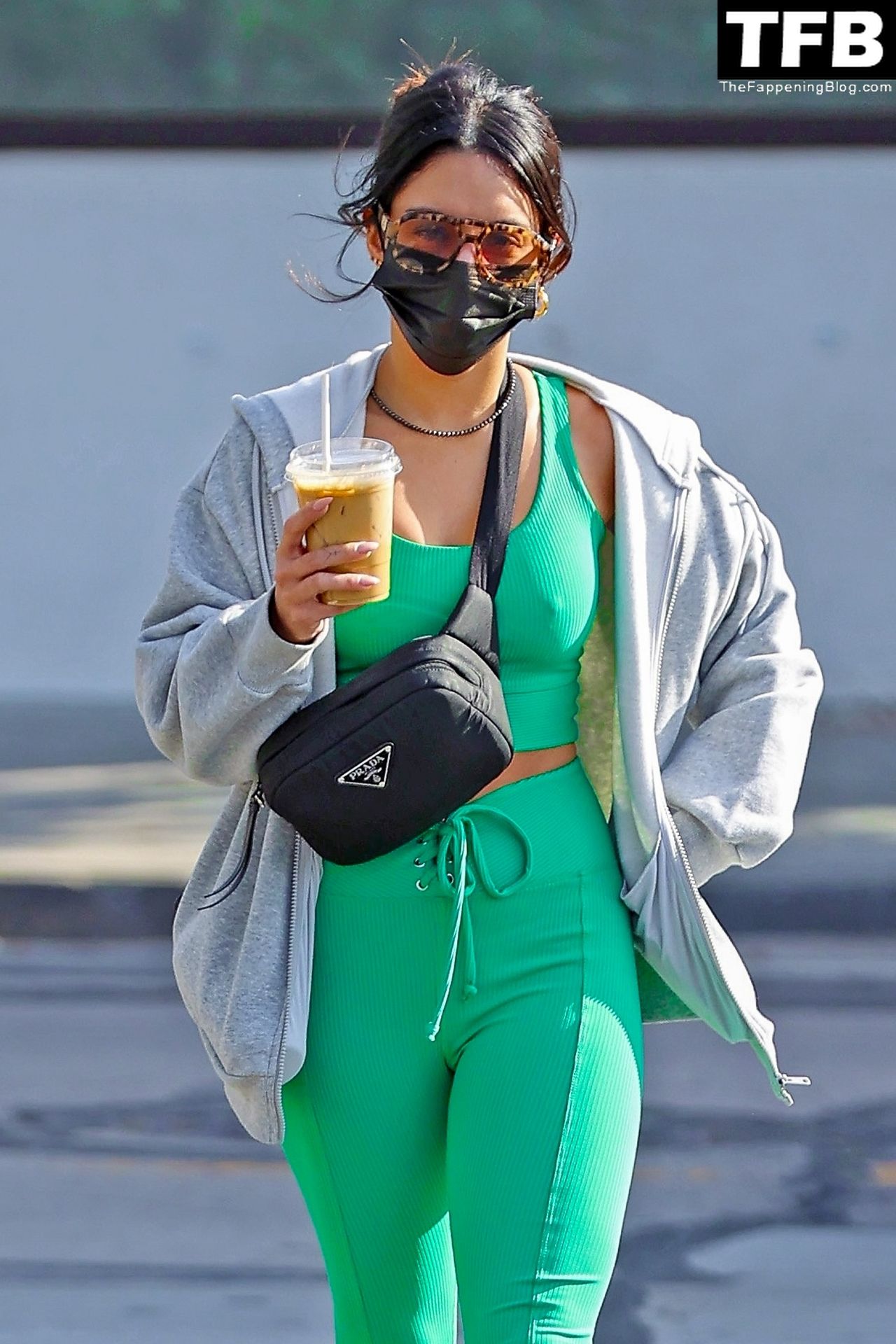 La star de The Fappening Vanessa Hudgens savoure son café glacé après une séance au Dogpound Gym à West Hollywood, 14/01/2022.