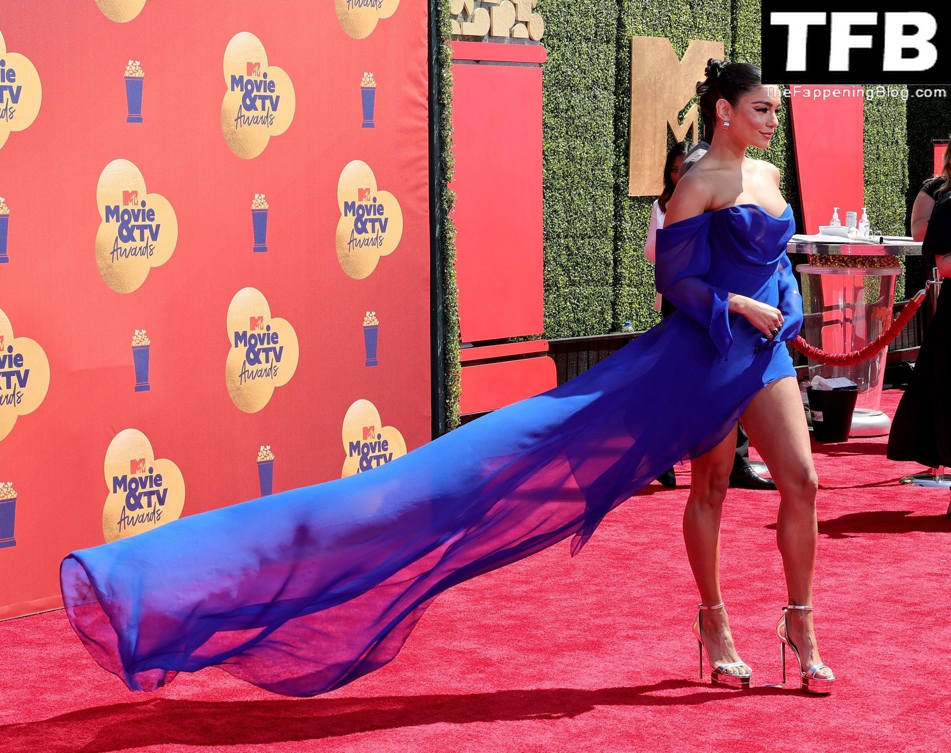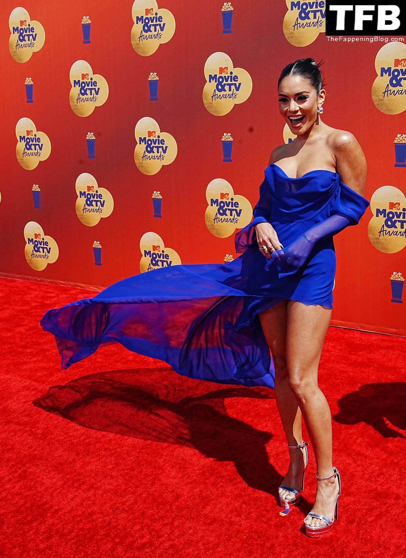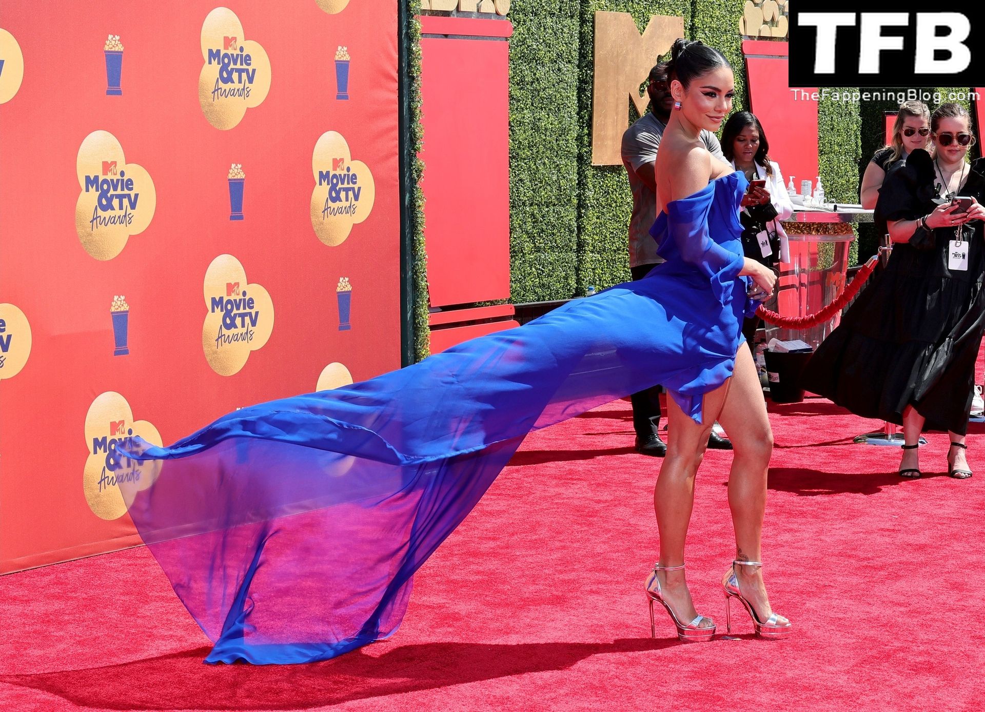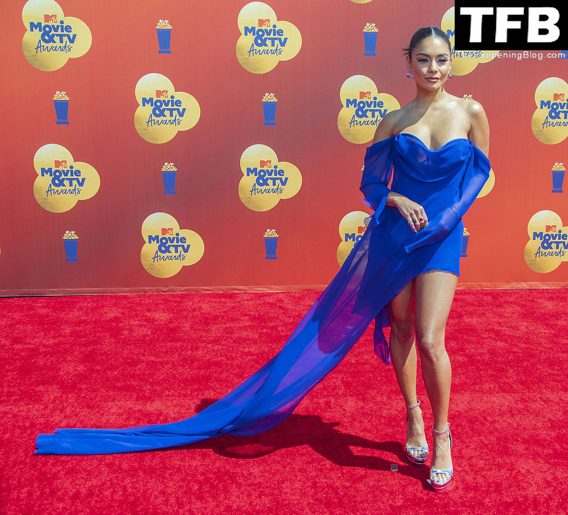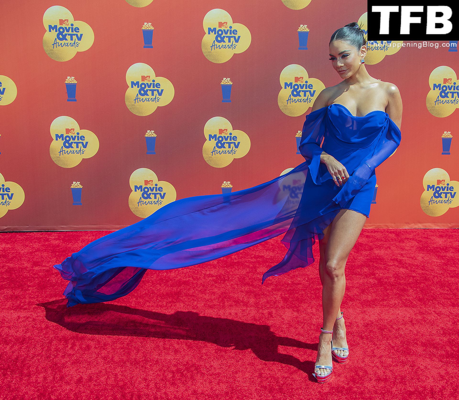 La star du Fappening Vanessa Hudgens pose en robe bleue sur le tapis rouge des MTV Movie & TV Awards au Barker Hangar à Santa Monica, le 05/06/2022.