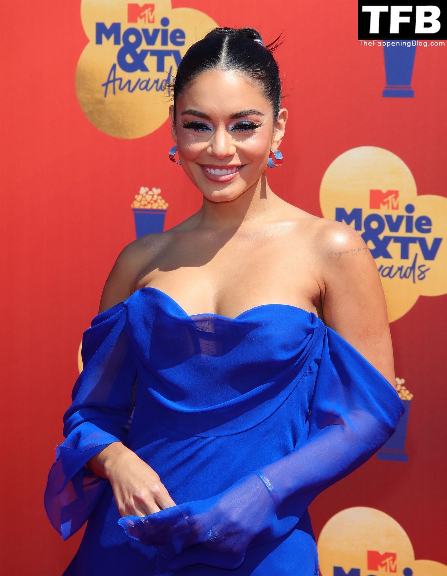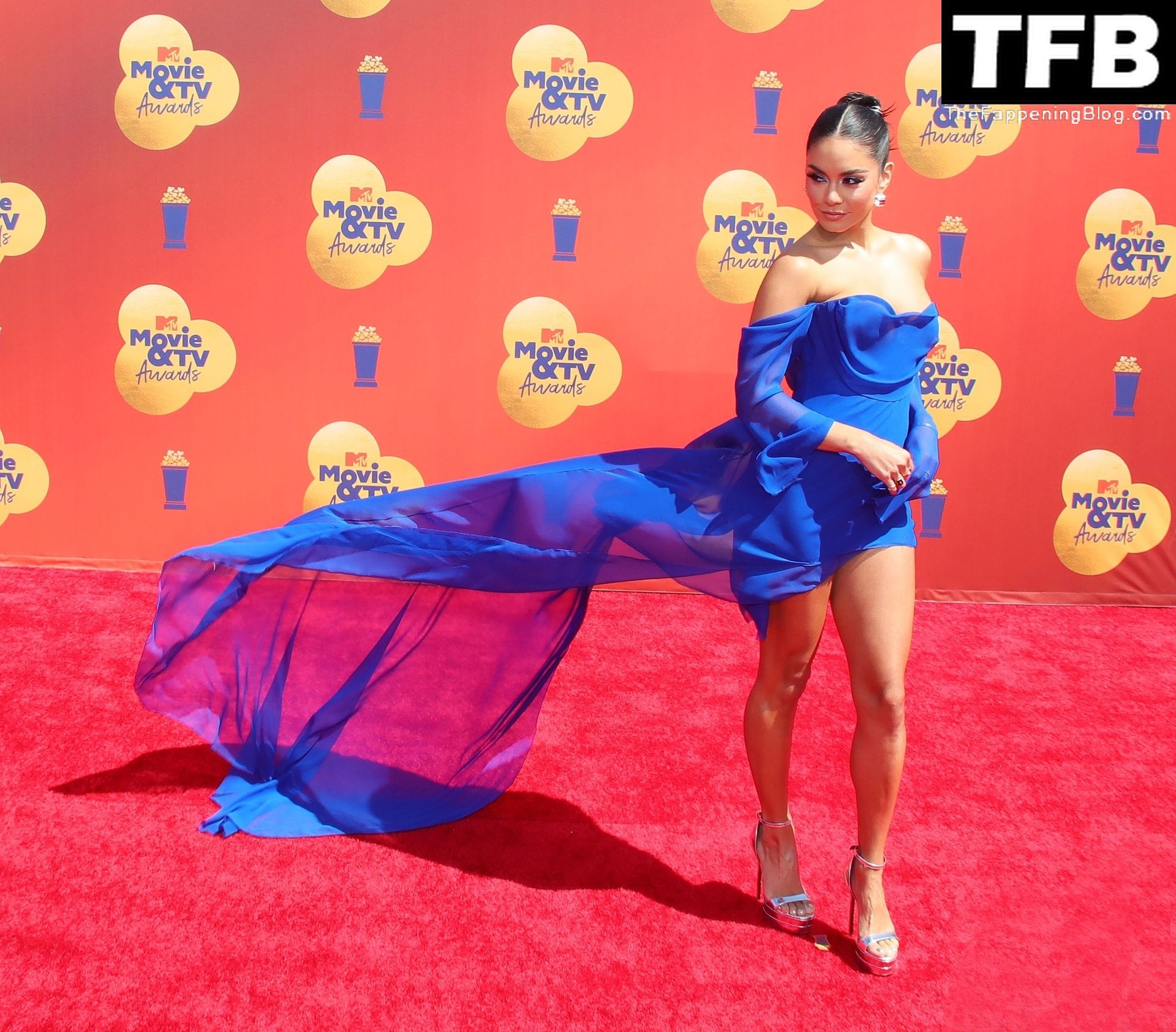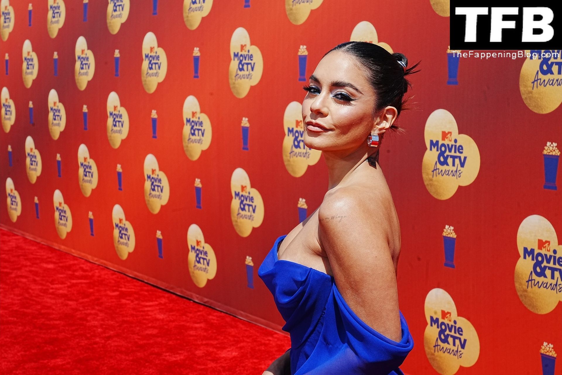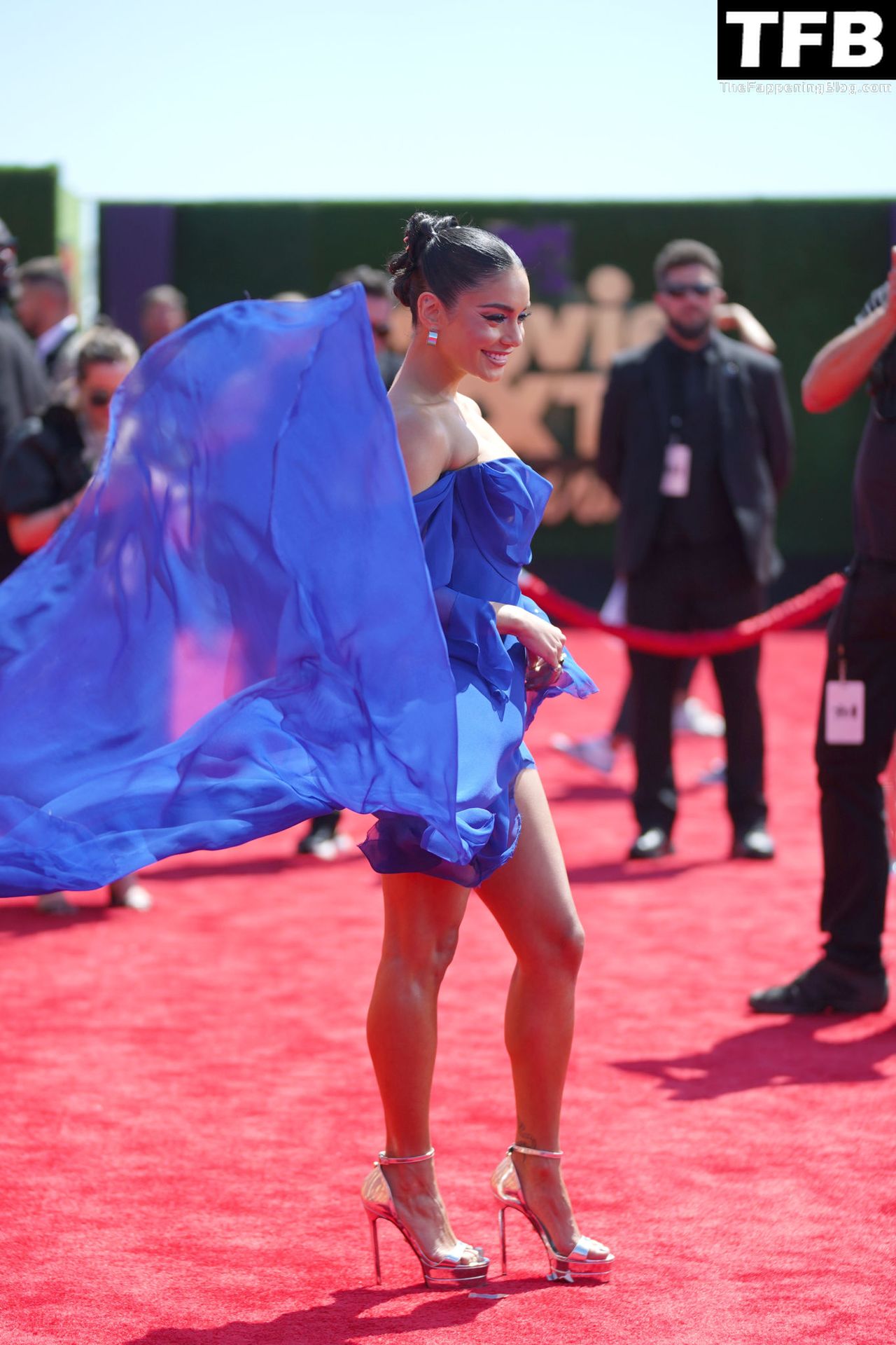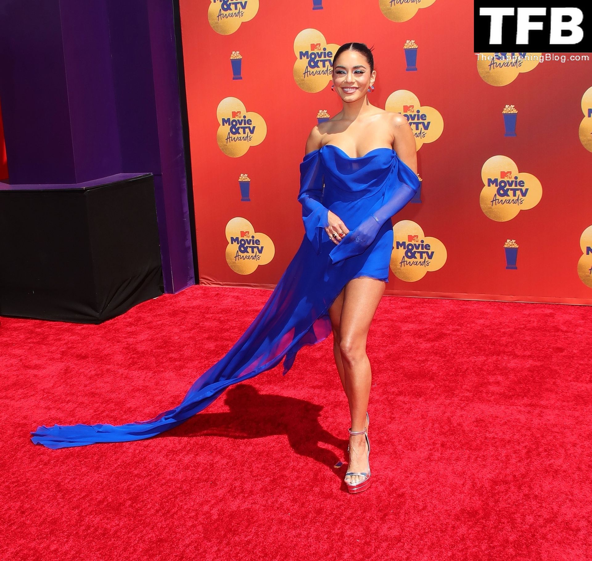 La star du Fappening Vanessa Hudgens pose en robe bleue sur le tapis rouge des MTV Movie & TV Awards au Barker Hangar à Santa Monica, le 05/06/2022.