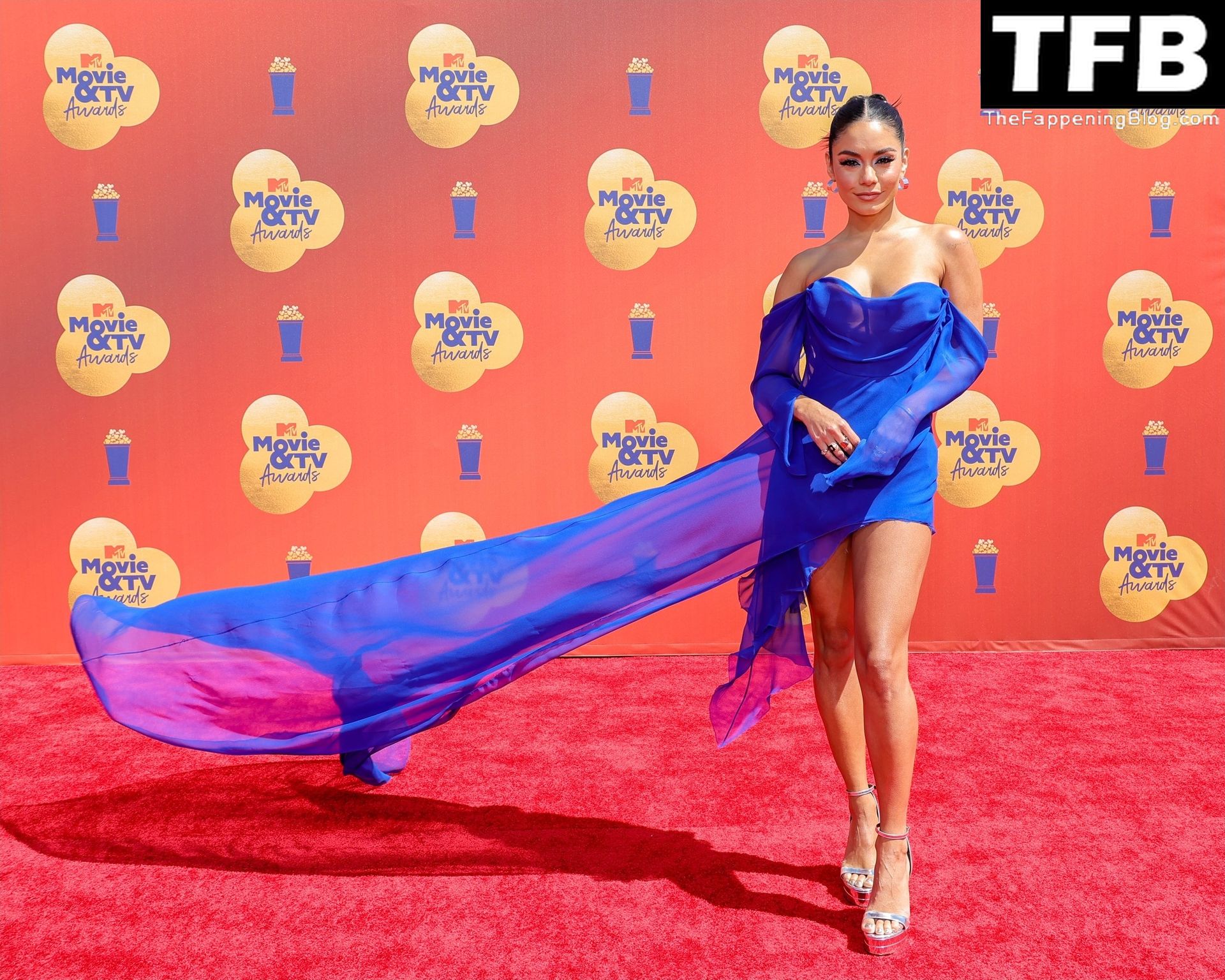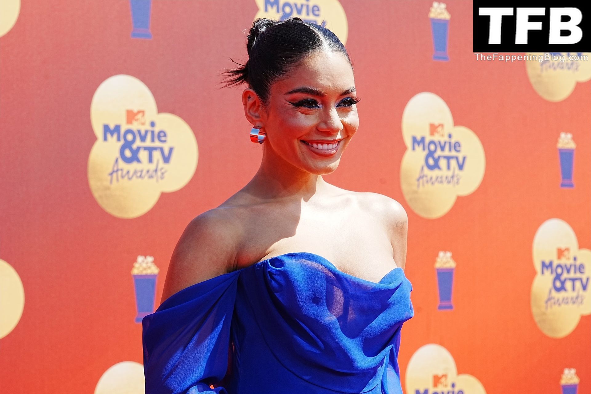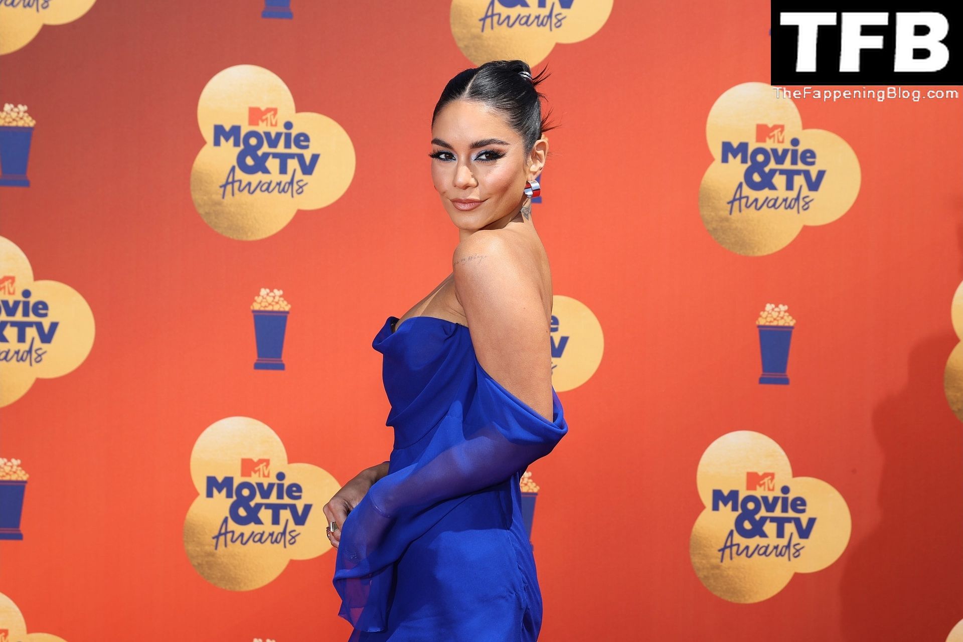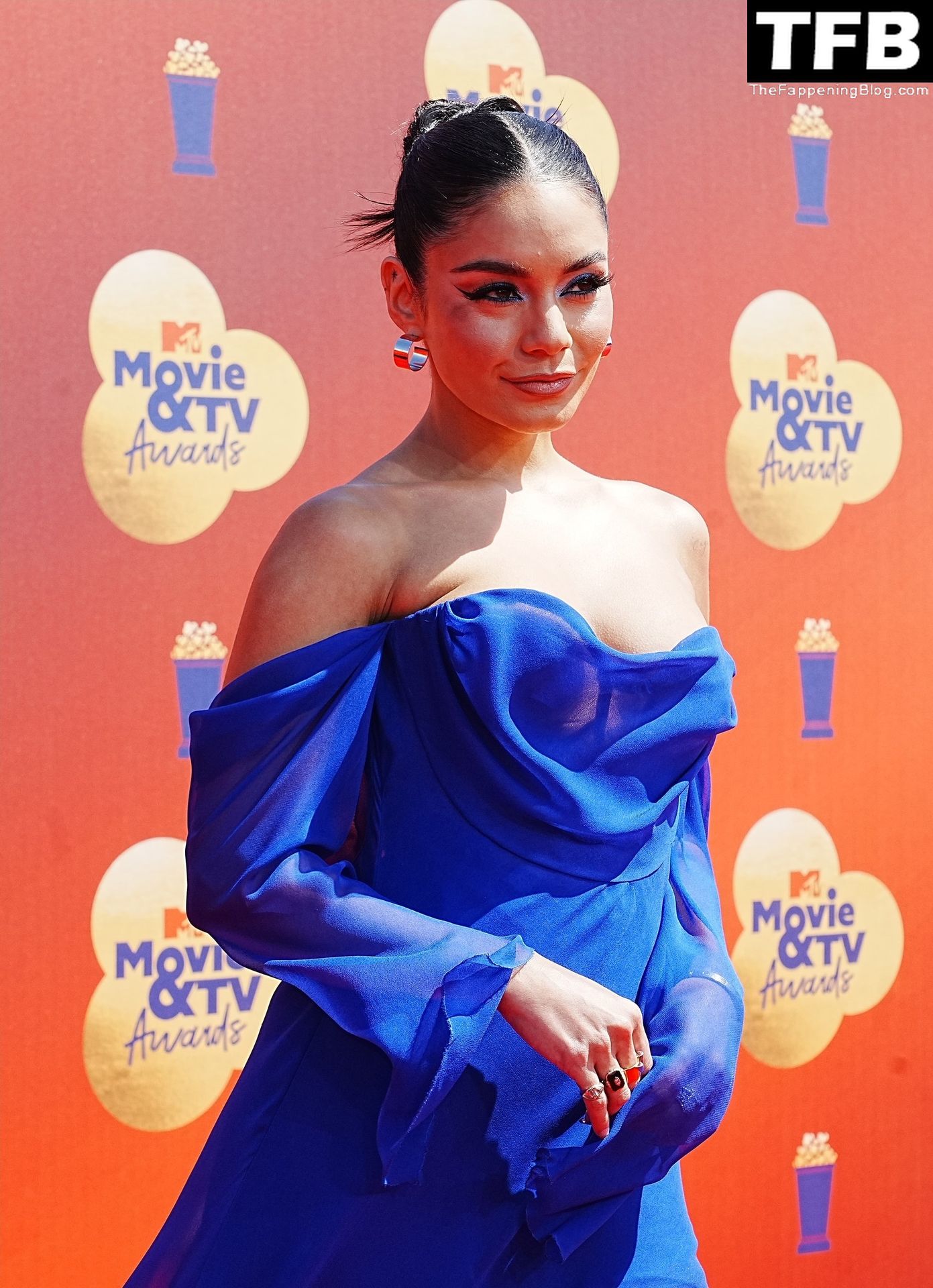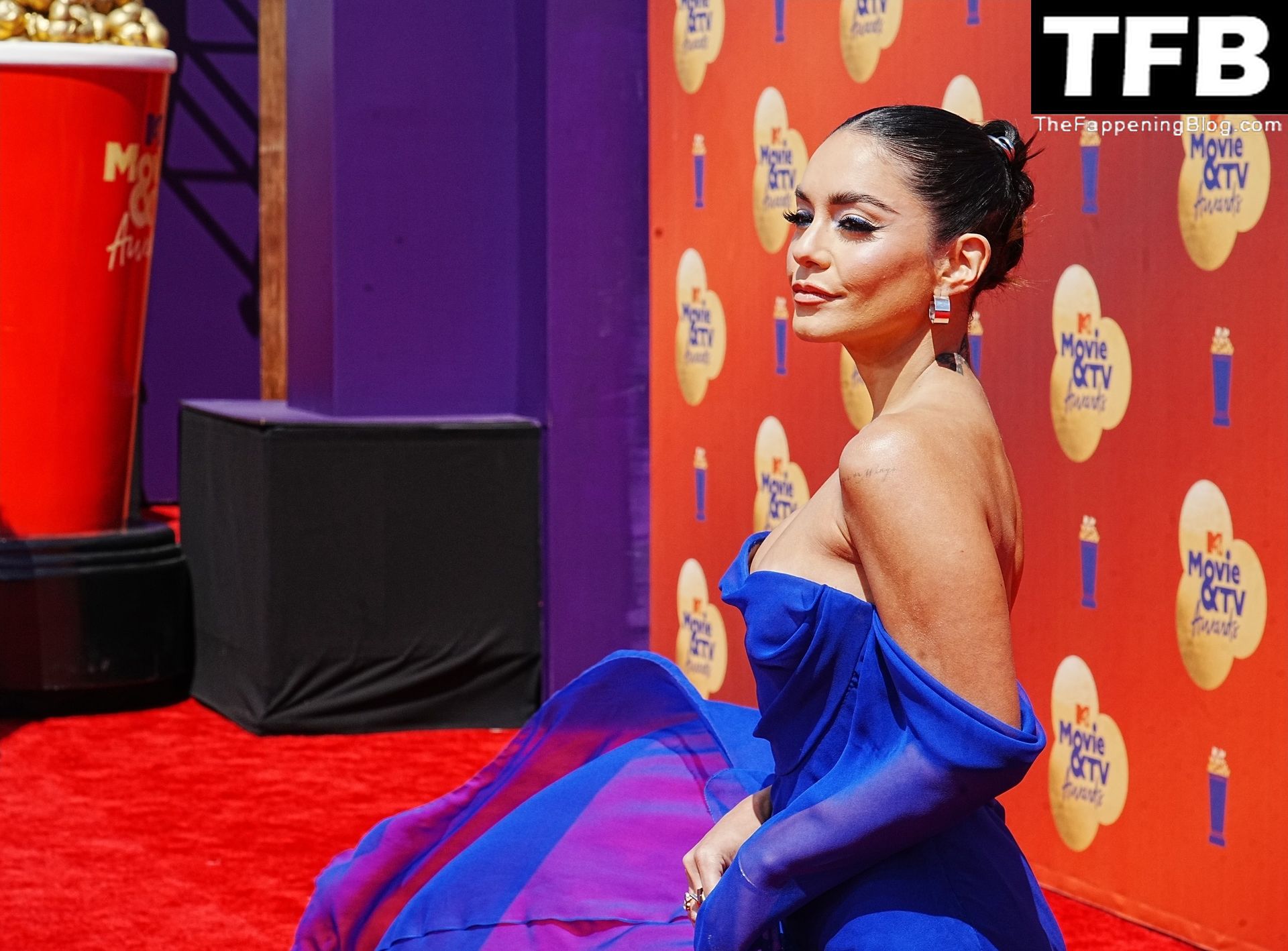 La star du Fappening Vanessa Hudgens pose en robe bleue sur le tapis rouge des MTV Movie & TV Awards au Barker Hangar à Santa Monica, le 05/06/2022.