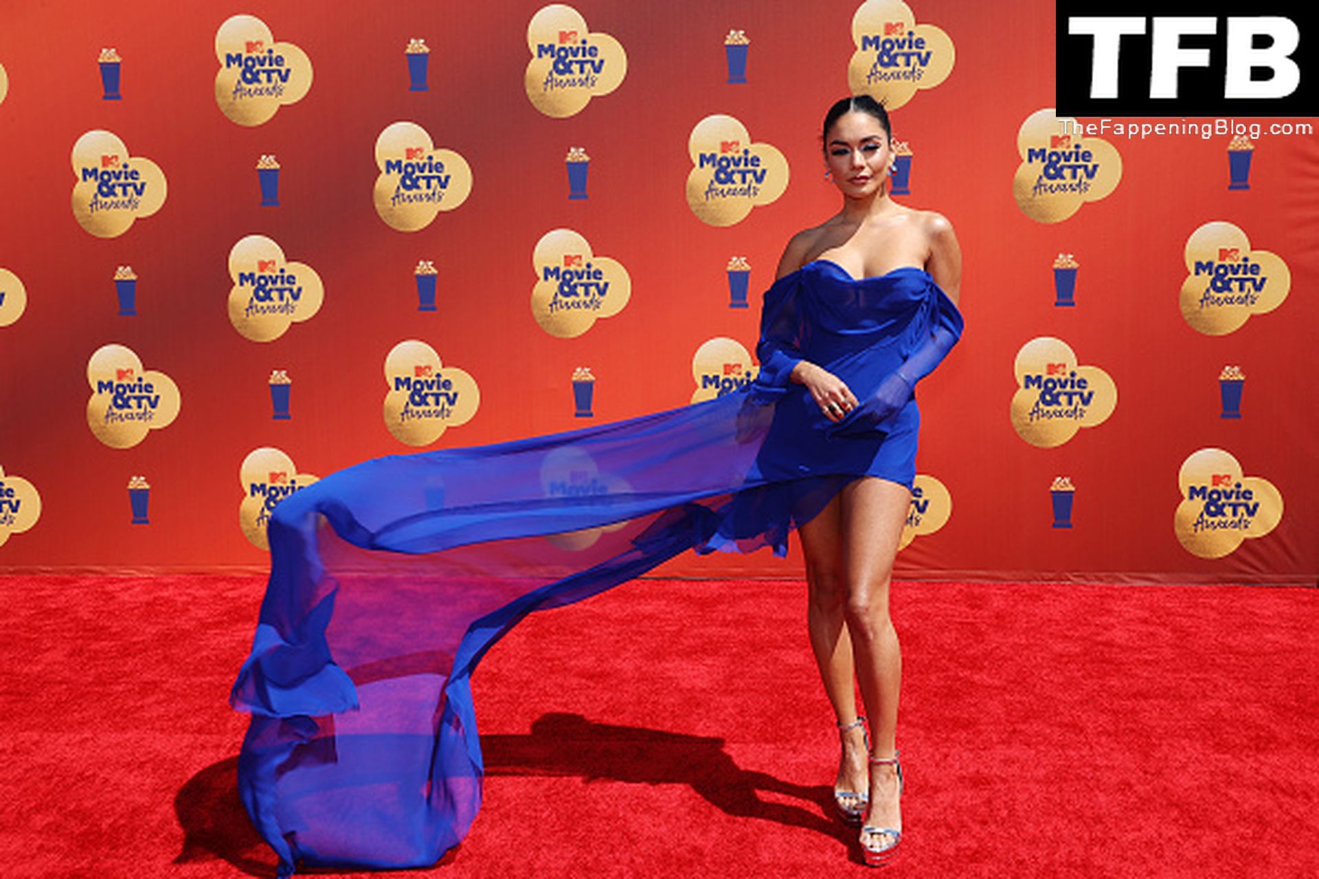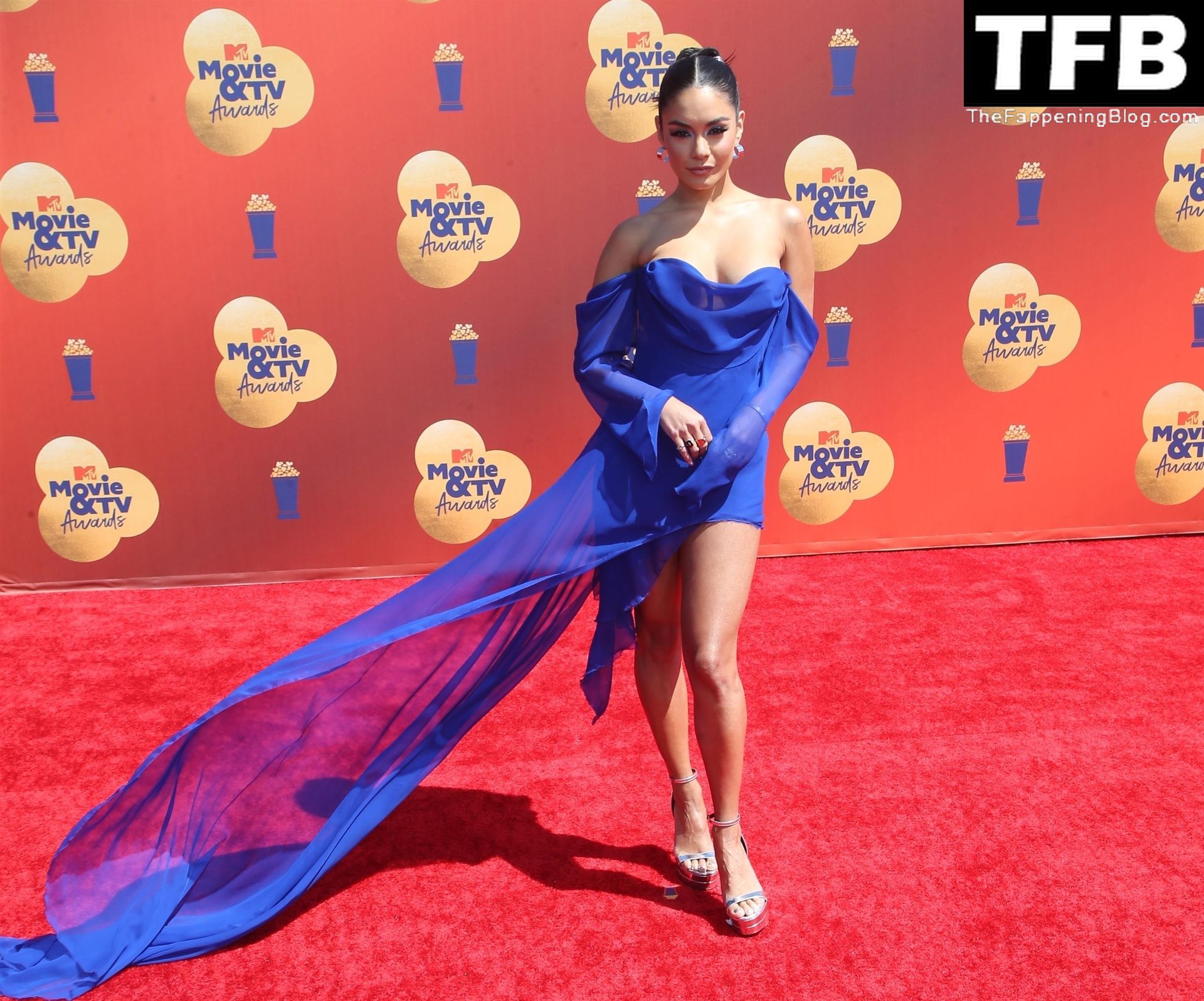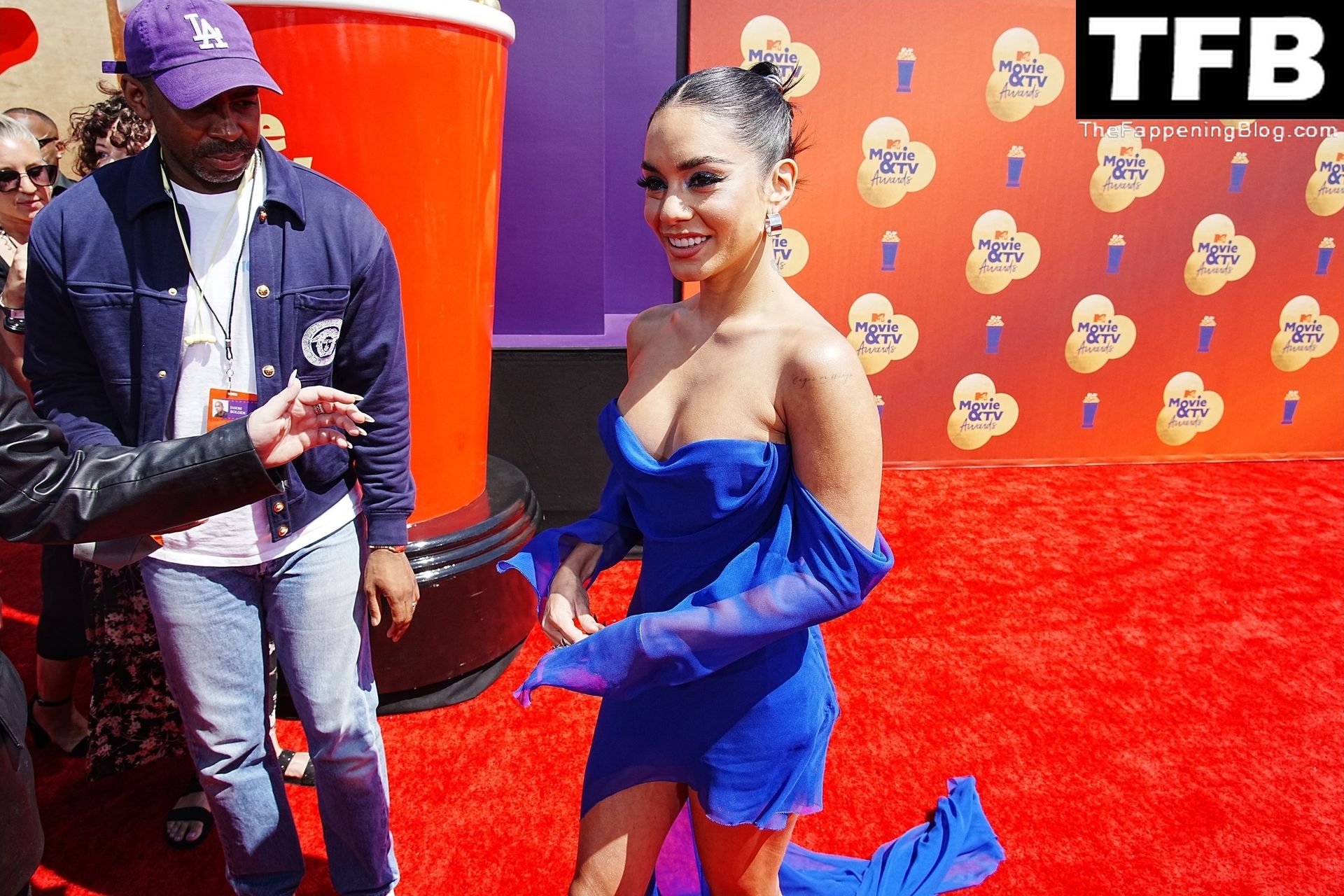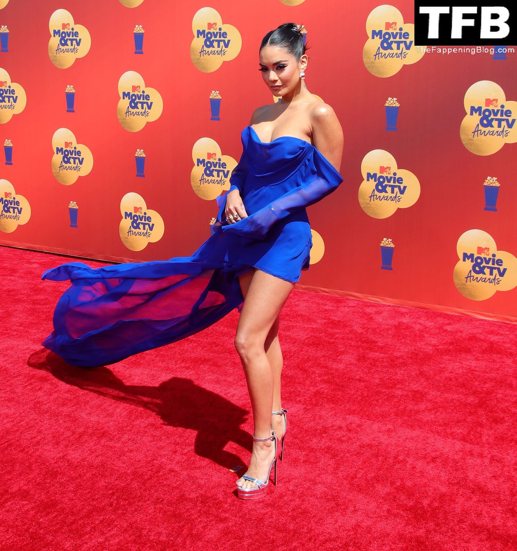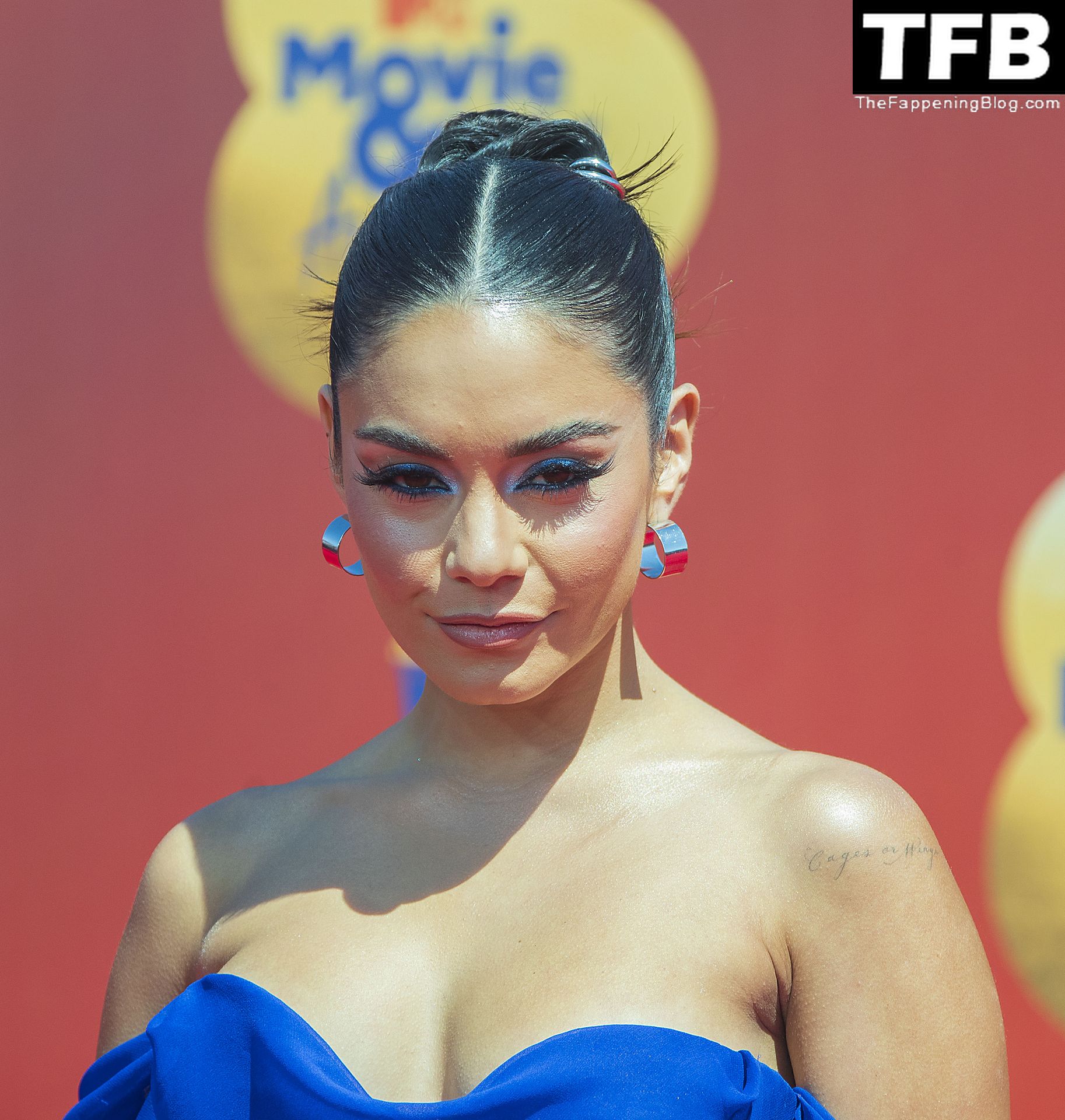 La star du Fappening Vanessa Hudgens pose en robe bleue sur le tapis rouge des MTV Movie & TV Awards au Barker Hangar à Santa Monica, le 05/06/2022.