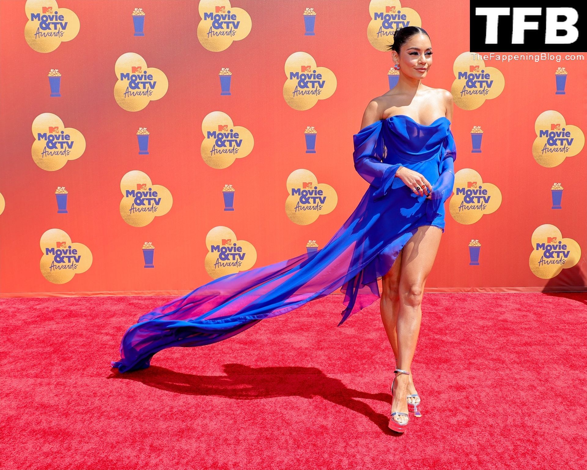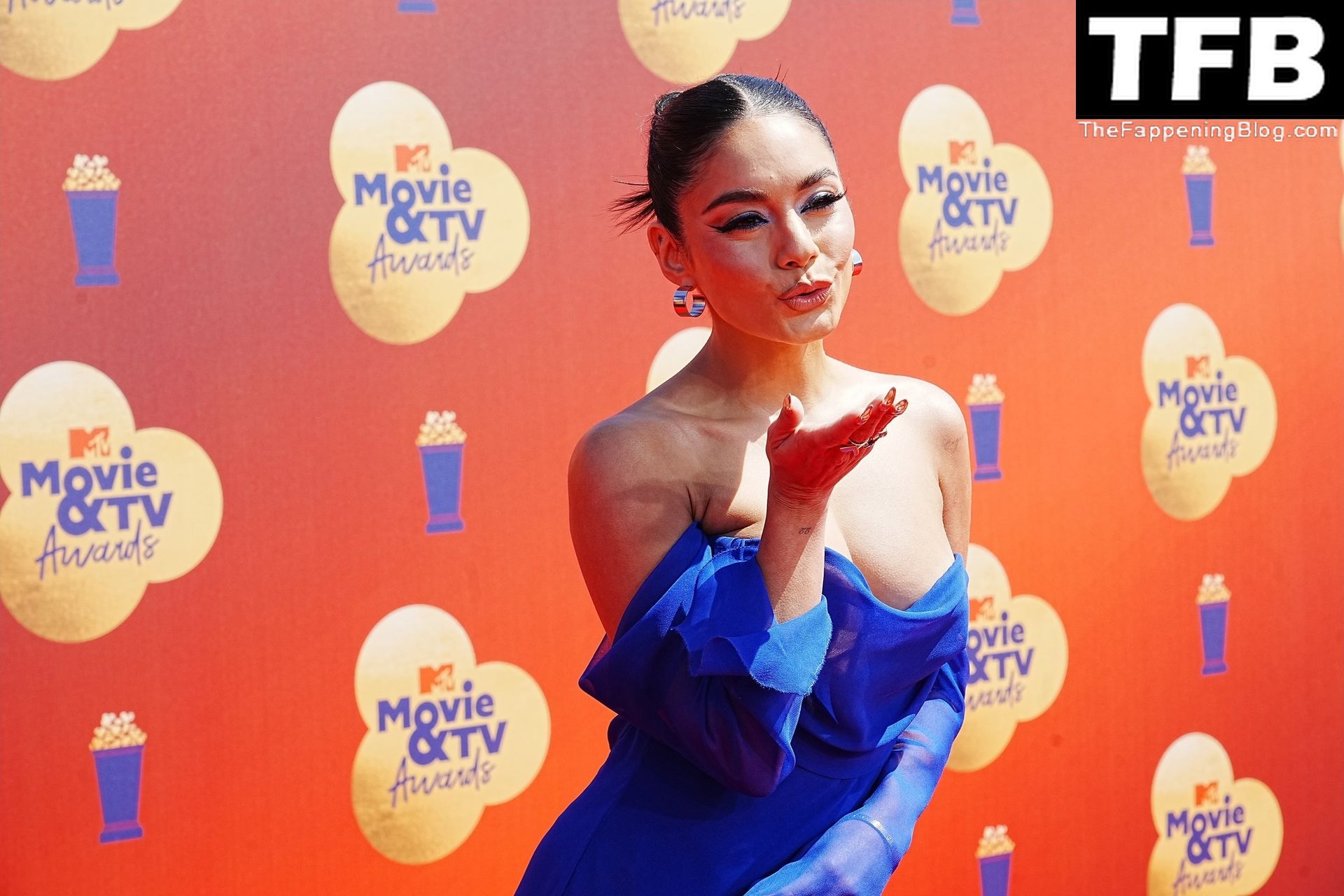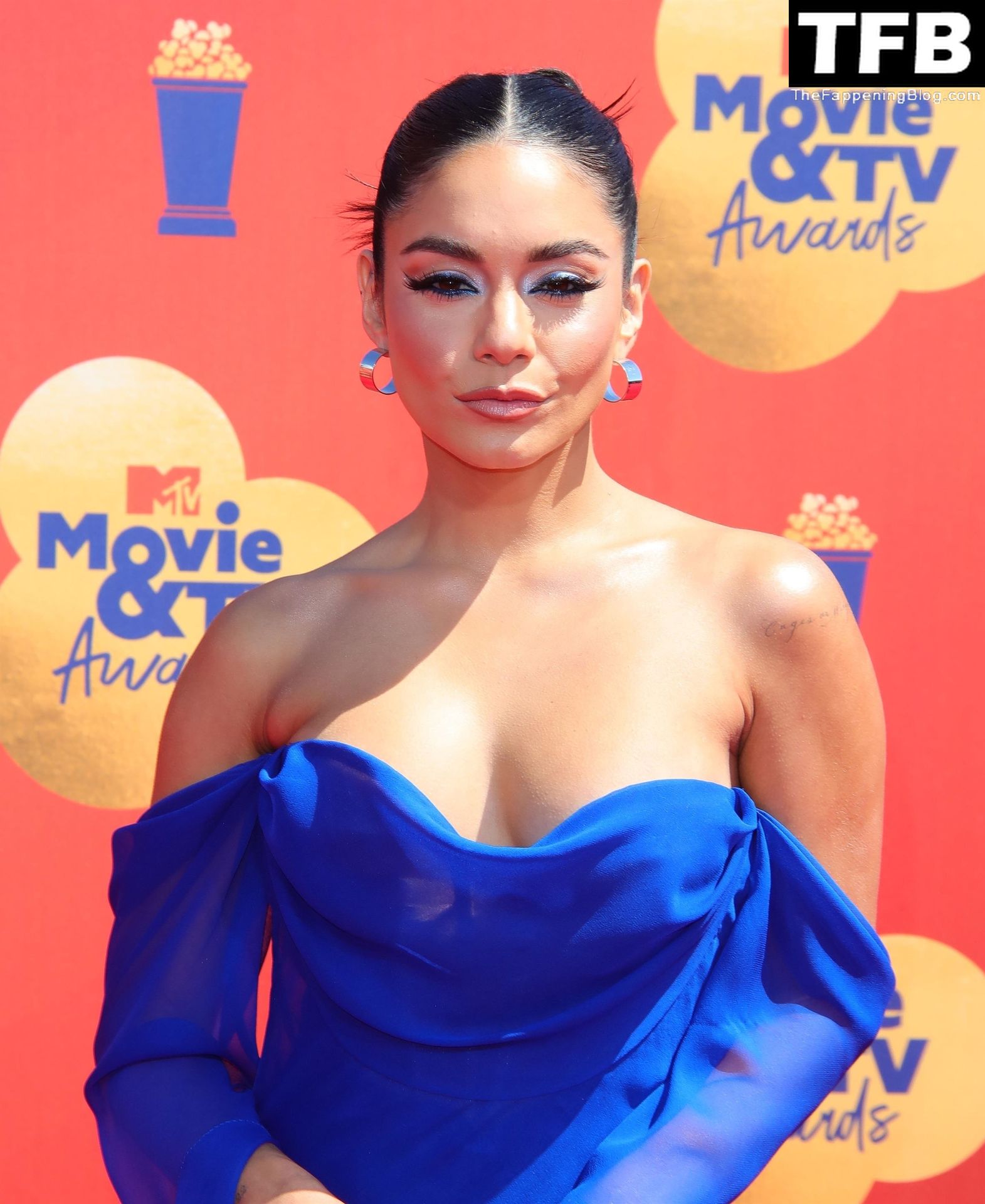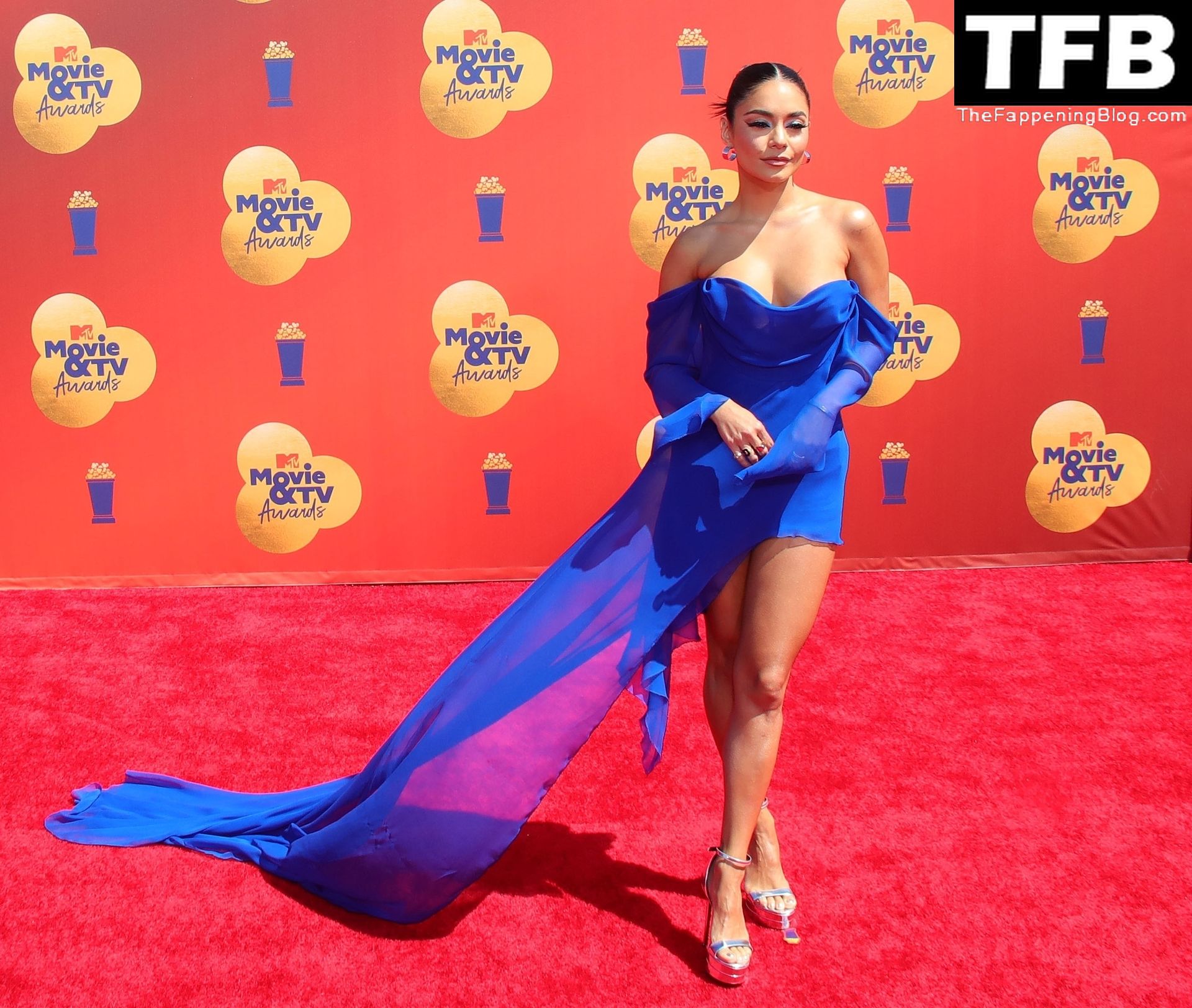 La star du Fappening Vanessa Hudgens pose en robe bleue sur le tapis rouge des MTV Movie & TV Awards au Barker Hangar à Santa Monica, le 05/06/2022.