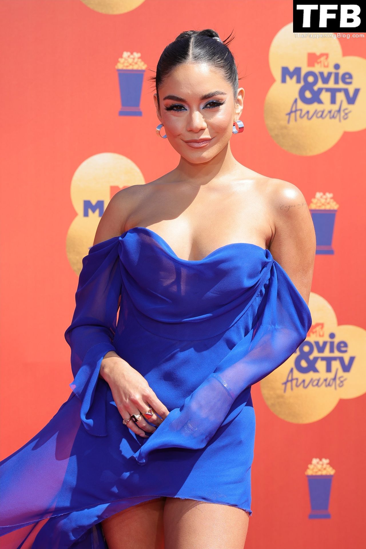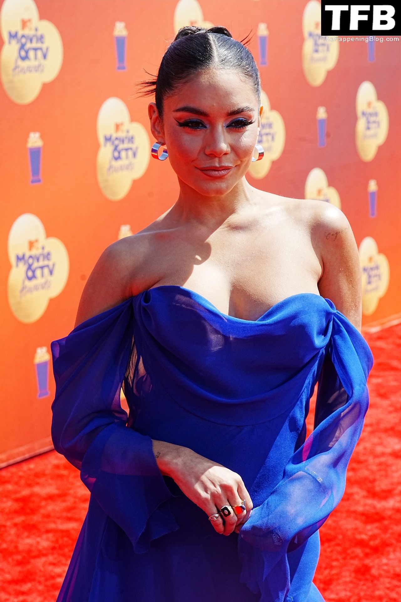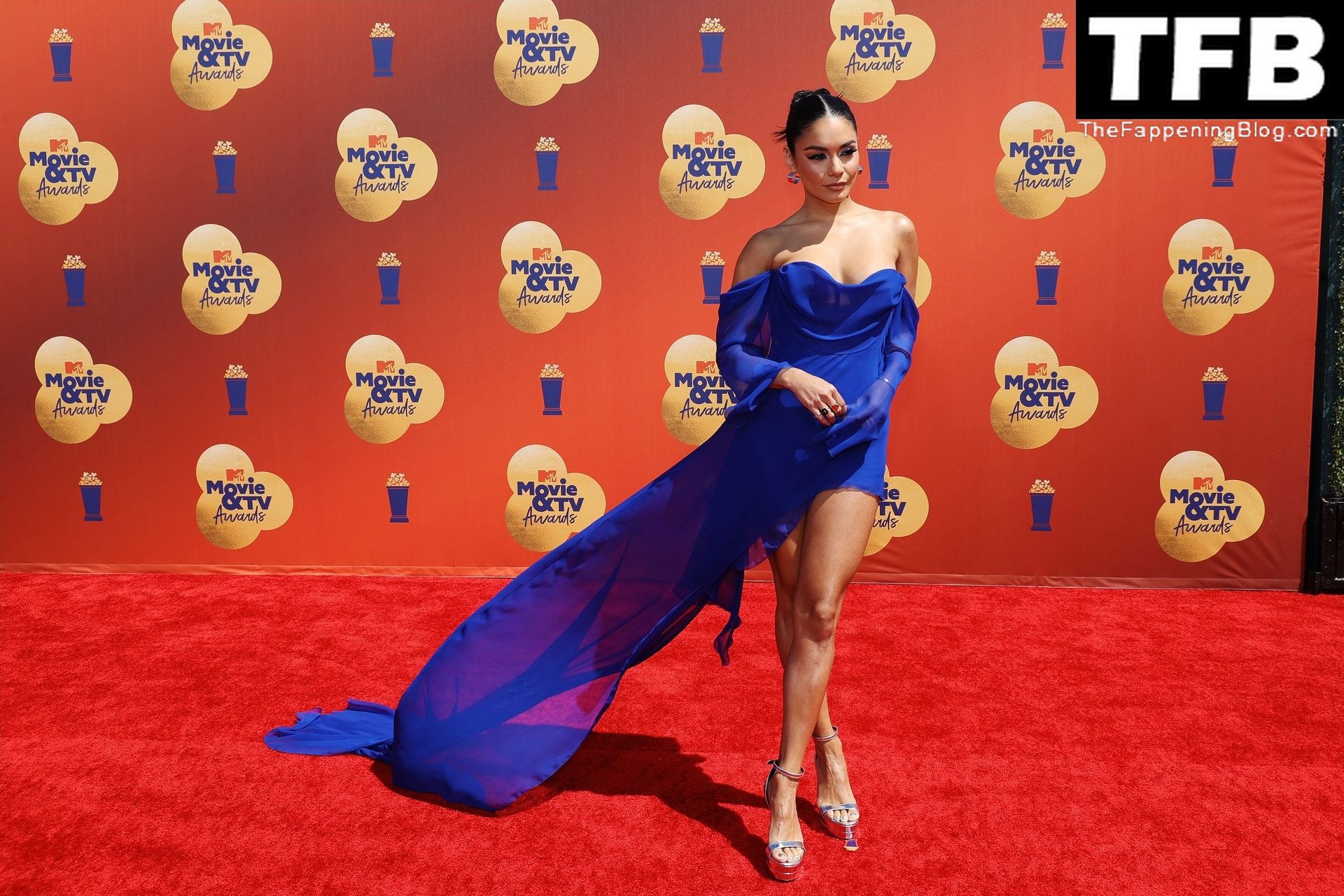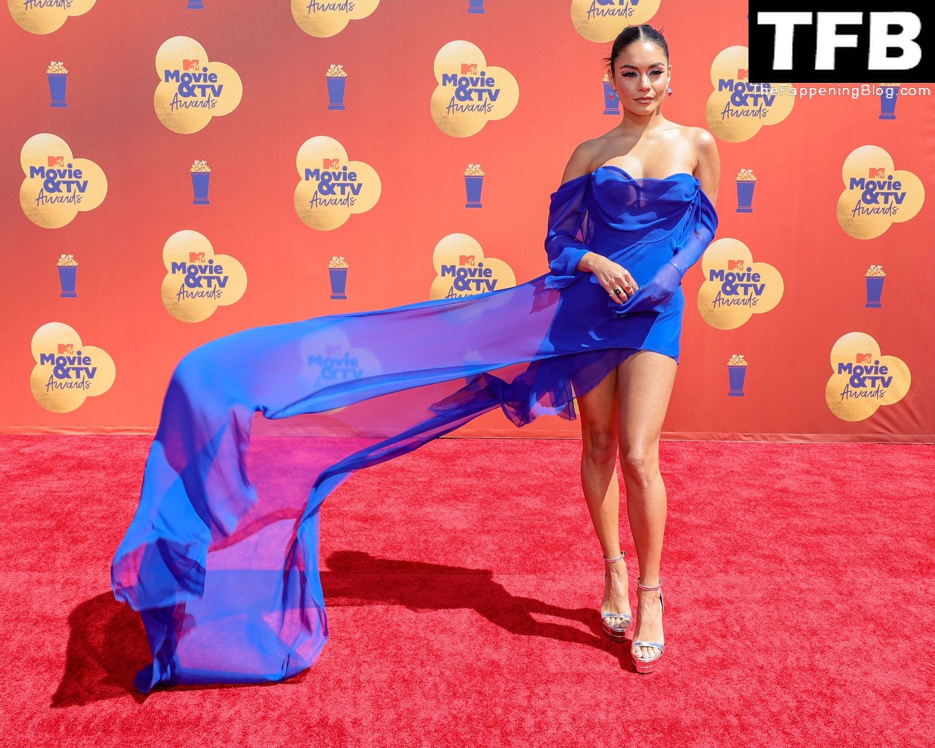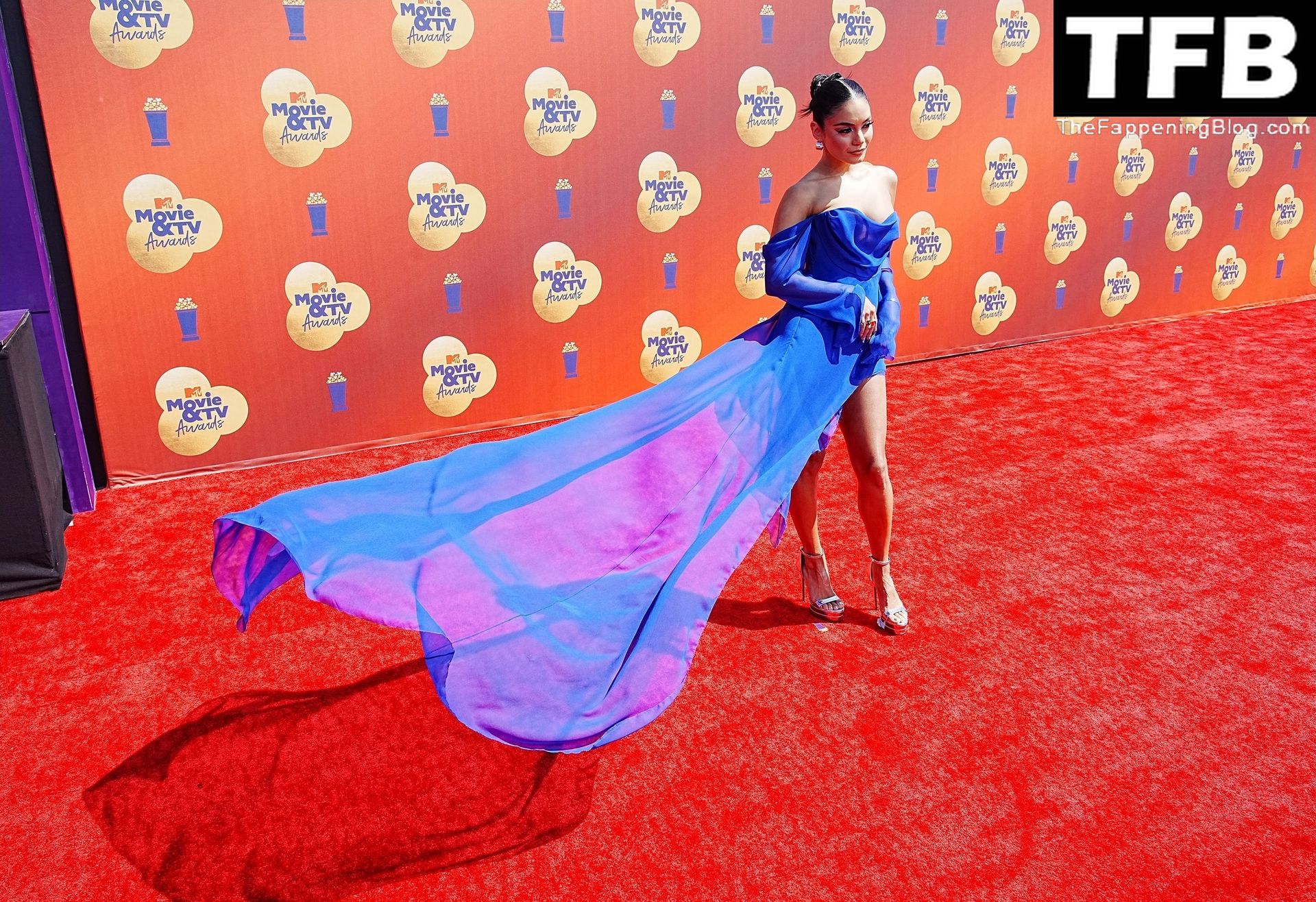 La star du Fappening Vanessa Hudgens pose en robe bleue sur le tapis rouge des MTV Movie & TV Awards au Barker Hangar à Santa Monica, le 05/06/2022.